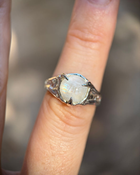Rainbow Moonstone Sterling Silver Textured Ring - size 7.25 US