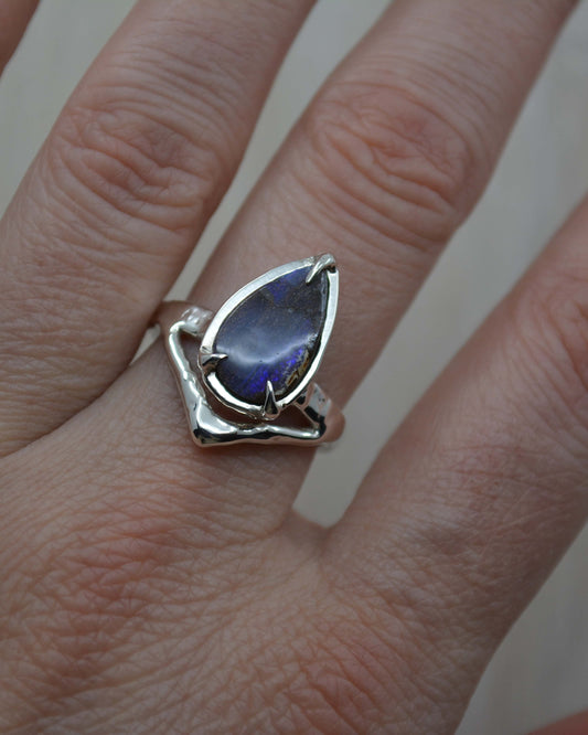 Pear Boulder Opal Sterling Silver Wishbone Ring - size 7 US