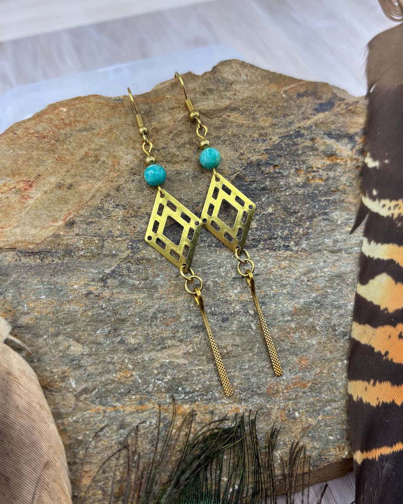 These gorgeous Amazonite Diamond Brass Earrings are made using brass charms and beads.