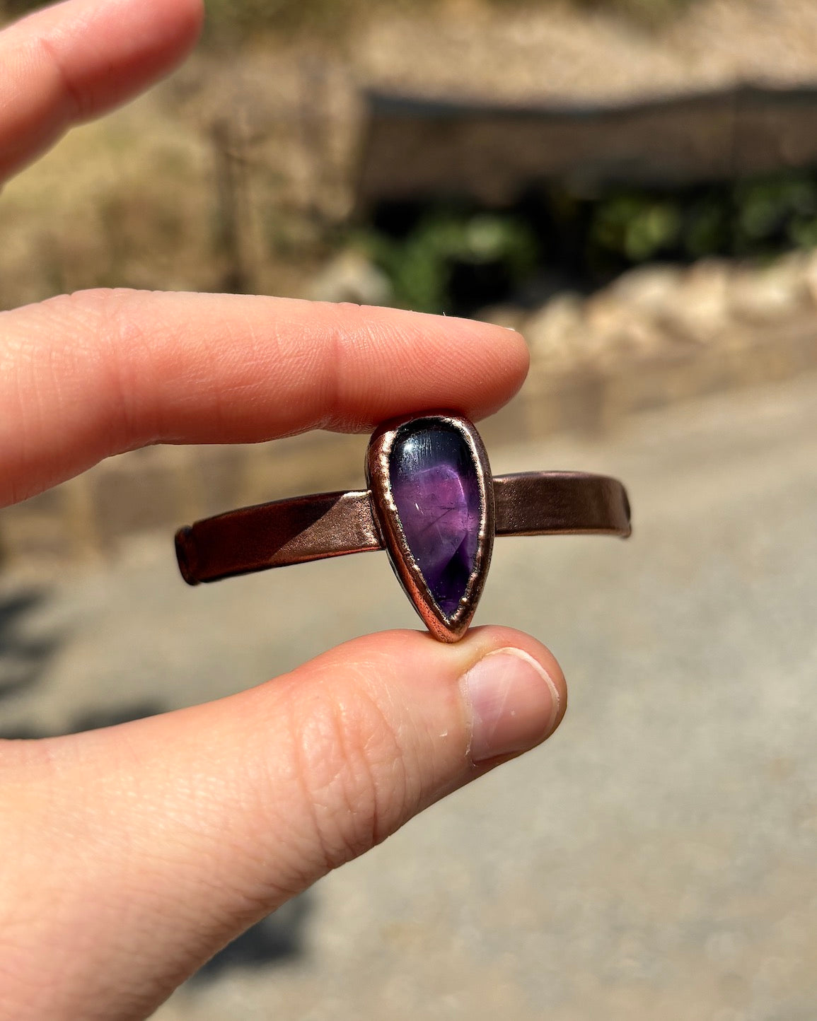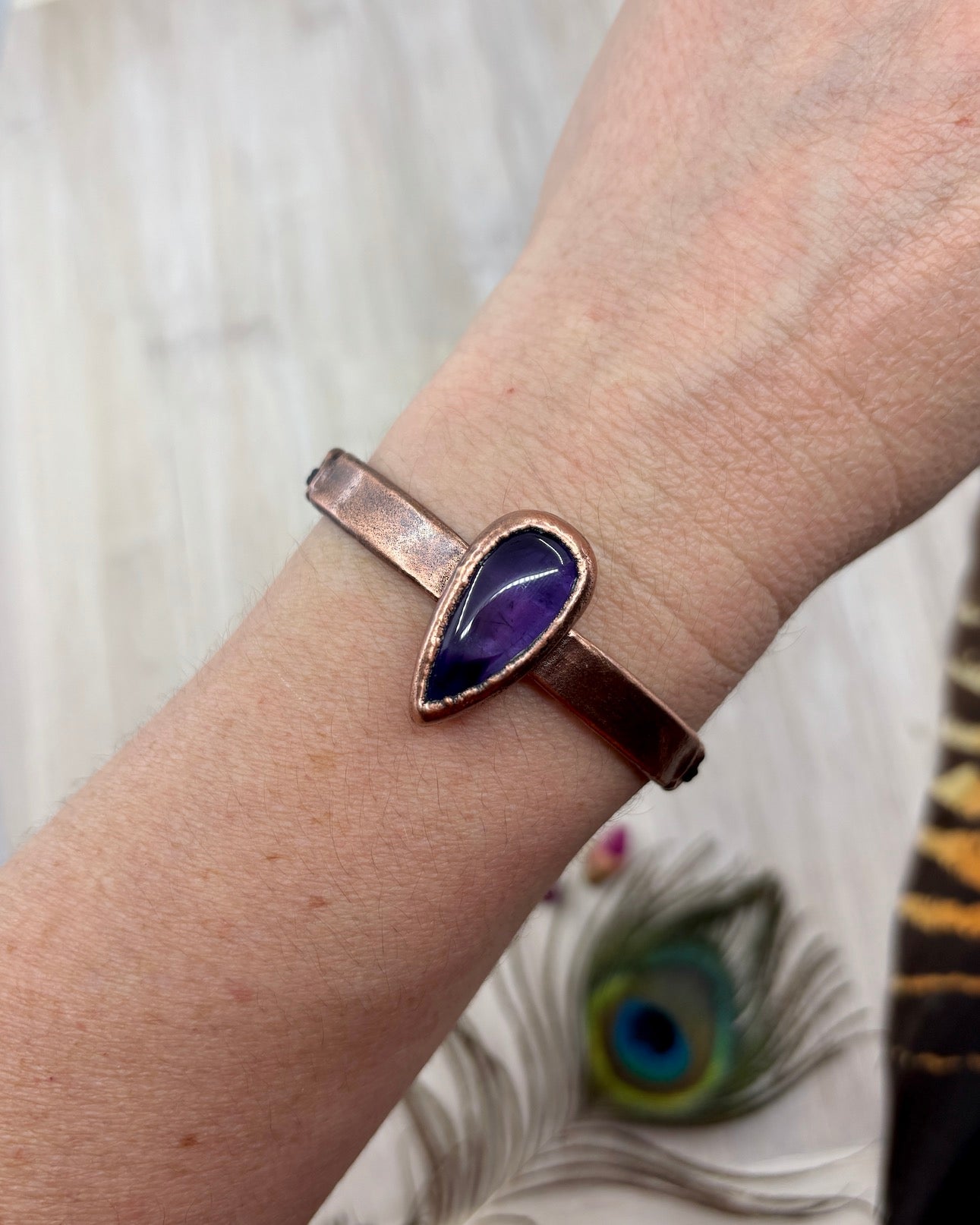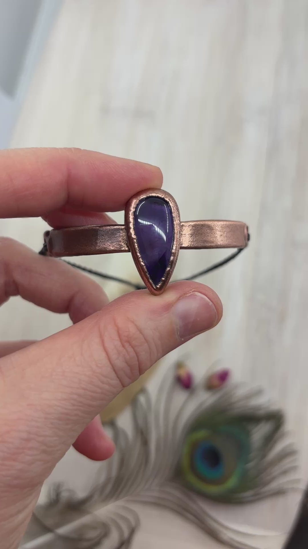 This copper bracelet features a deep Amethyst. It has been copper plated using the art of electroforming & comes with an adjustable macrame strap.