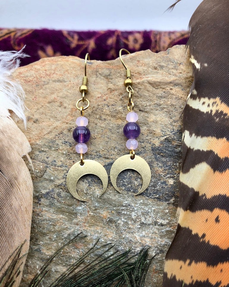 These earrings are made with brass pieces, adorned with Amethyst and faceted glass beads.