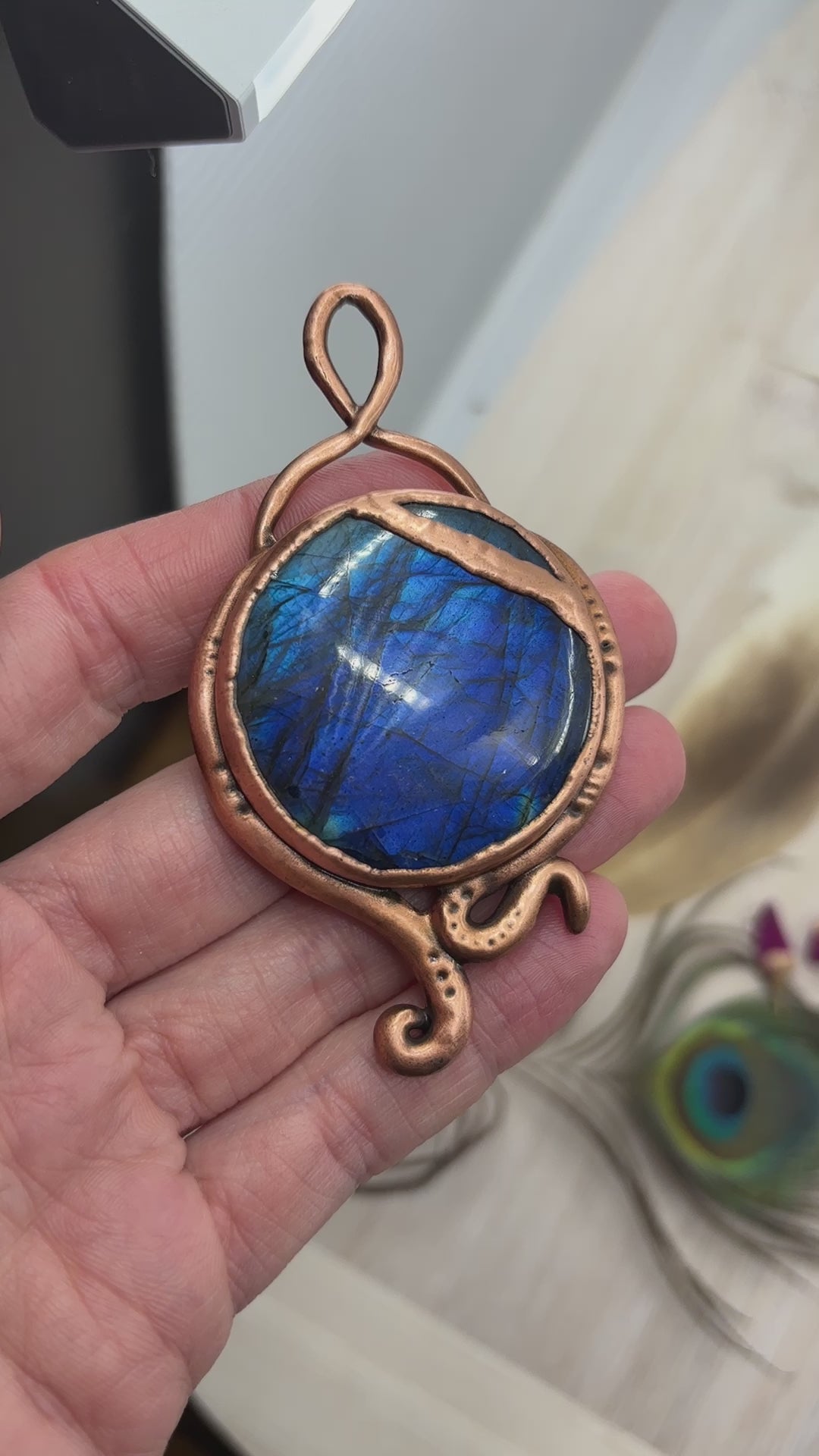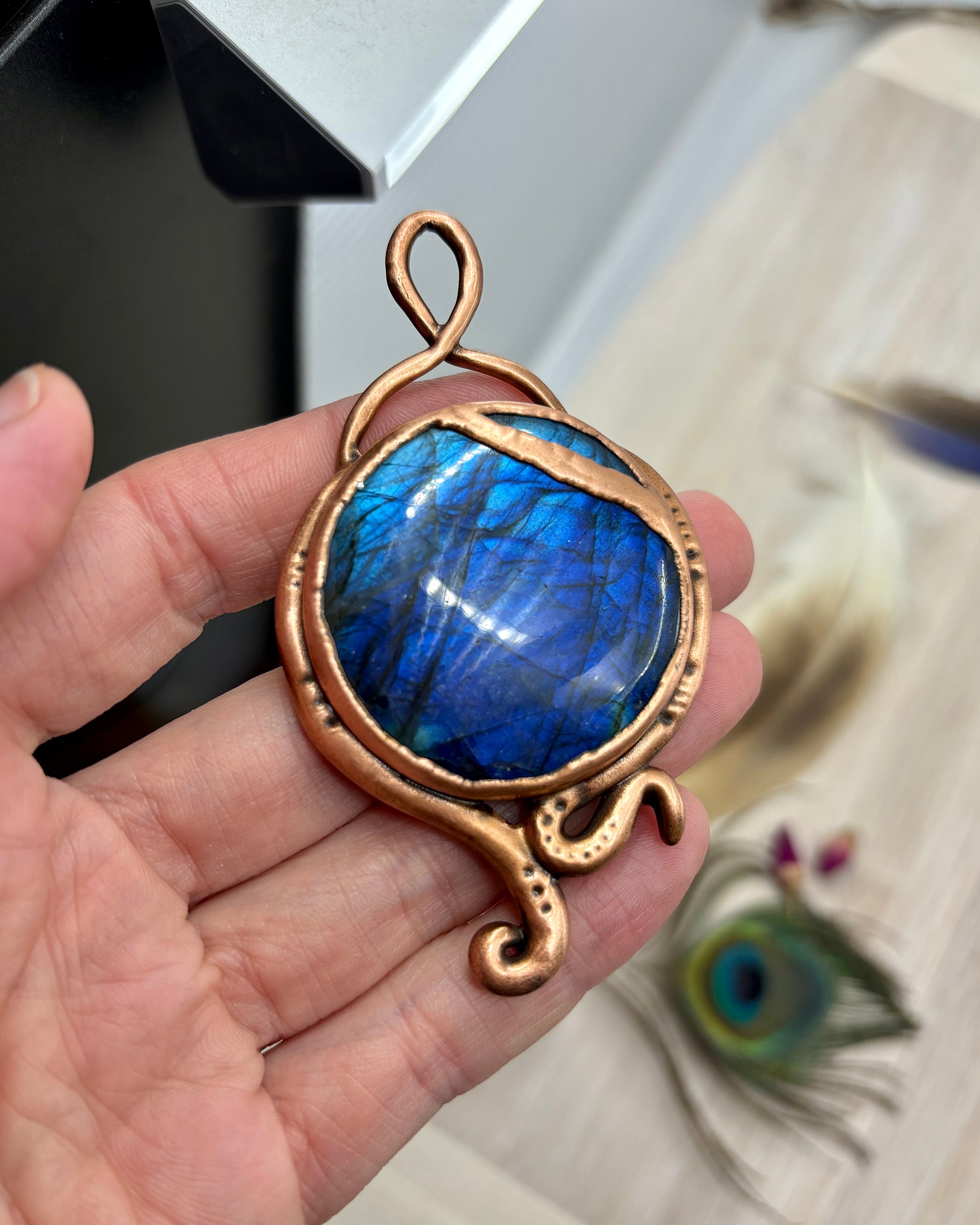 This blue Labradorite Pendant features a swirly clay design. It has been copper plated using the art of electroforming.