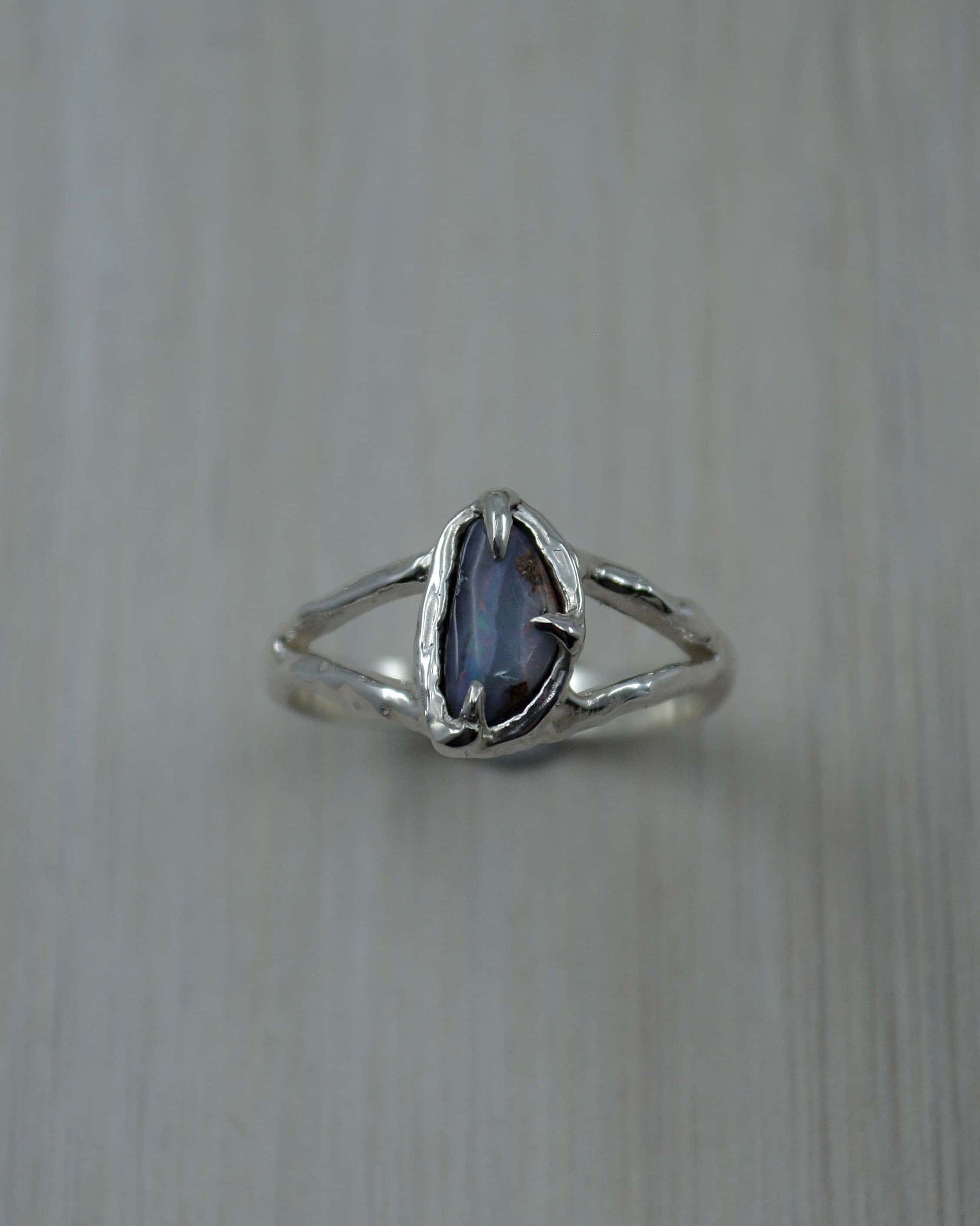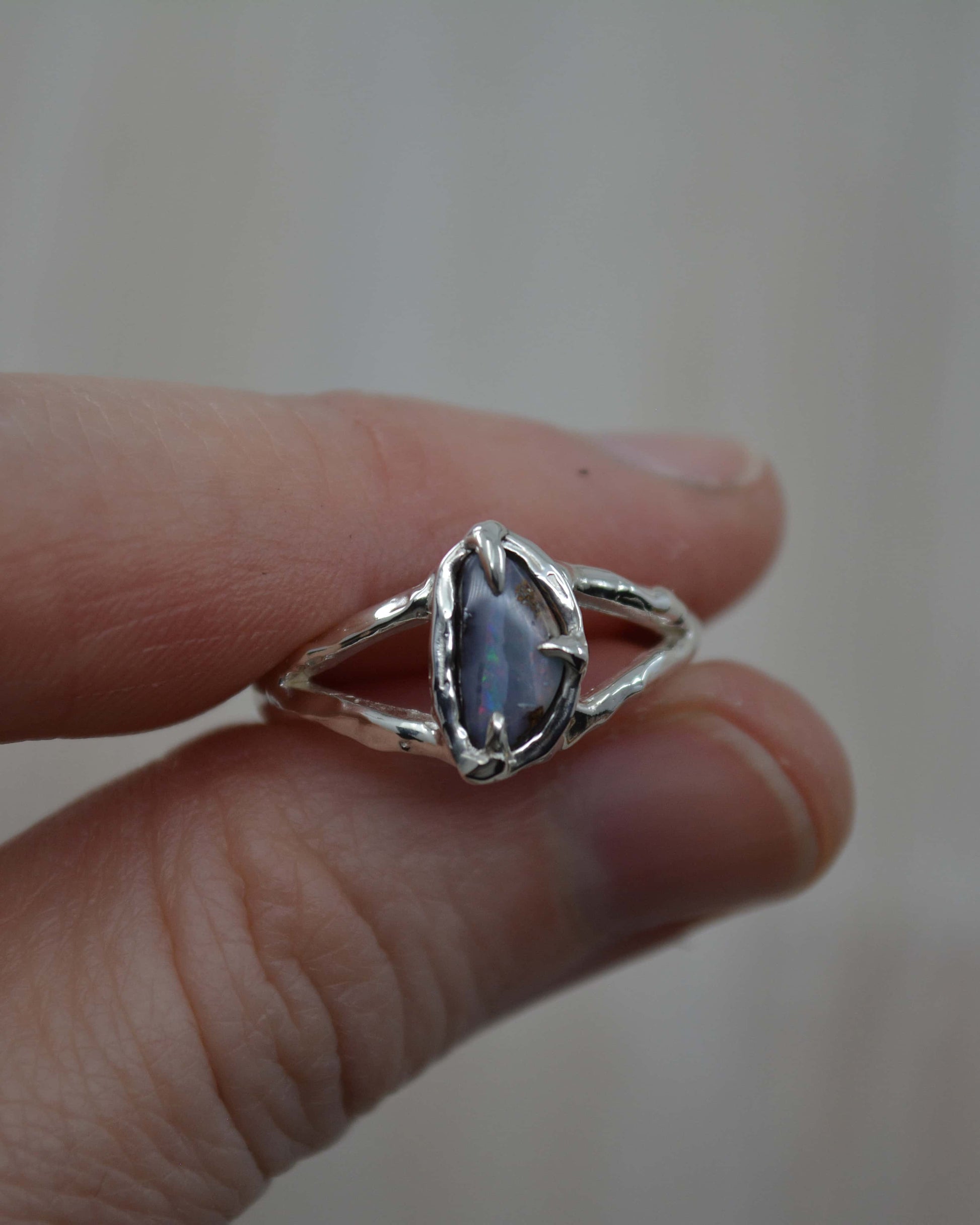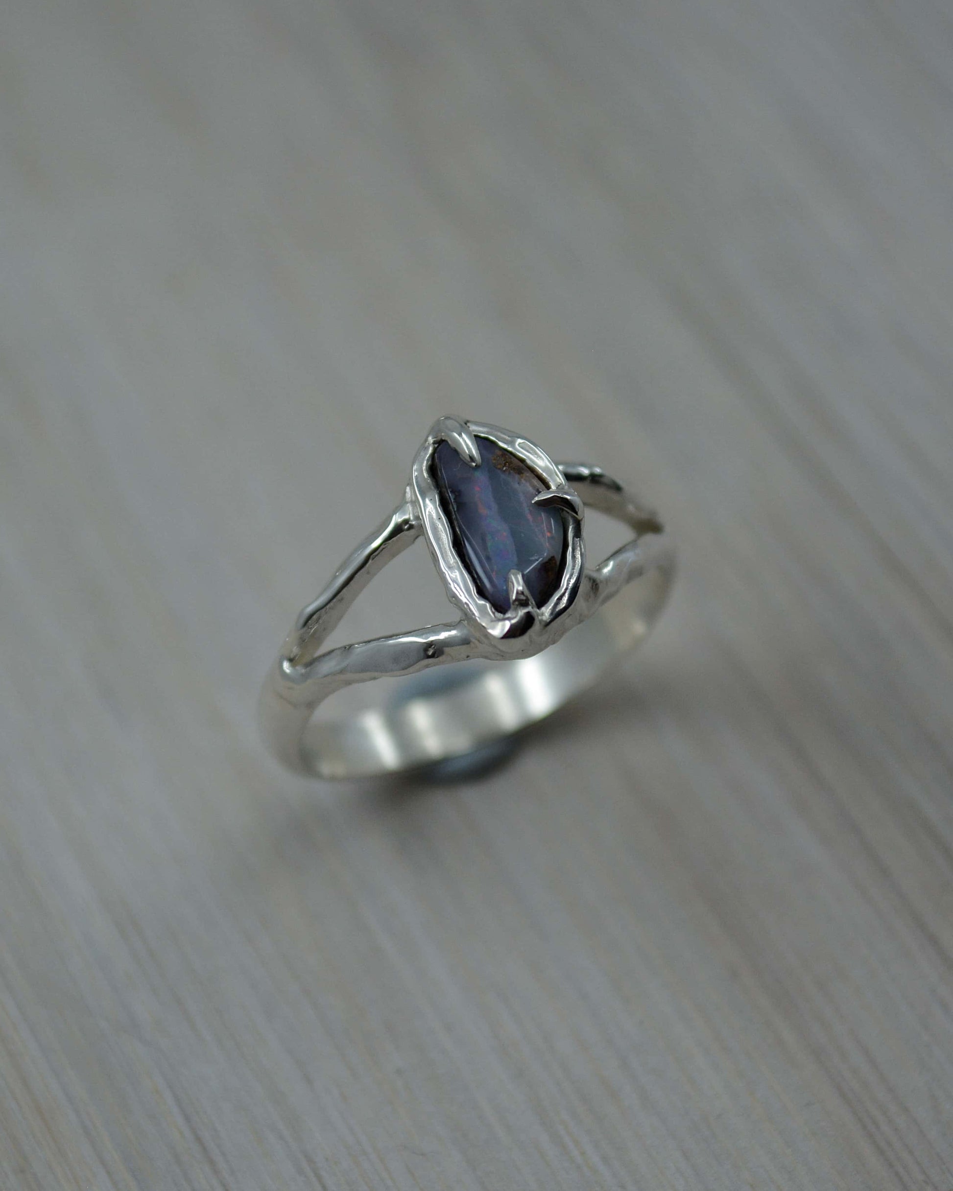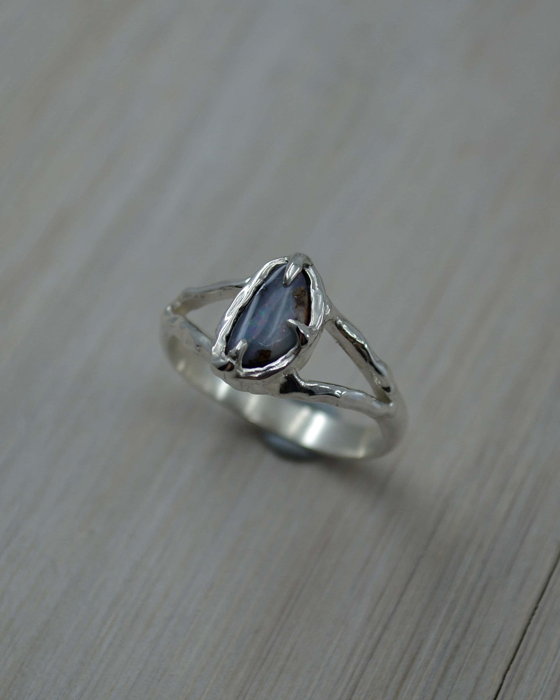 This Boulder Opal Sterling Silver Ring has been hand sculpted using the lost wax jewellery method & cast in solid sterling silver. It was created with the intention of a slight "wobble" effect on the band, giving its unique look.
