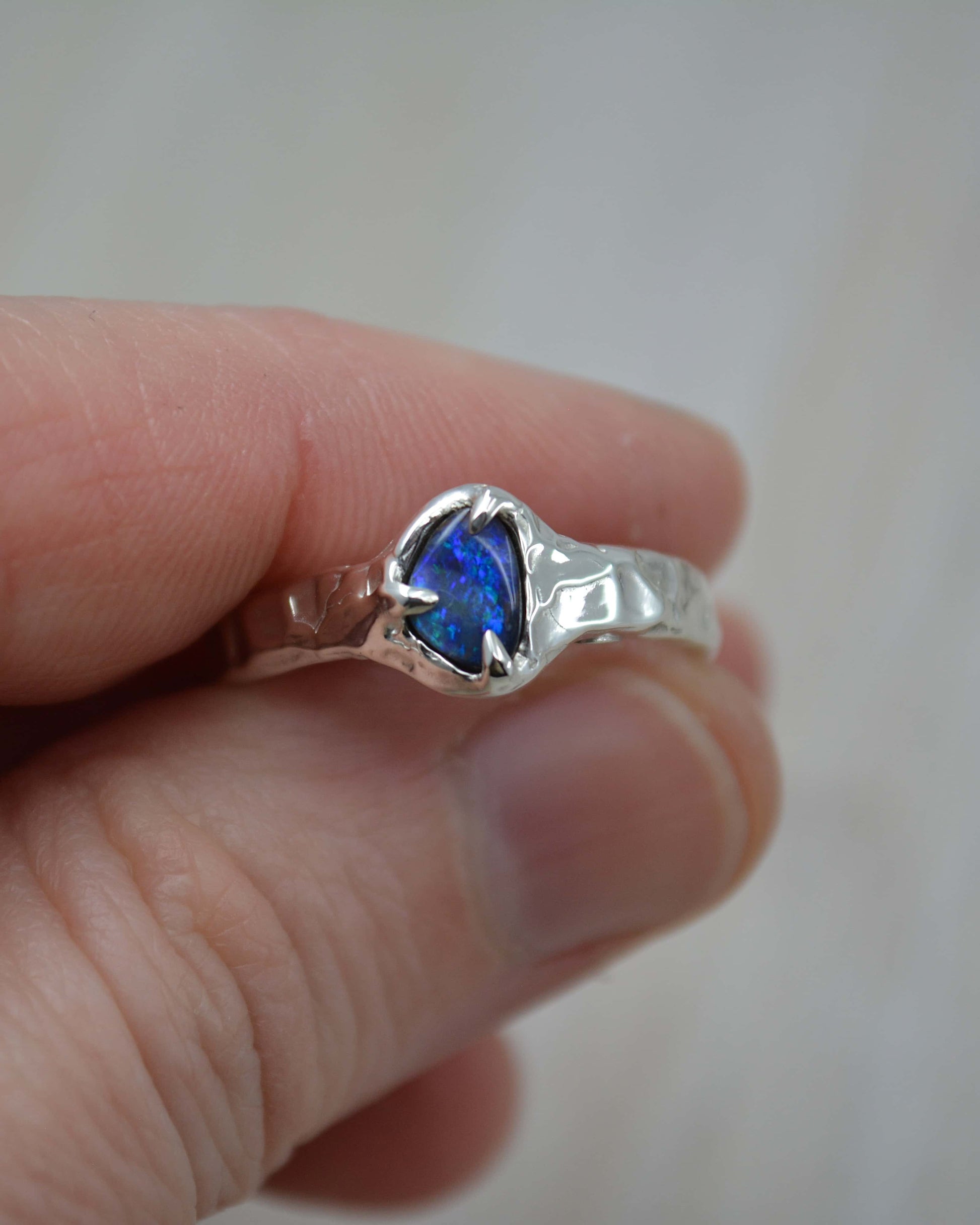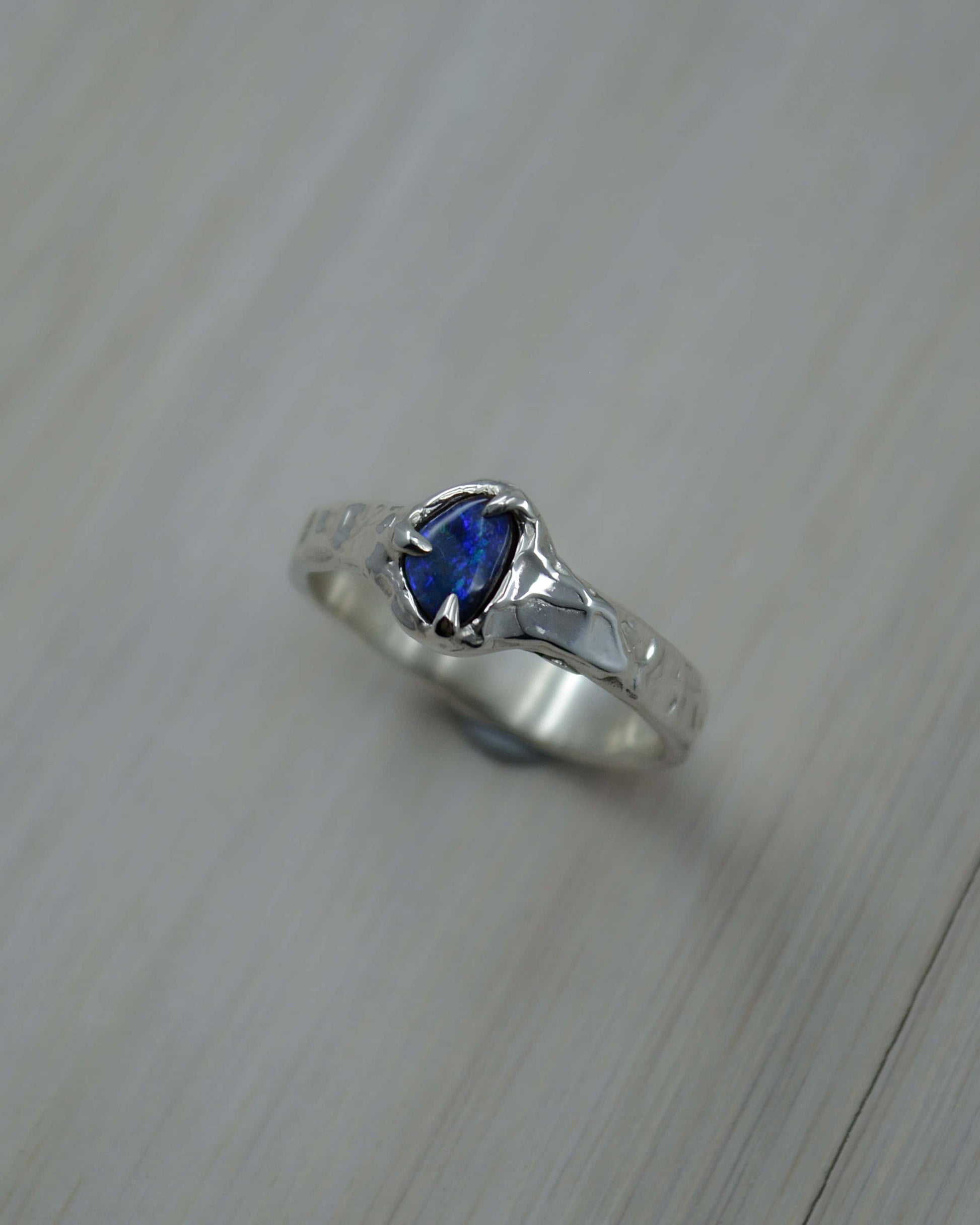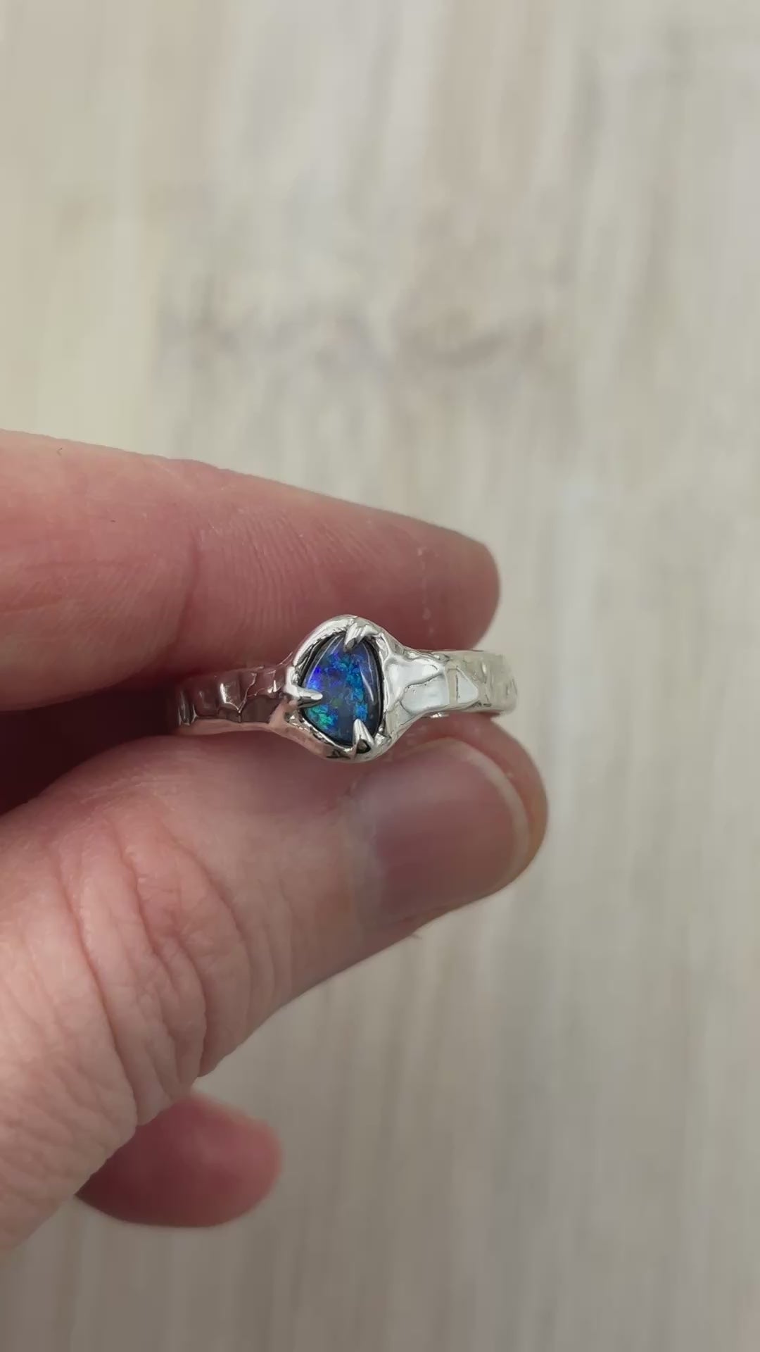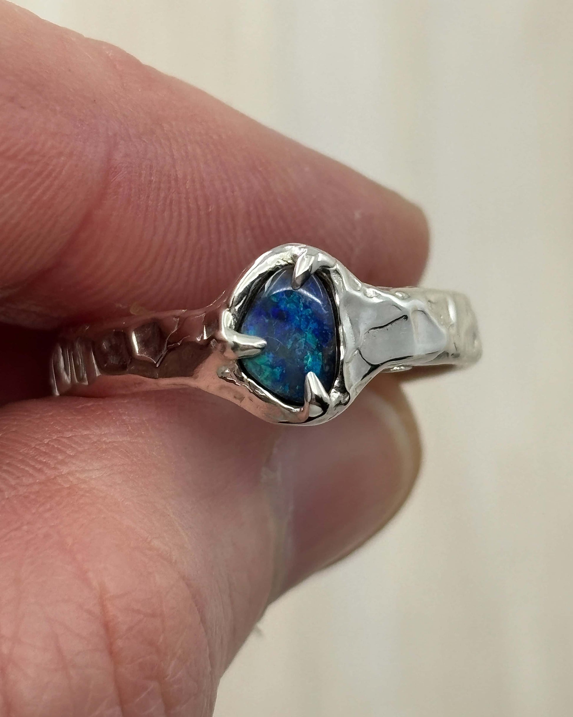 This gorgeous Boulder Opal Sterling Silver Textured Ring has been hand sculpted using the lost wax jewellery method & cast in solid sterling silver. It was created with the intention of a wavy effect on the band, giving its unique look.