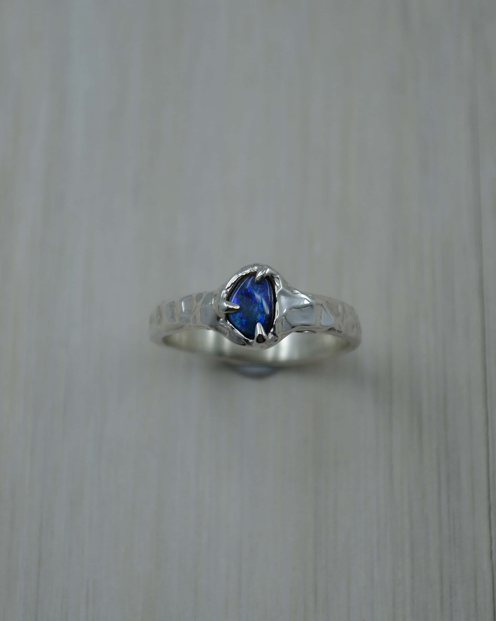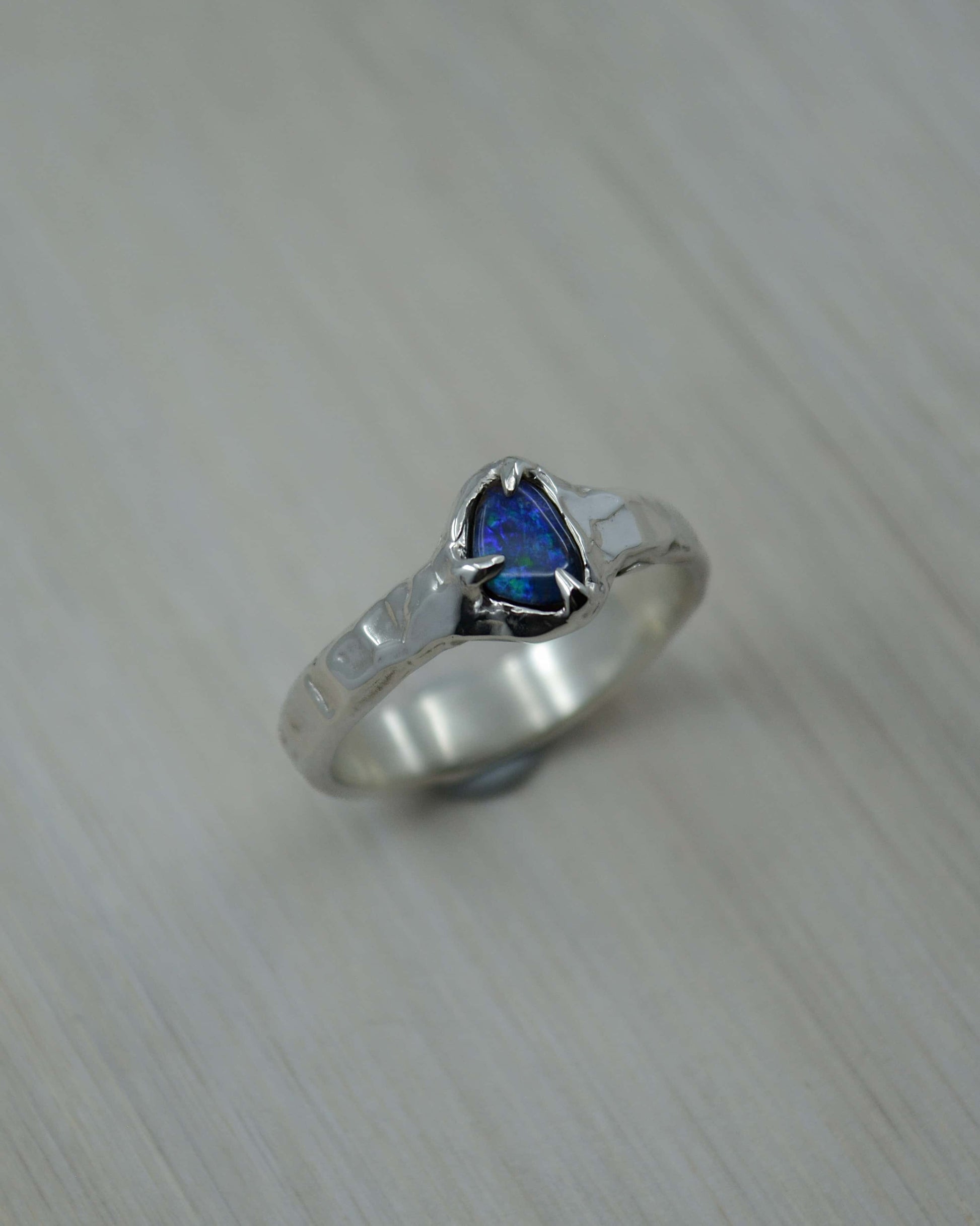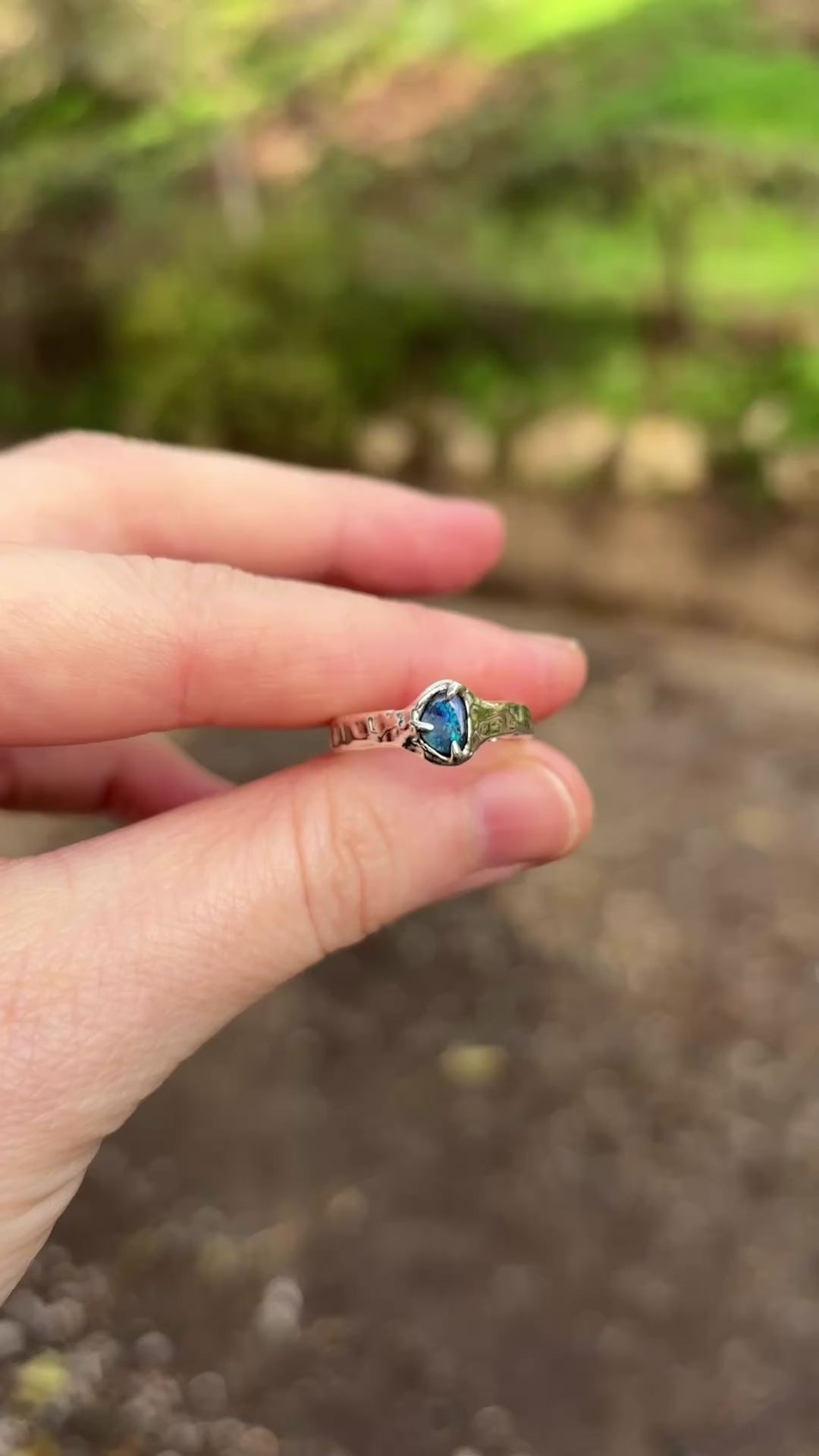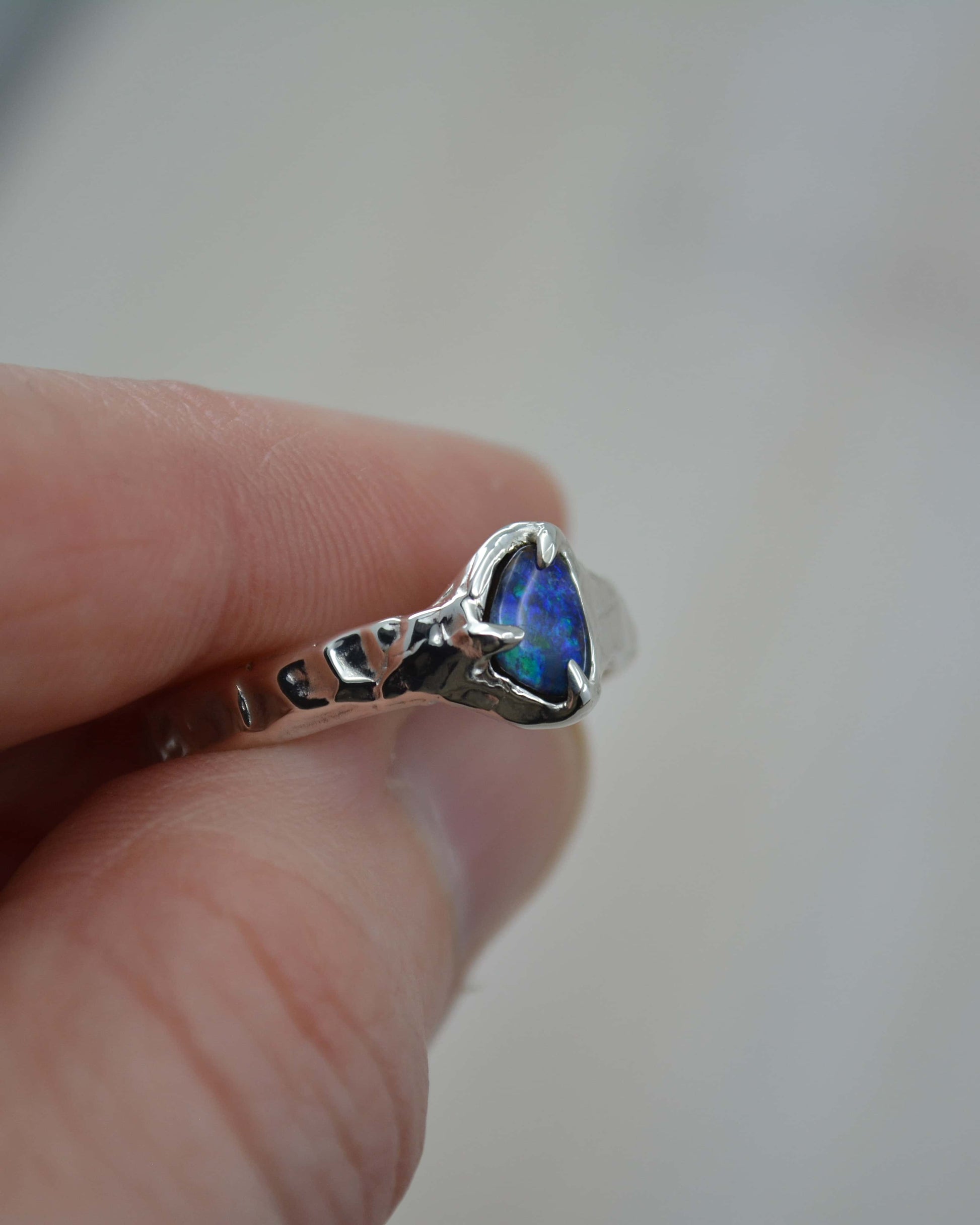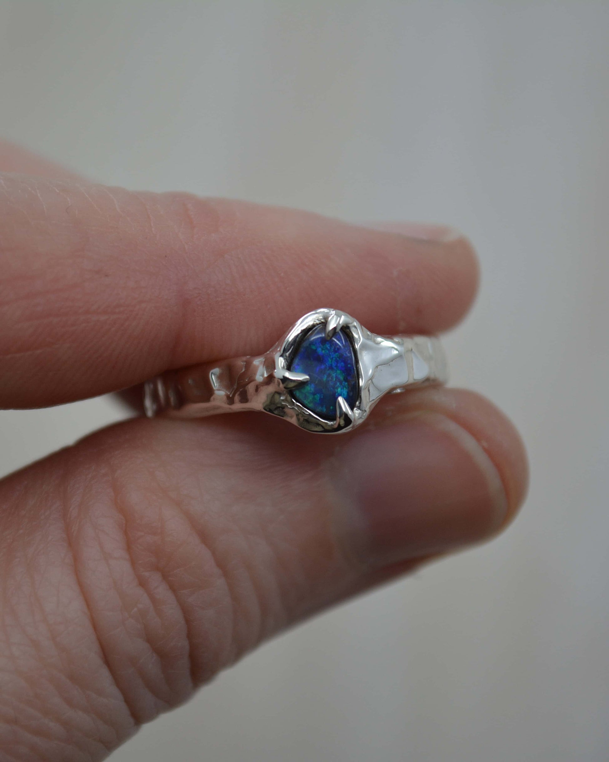 This gorgeous Boulder Opal Sterling Silver Textured Ring has been hand sculpted using the lost wax jewellery method & cast in solid sterling silver. It was created with the intention of a wavy effect on the band, giving its unique look.