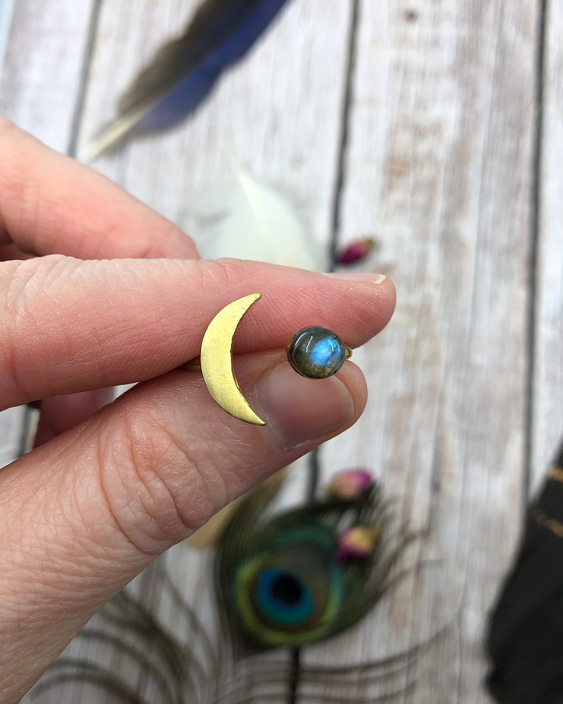 A gorgeous Brass Crescent Moon Labradorite Adjustable Ring.