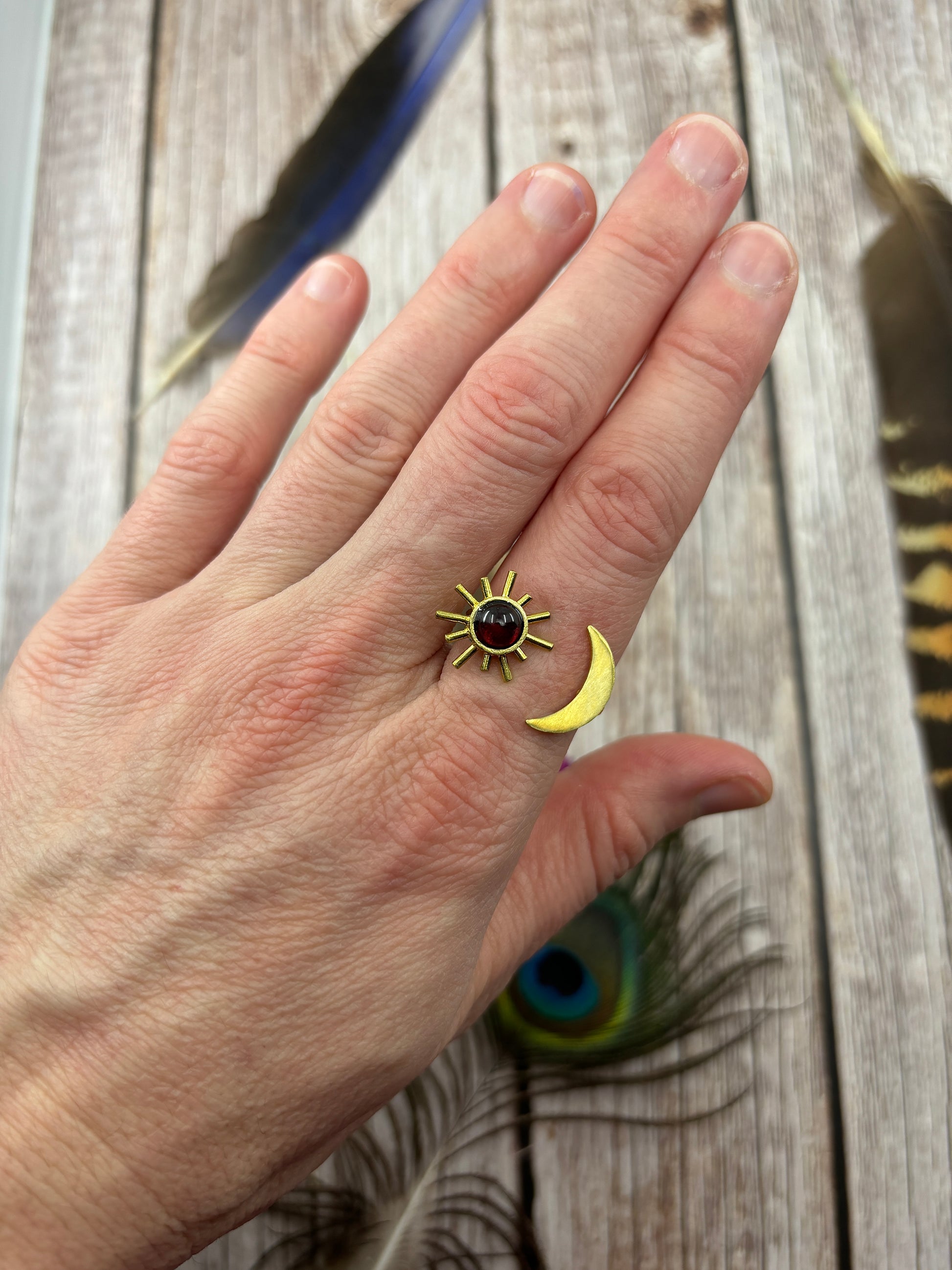 A gorgeous Brass Crescent Moon / Sun Garnet Ring.