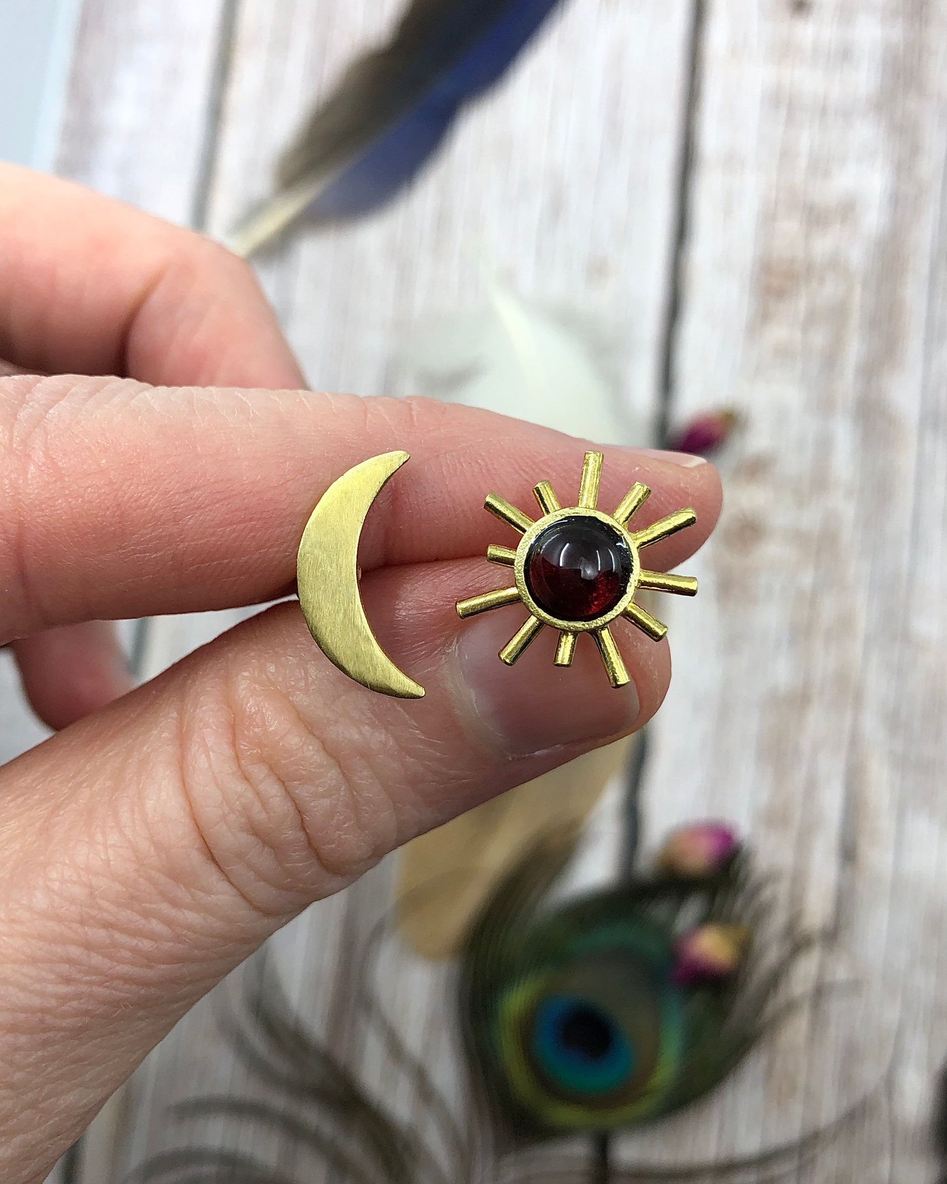 Brass Sun / Crescent Moon Garnet Ring - Size 7