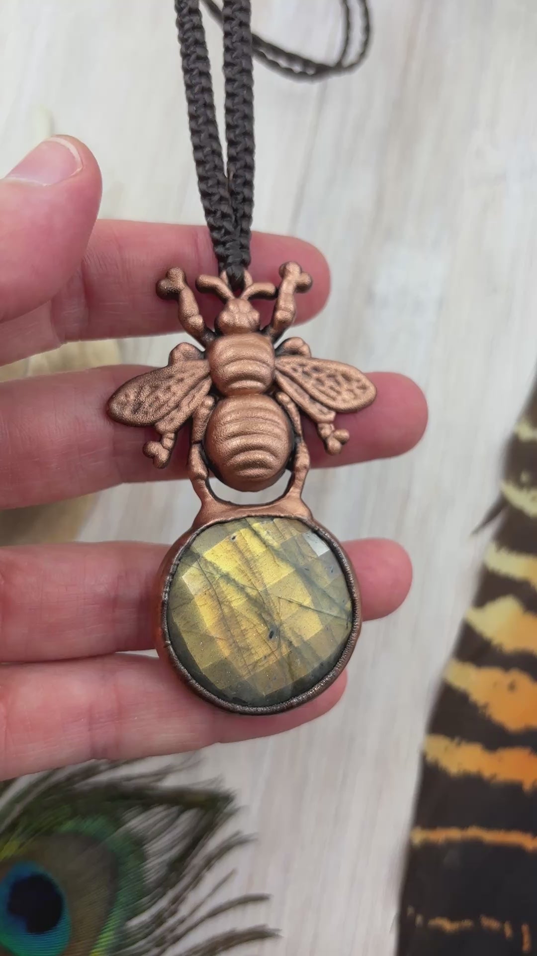 This bumble bee pendant features a beautiful round Faceted Labradorite which has been copper plated using the art of electroforming.