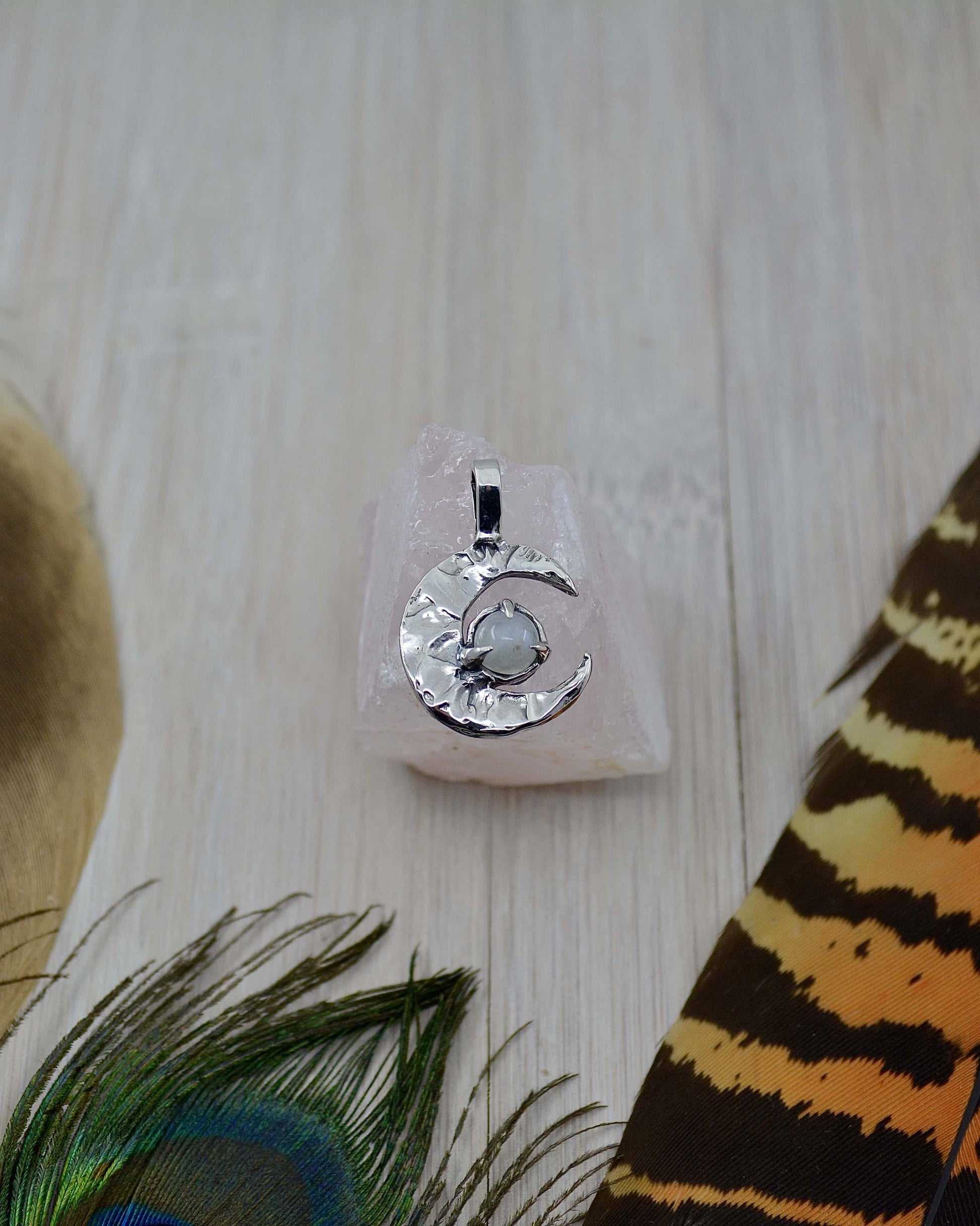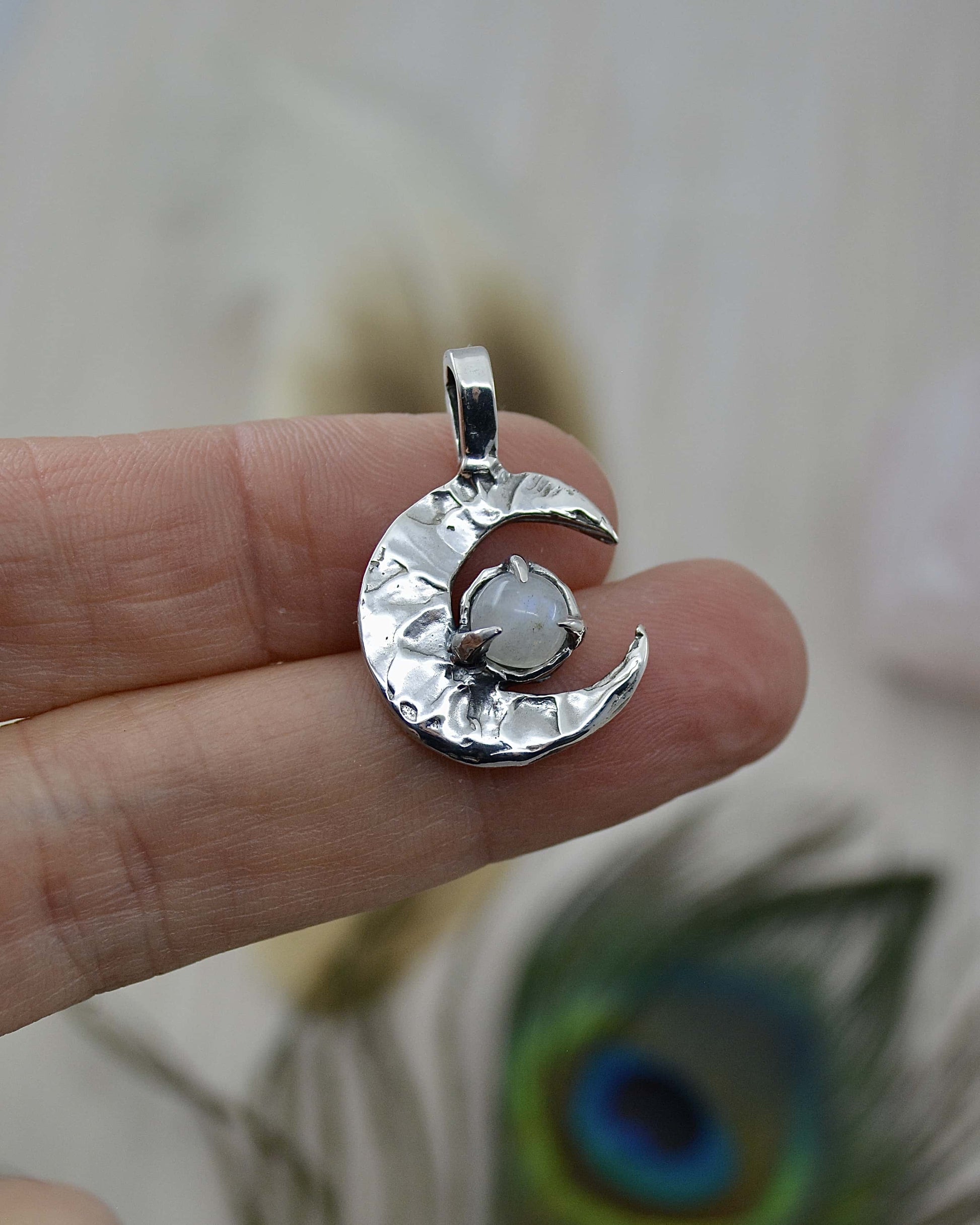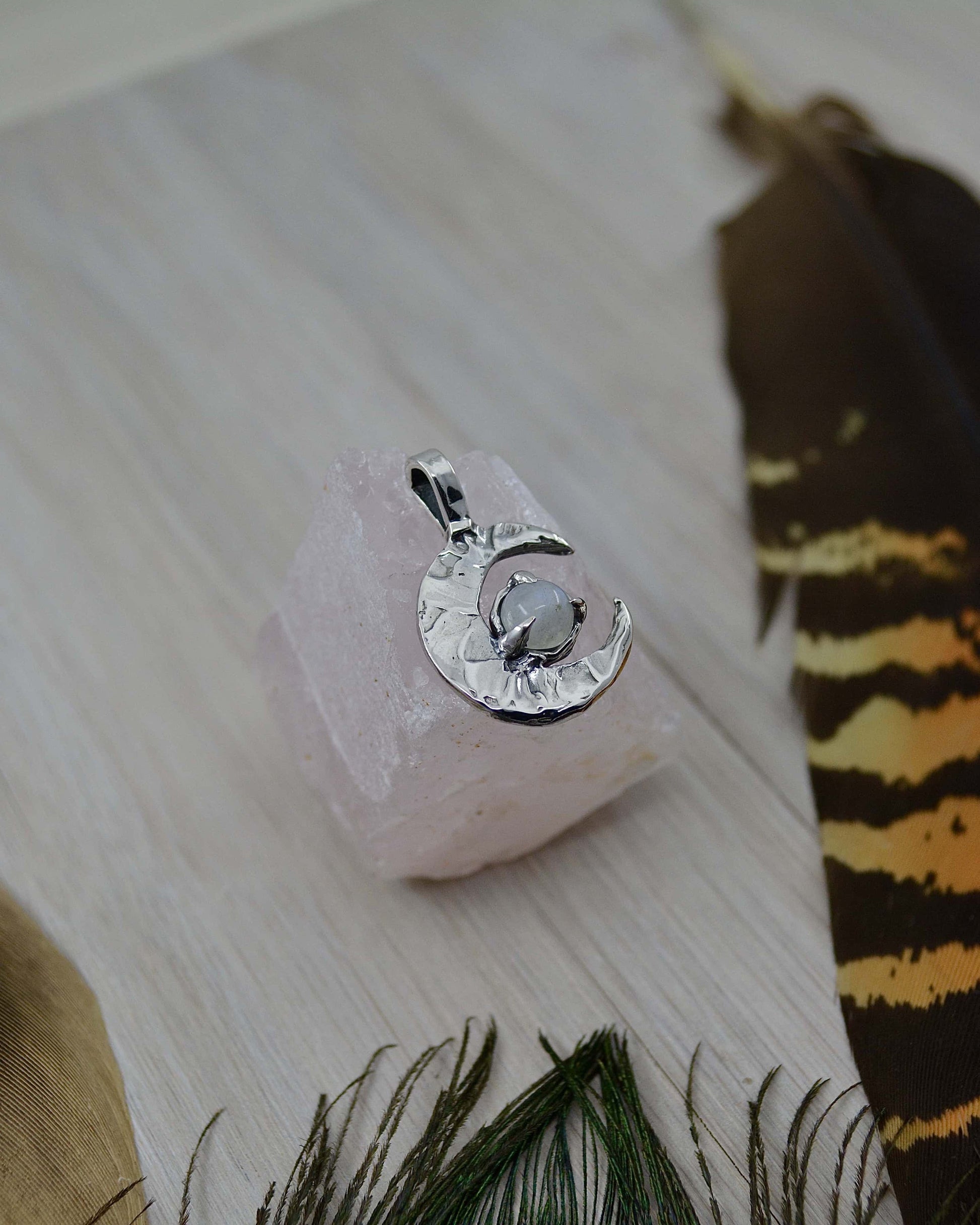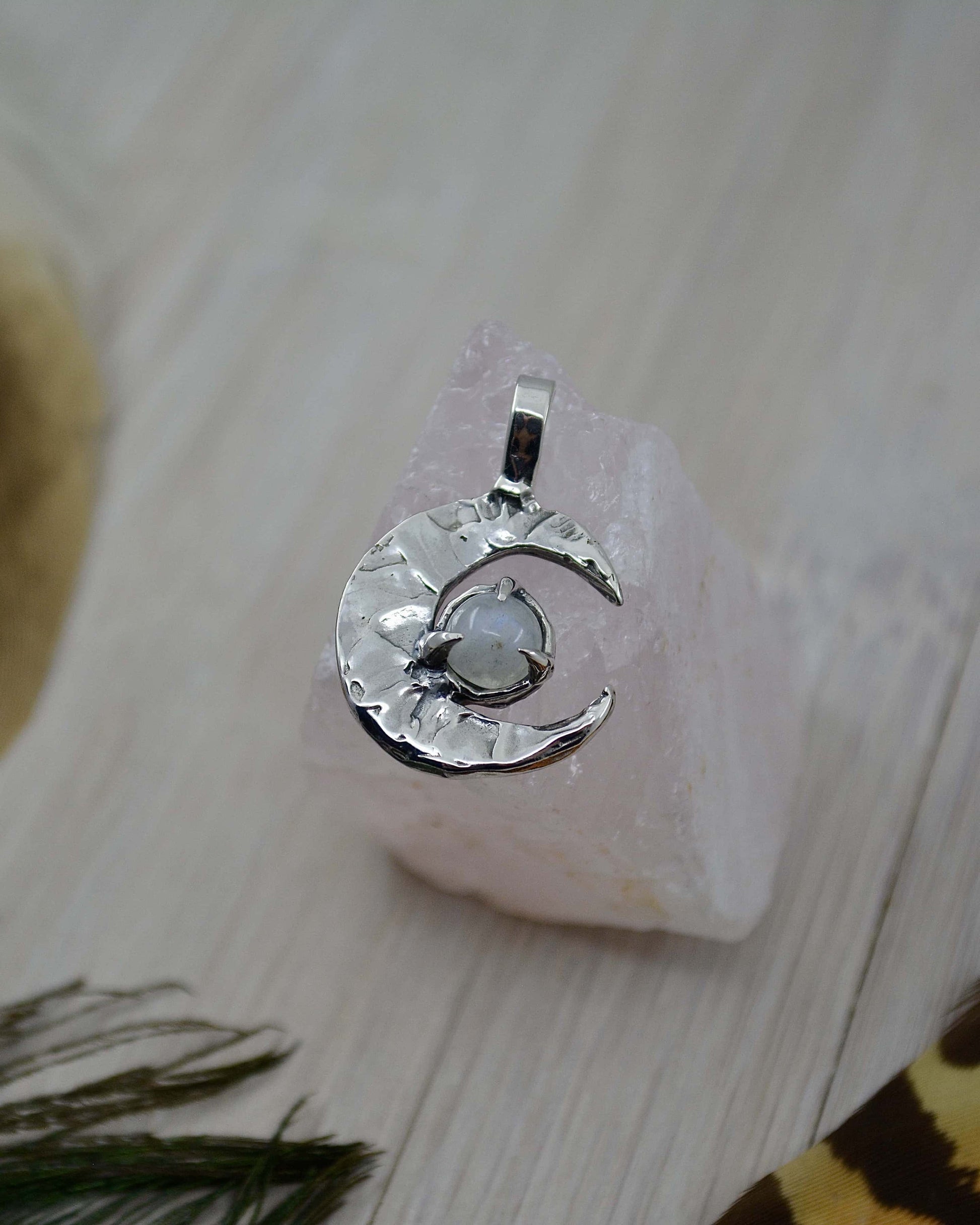 This Crescent Moon Rainbow Moonstone Sterling Silver Pendant features a beautiful Rainbow Moonstone. It has been hand sculpted using the lost wax jewellery method & cast in solid sterling silver. Created with a molten effect, this piece has a very unique look.