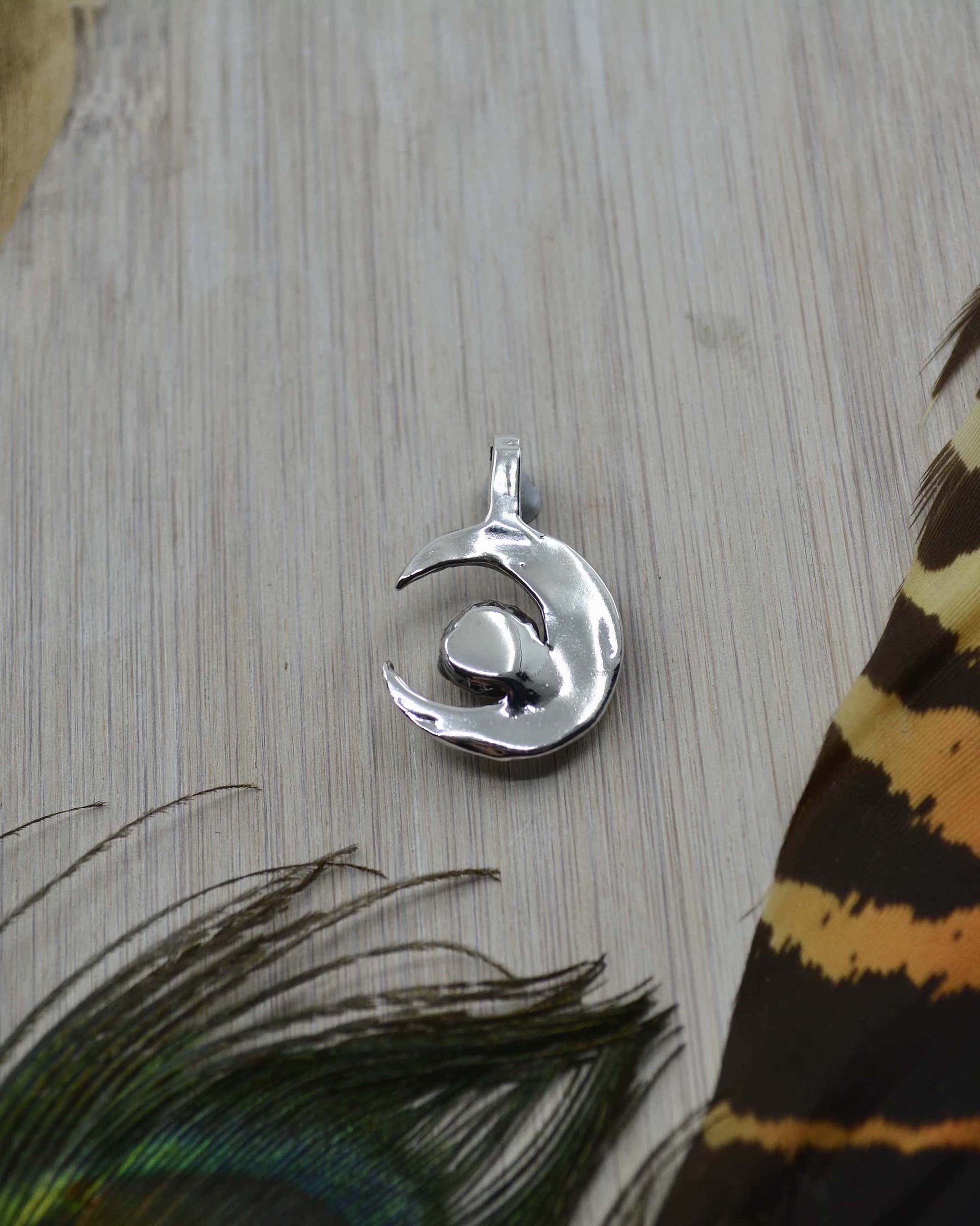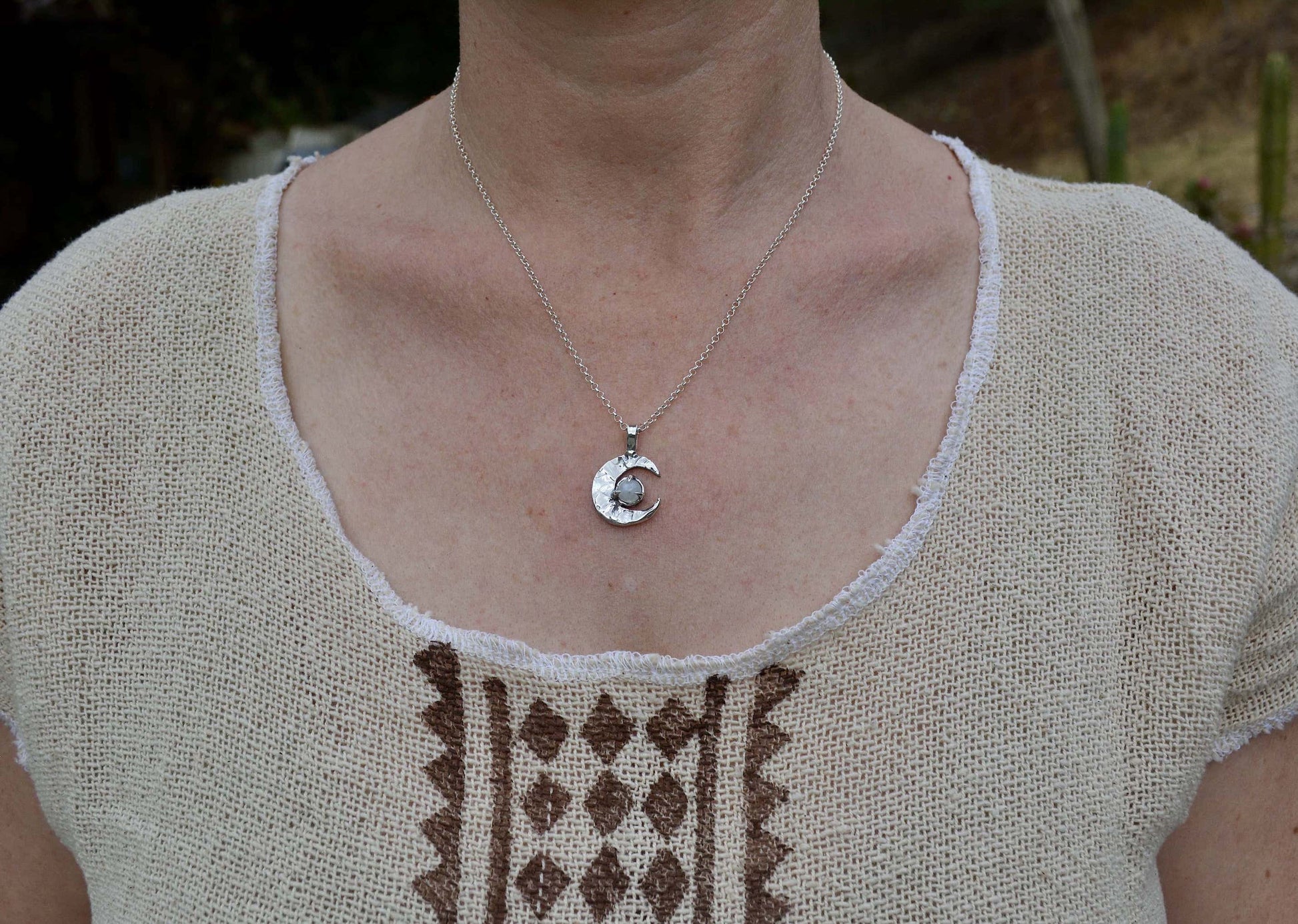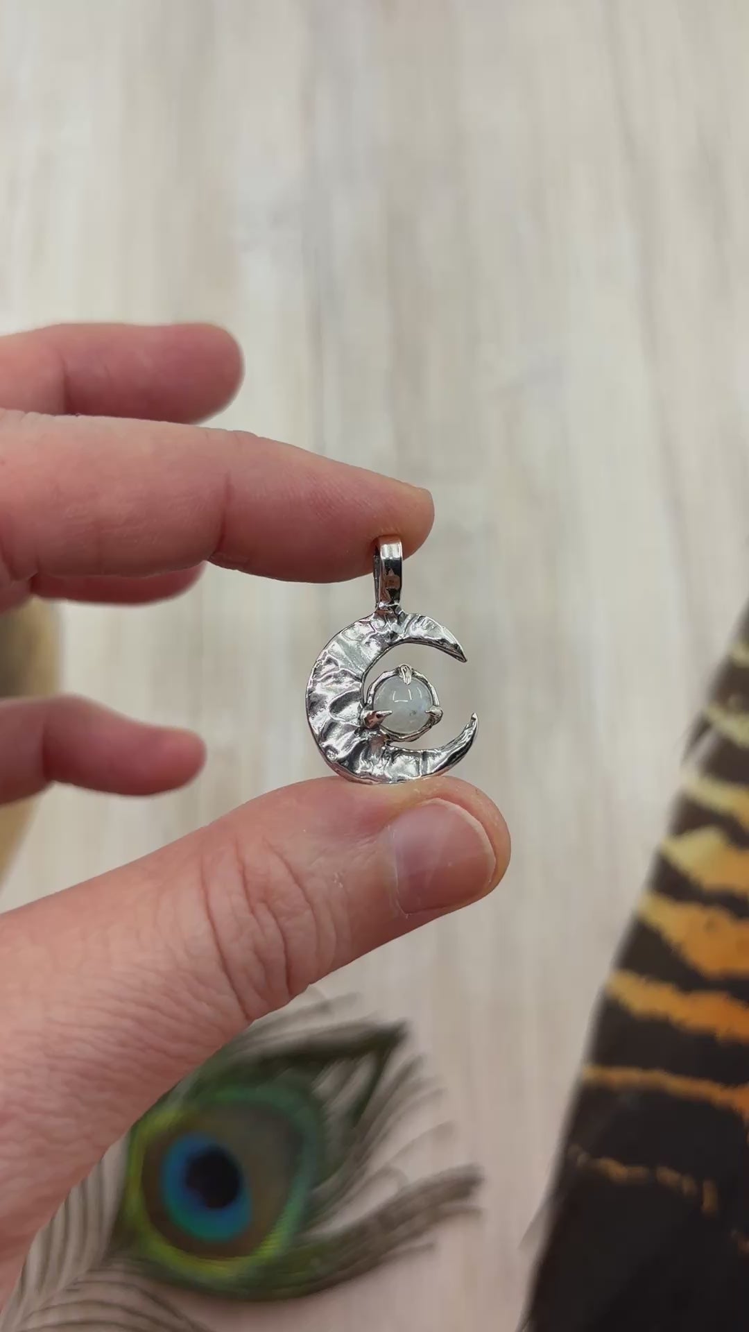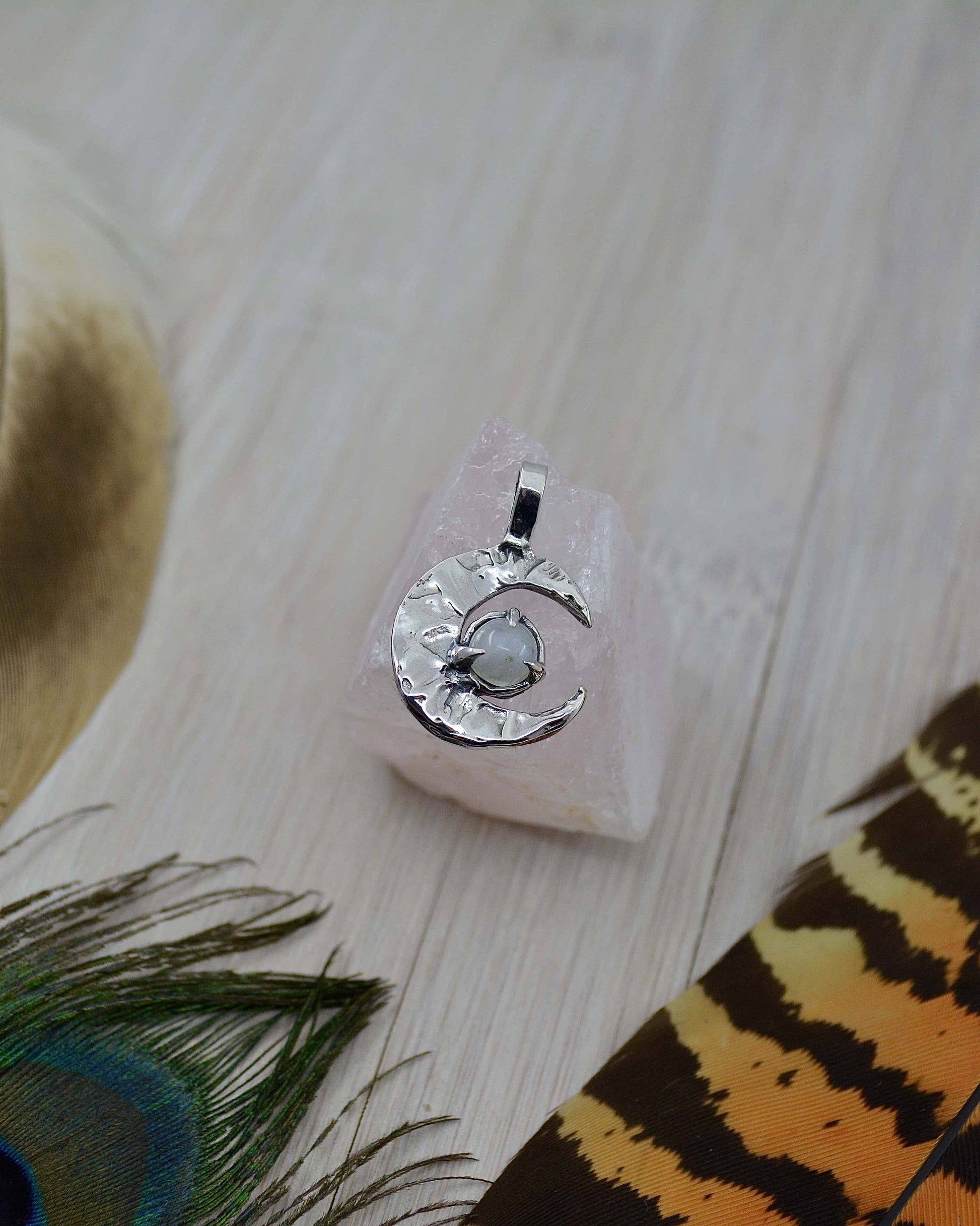 This Crescent Moon Rainbow Moonstone Sterling Silver Pendant features a beautiful Rainbow Moonstone. It has been hand sculpted using the lost wax jewellery method & cast in solid sterling silver. Created with a molten effect, this piece has a very unique look.