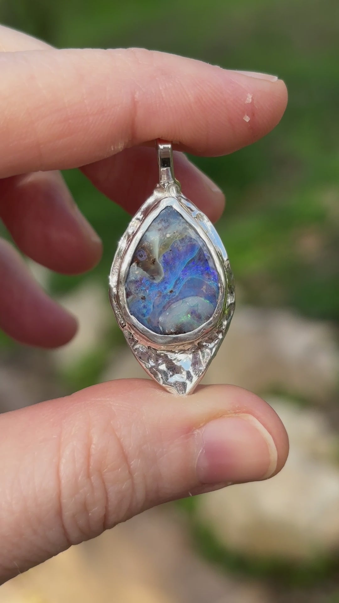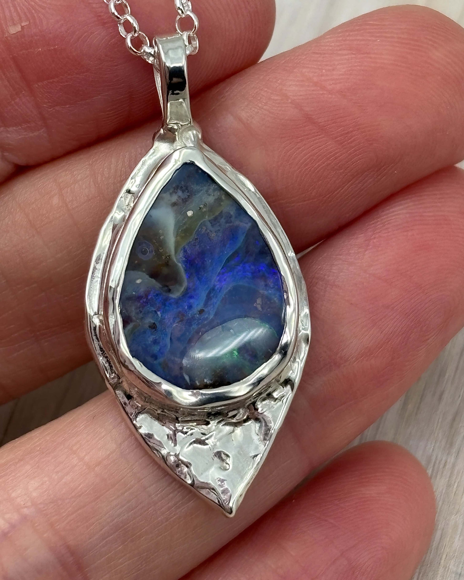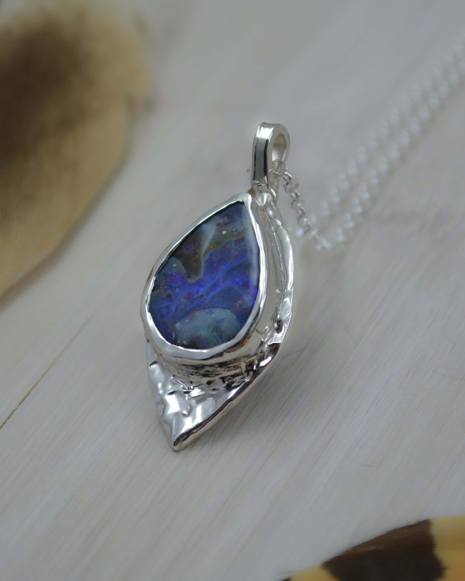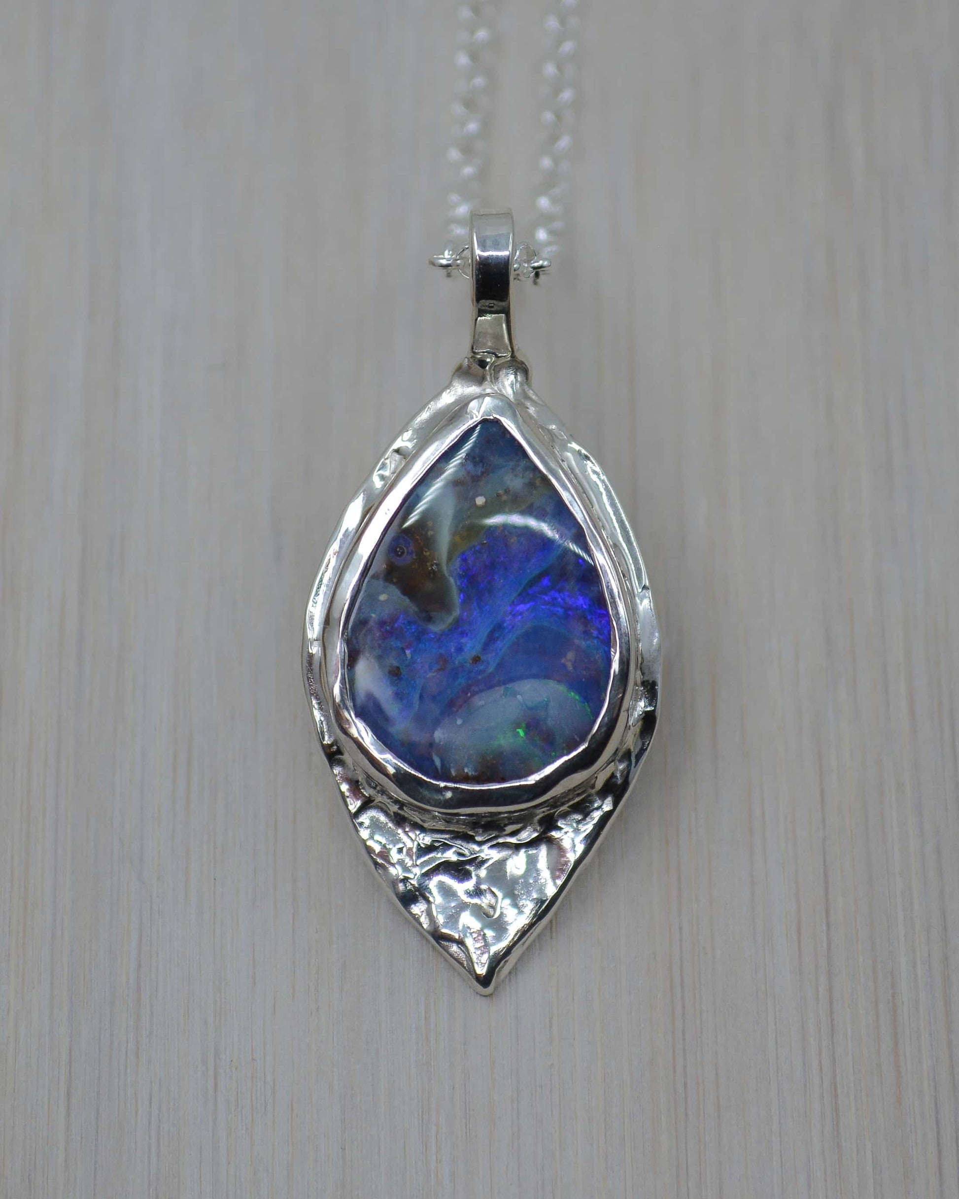 This Boulder Opal Sterling Silver Textured Pendant has an eagle looking in from the left side of the stone. It has been hand sculpted using the lost wax jewellery method & cast in solid sterling silver. Created with a molten effect, this piece has a very unique look.