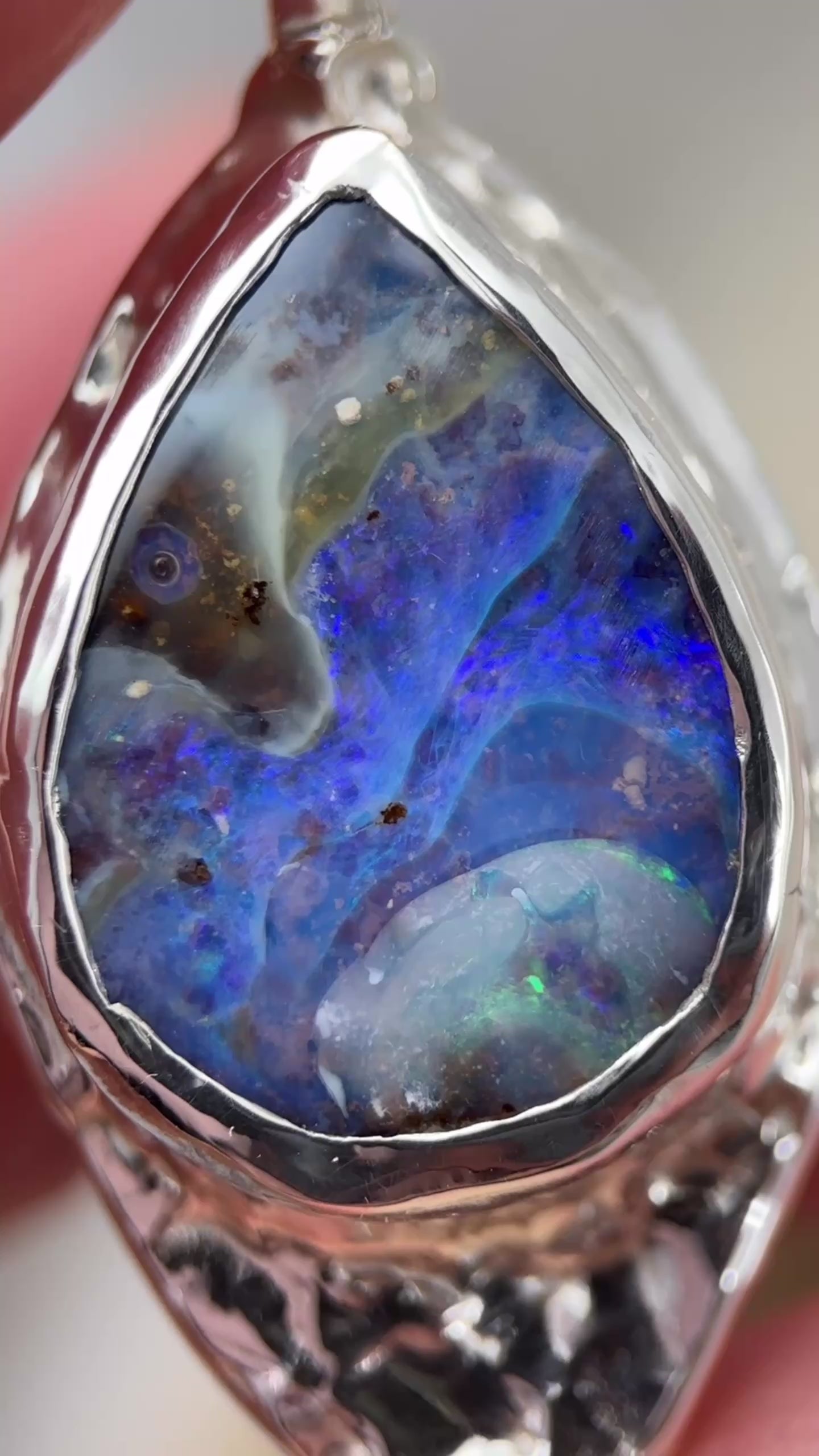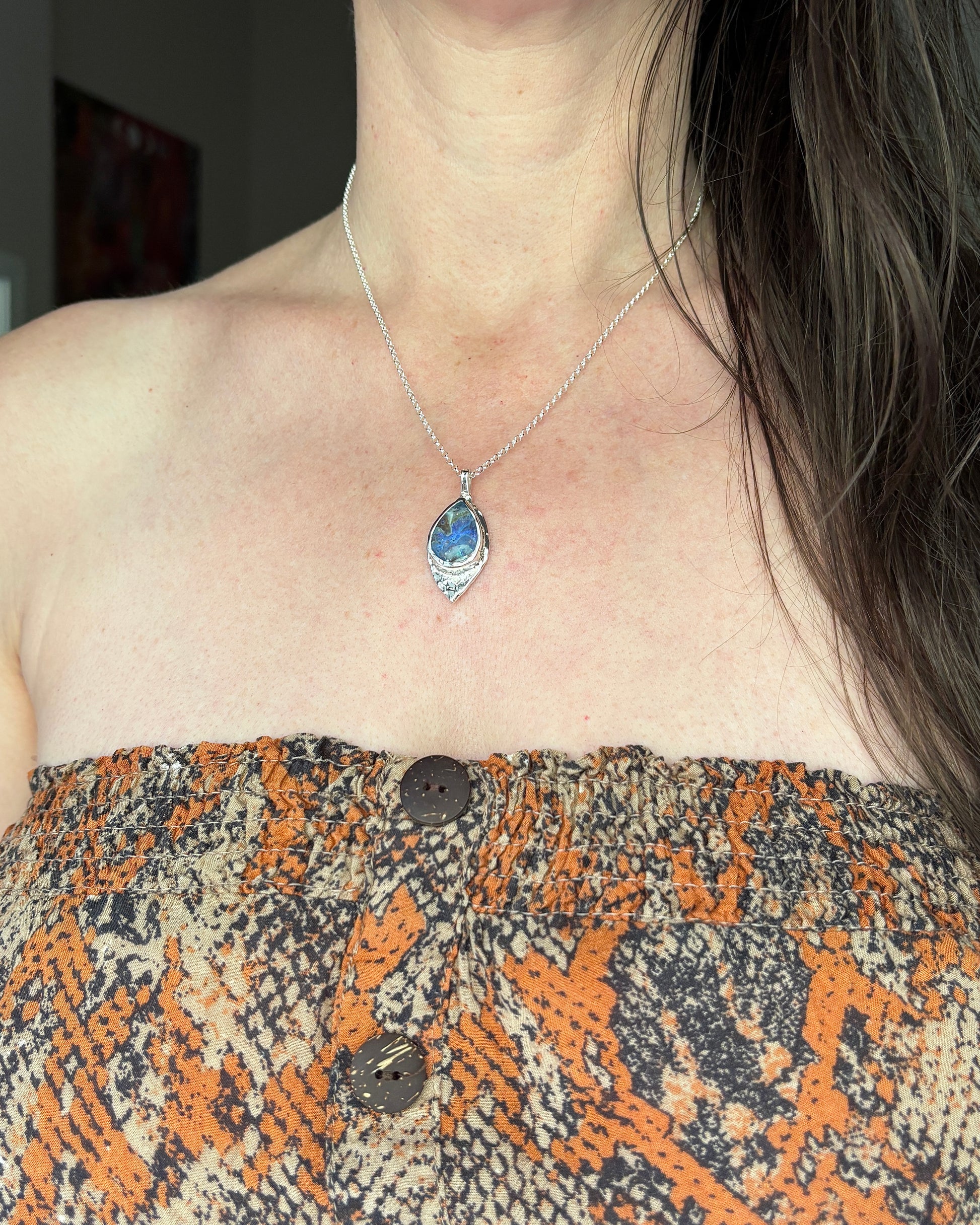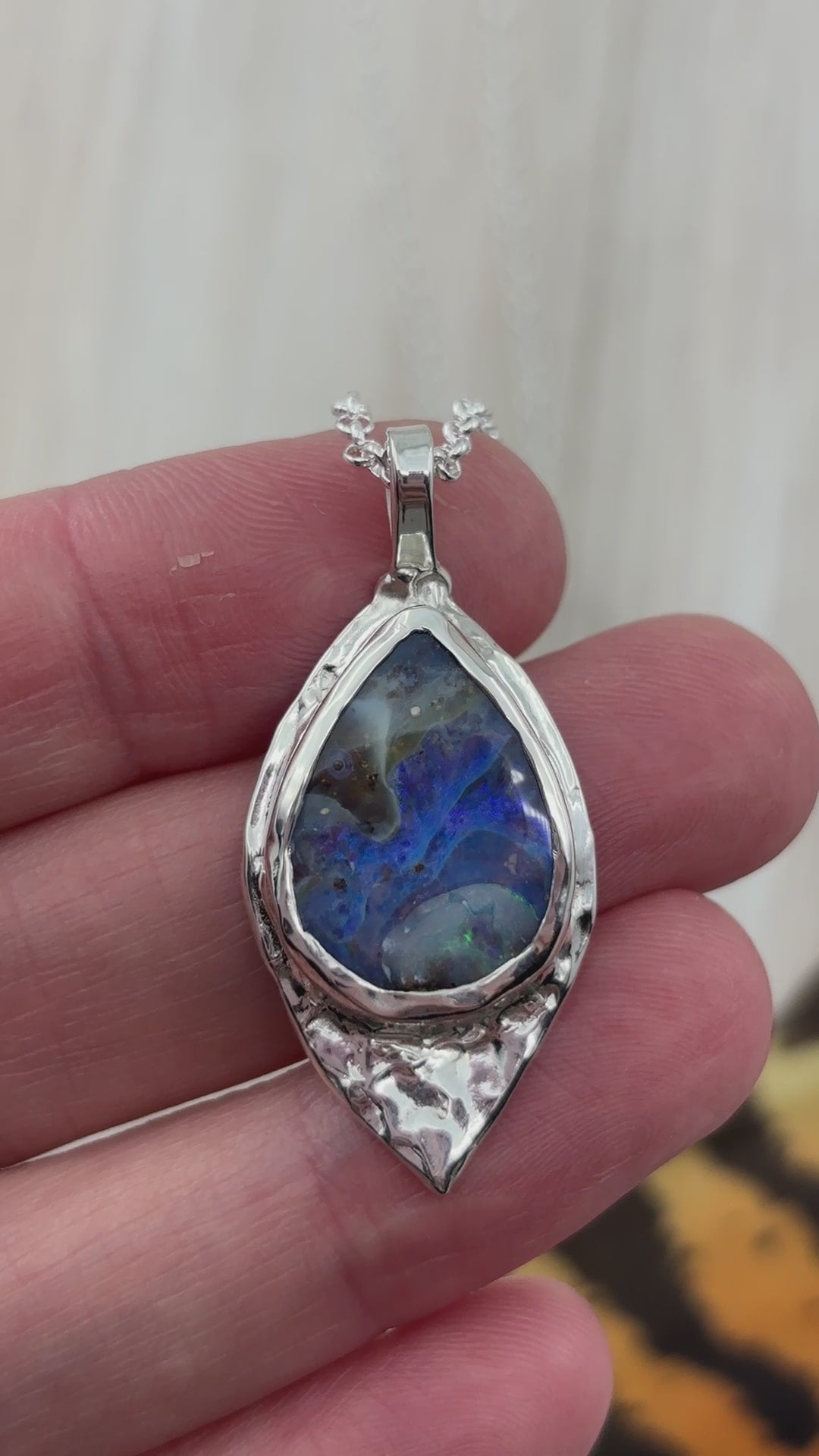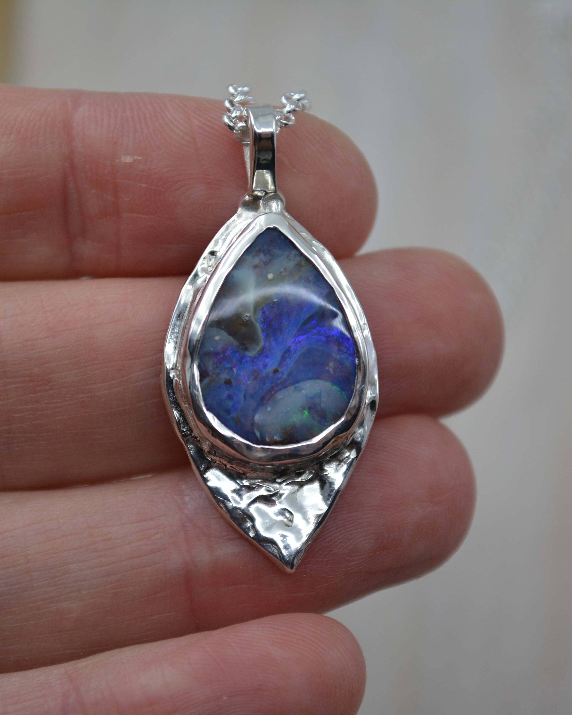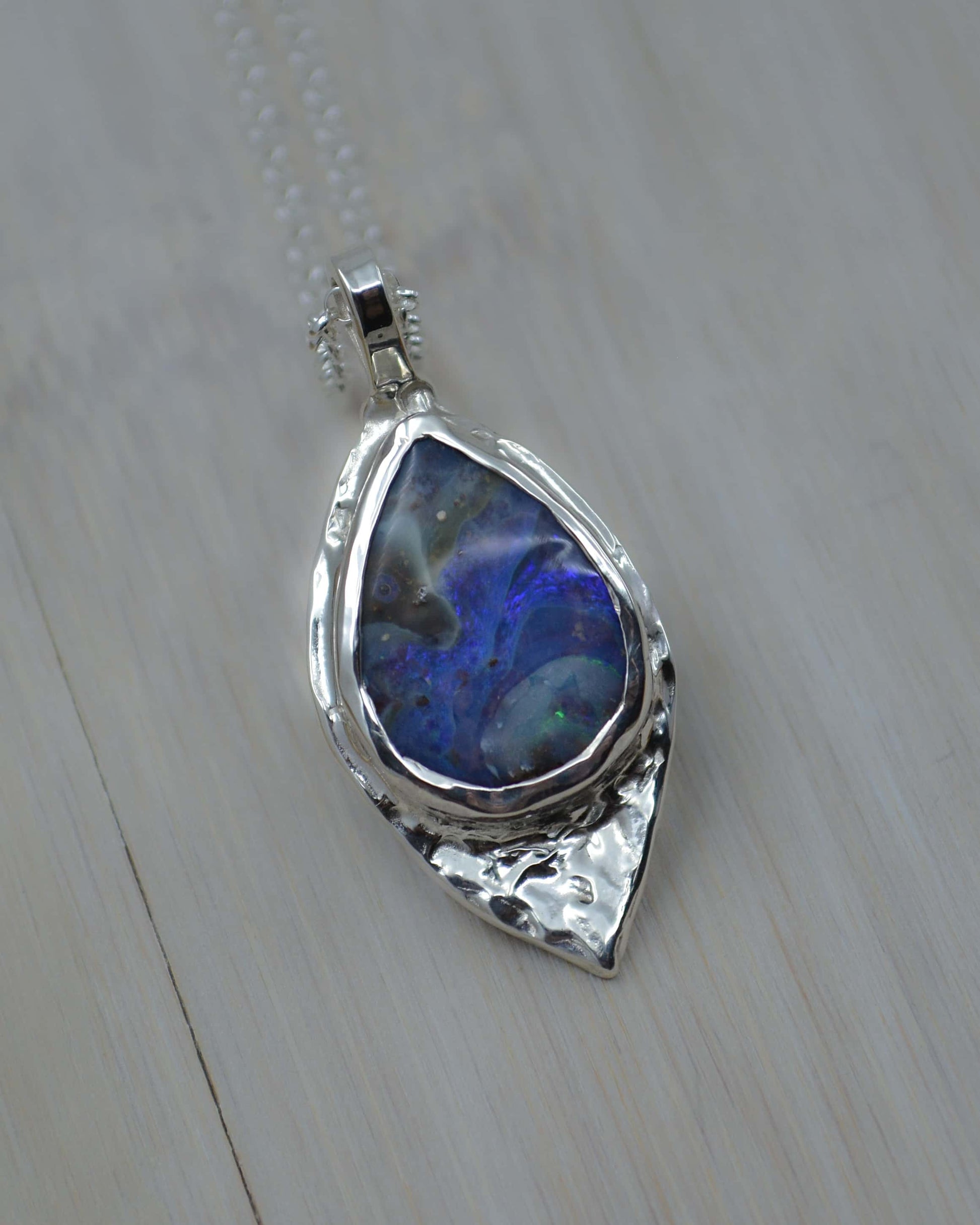This Boulder Opal Sterling Silver Textured Pendant has an eagle looking in from the left side of the stone. It has been hand sculpted using the lost wax jewellery method & cast in solid sterling silver. Created with a molten effect, this piece has a very unique look.