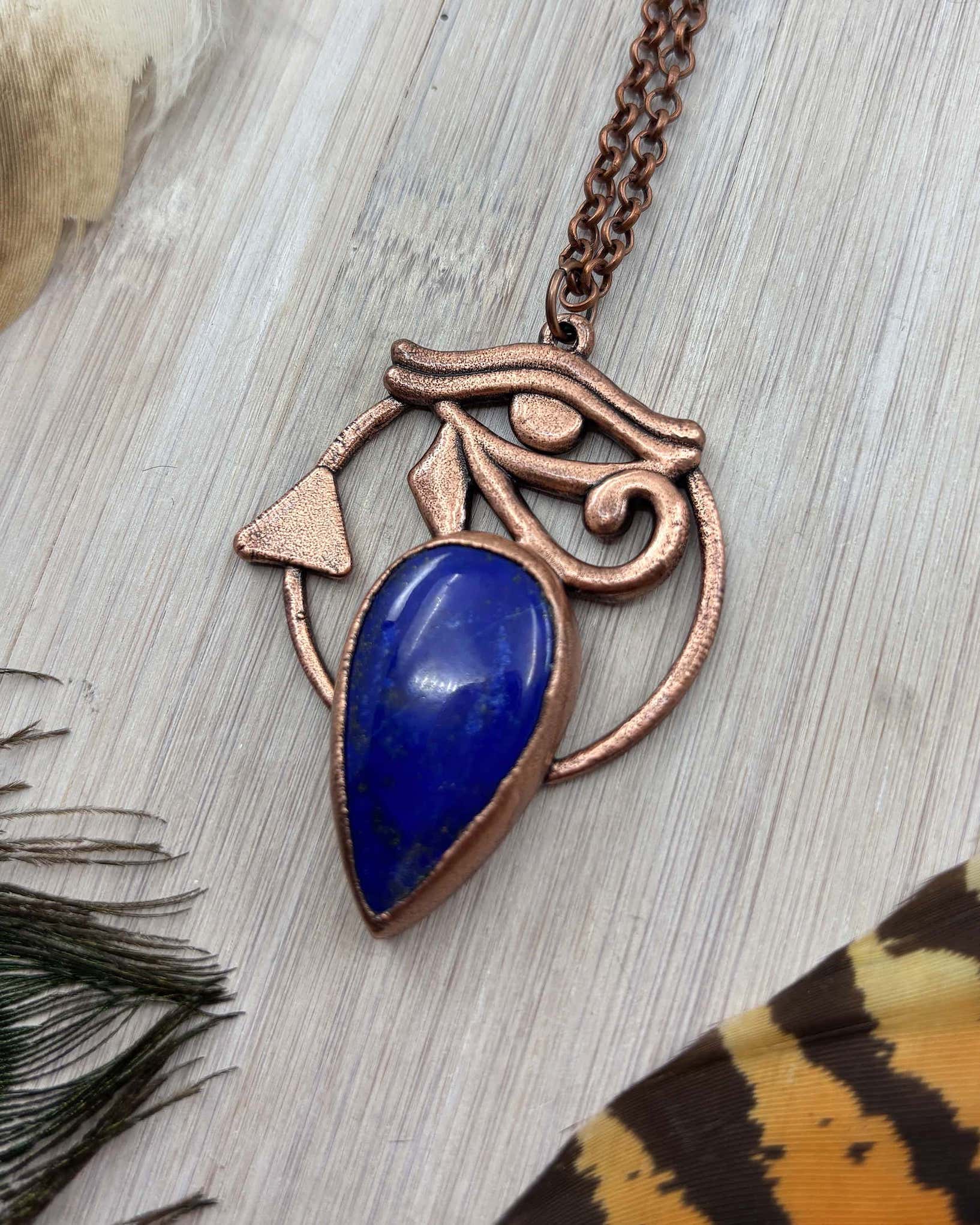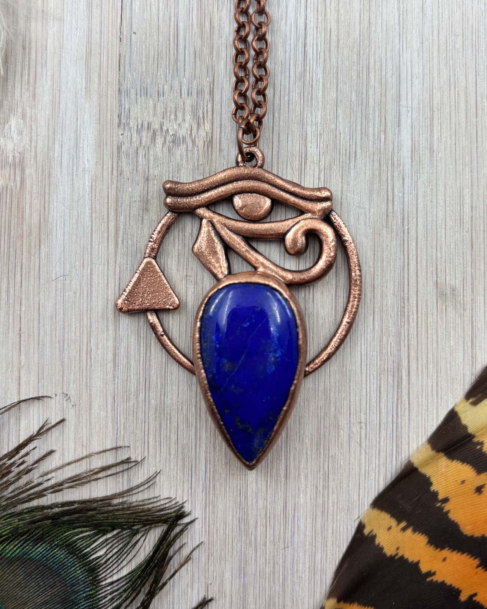 This Egyptian Eye Of Horus features a Lapis Lazuli. It has been copper plated using the art of electroforming.