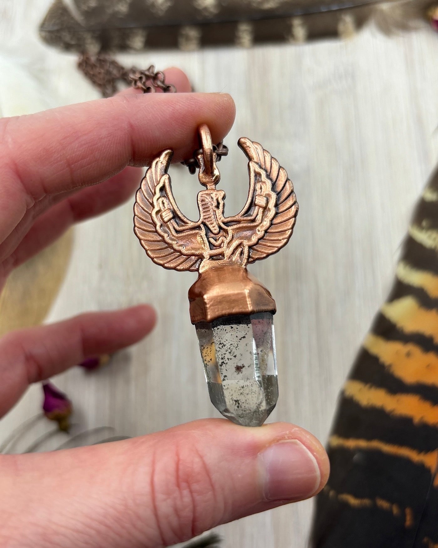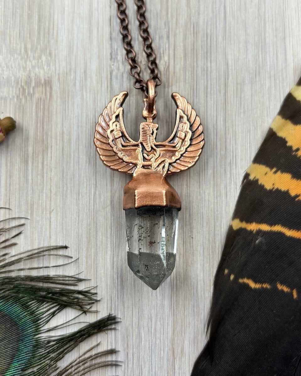 This Egyptian Goddess Pendant features a beautiful Clear Quartz Point with Inclusions. It has been copper plated using the art of electroforming.