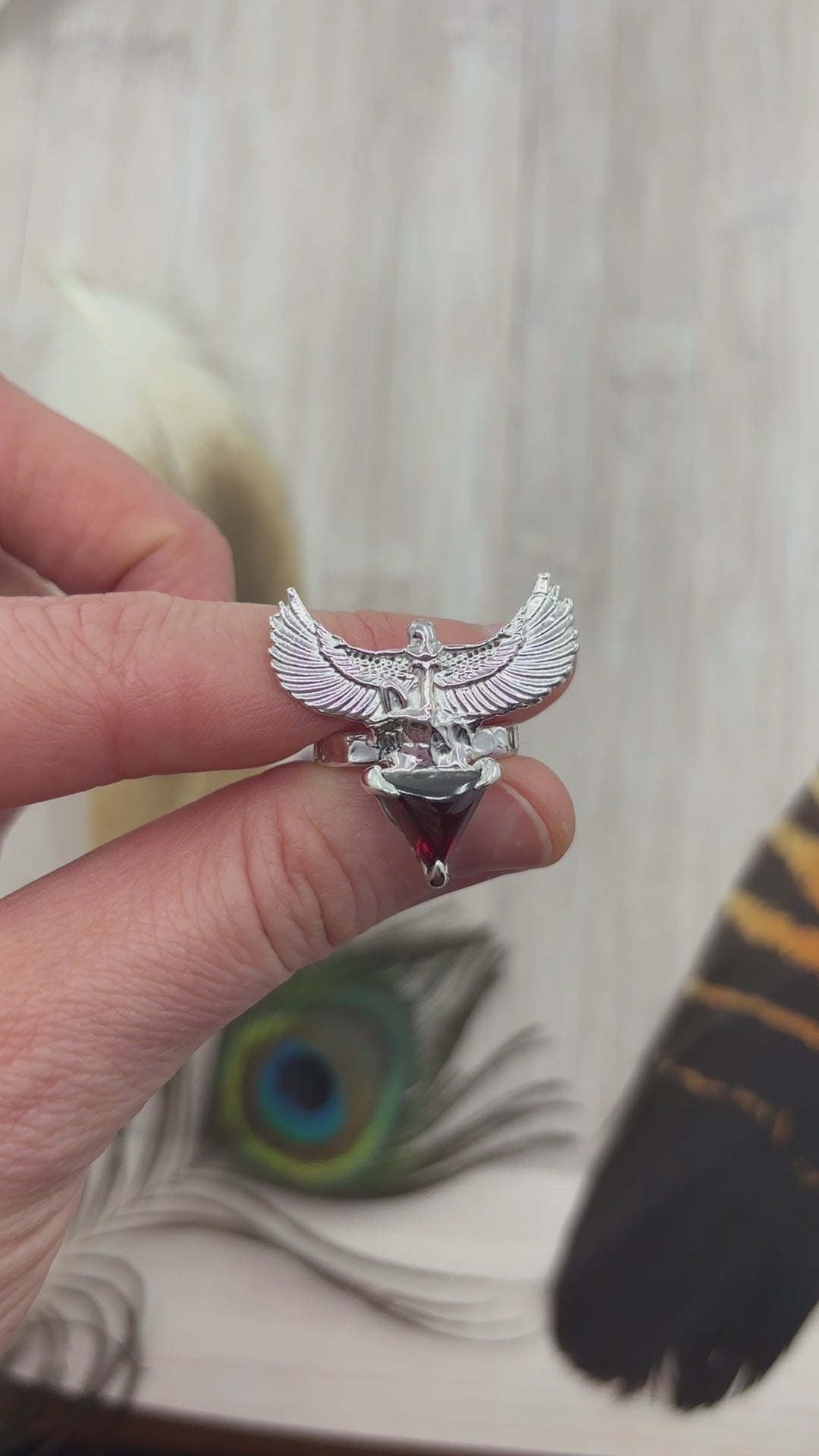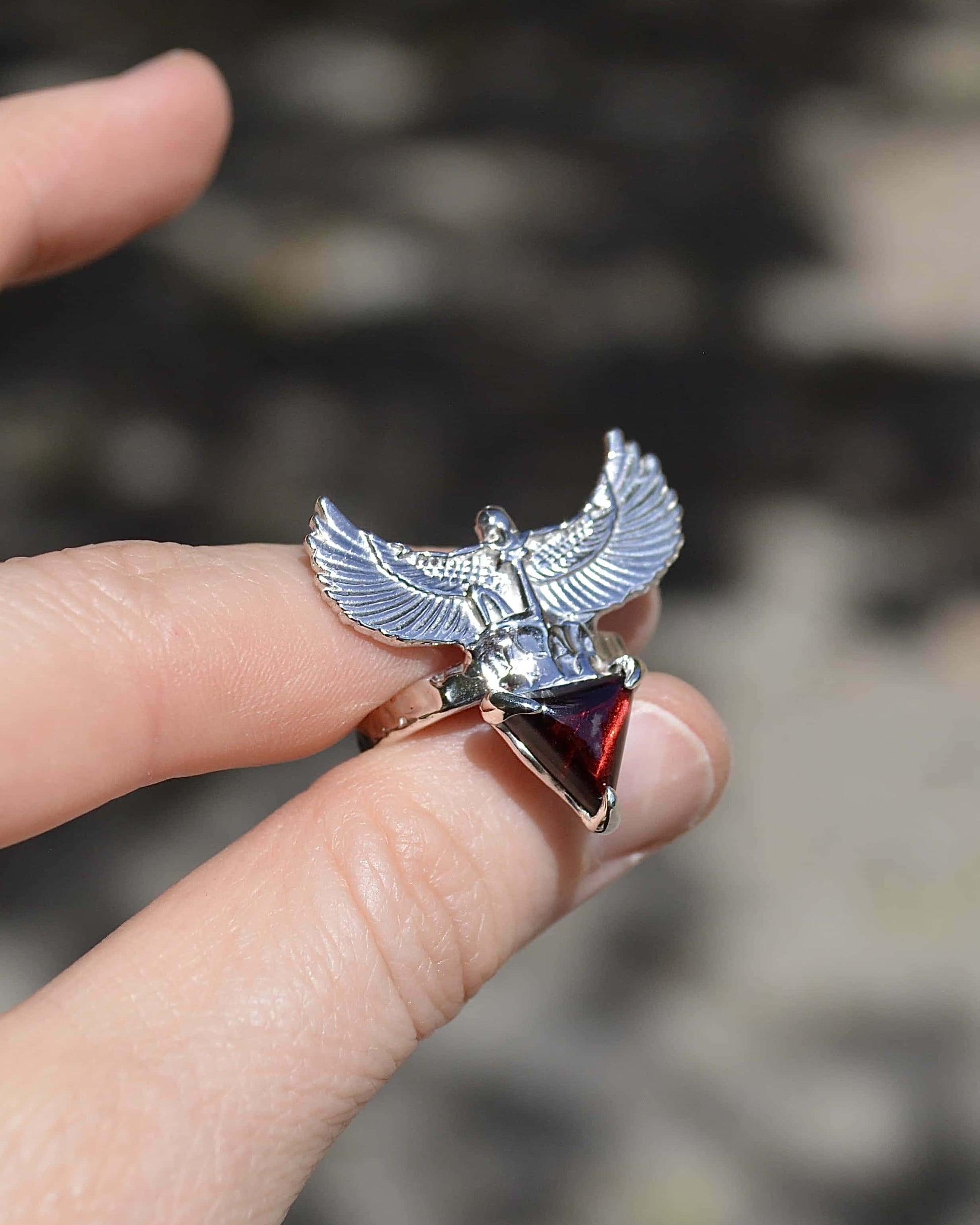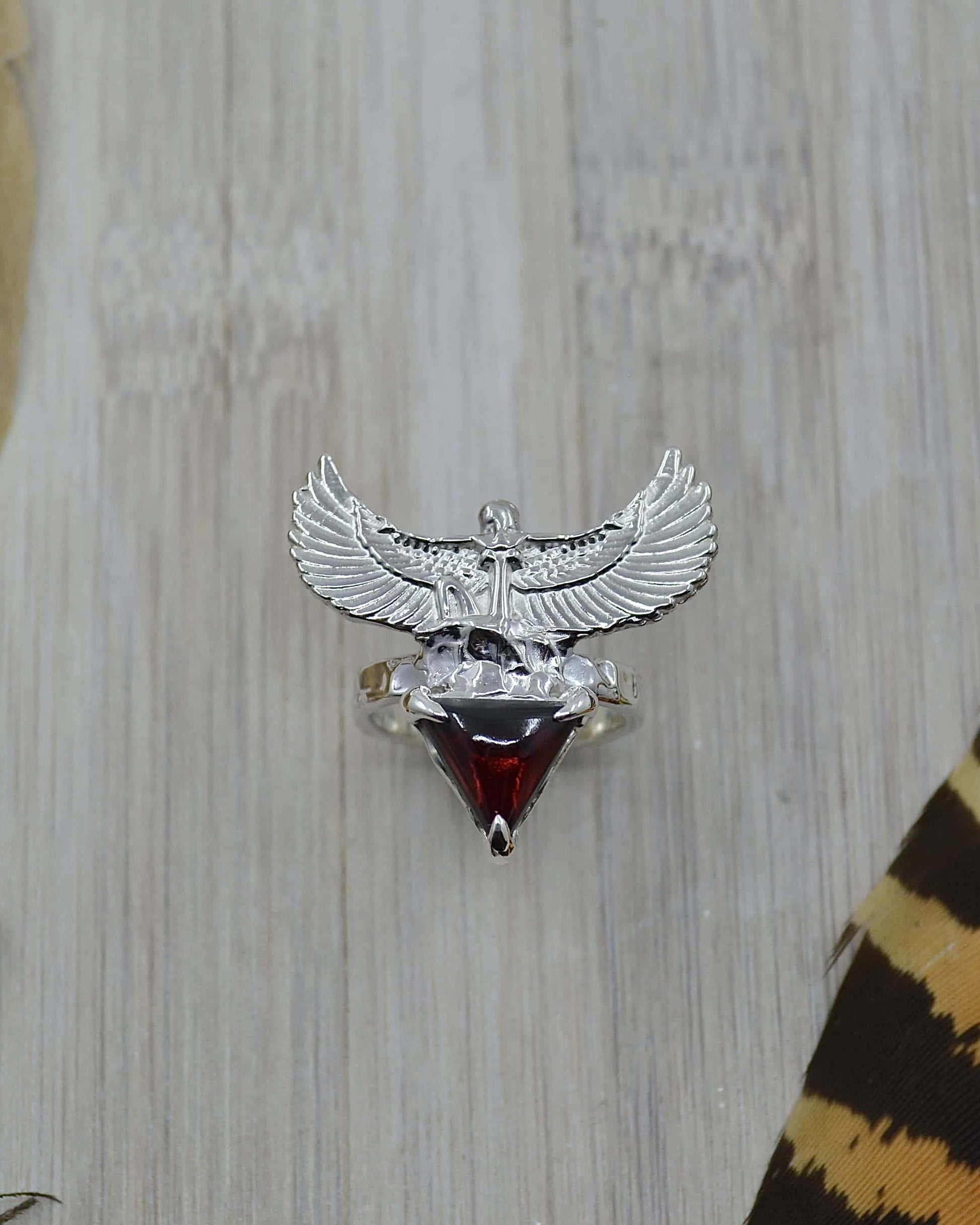 Egyptian Goddess Triangle Garnet Sterling Silver Ring - 6.75 US