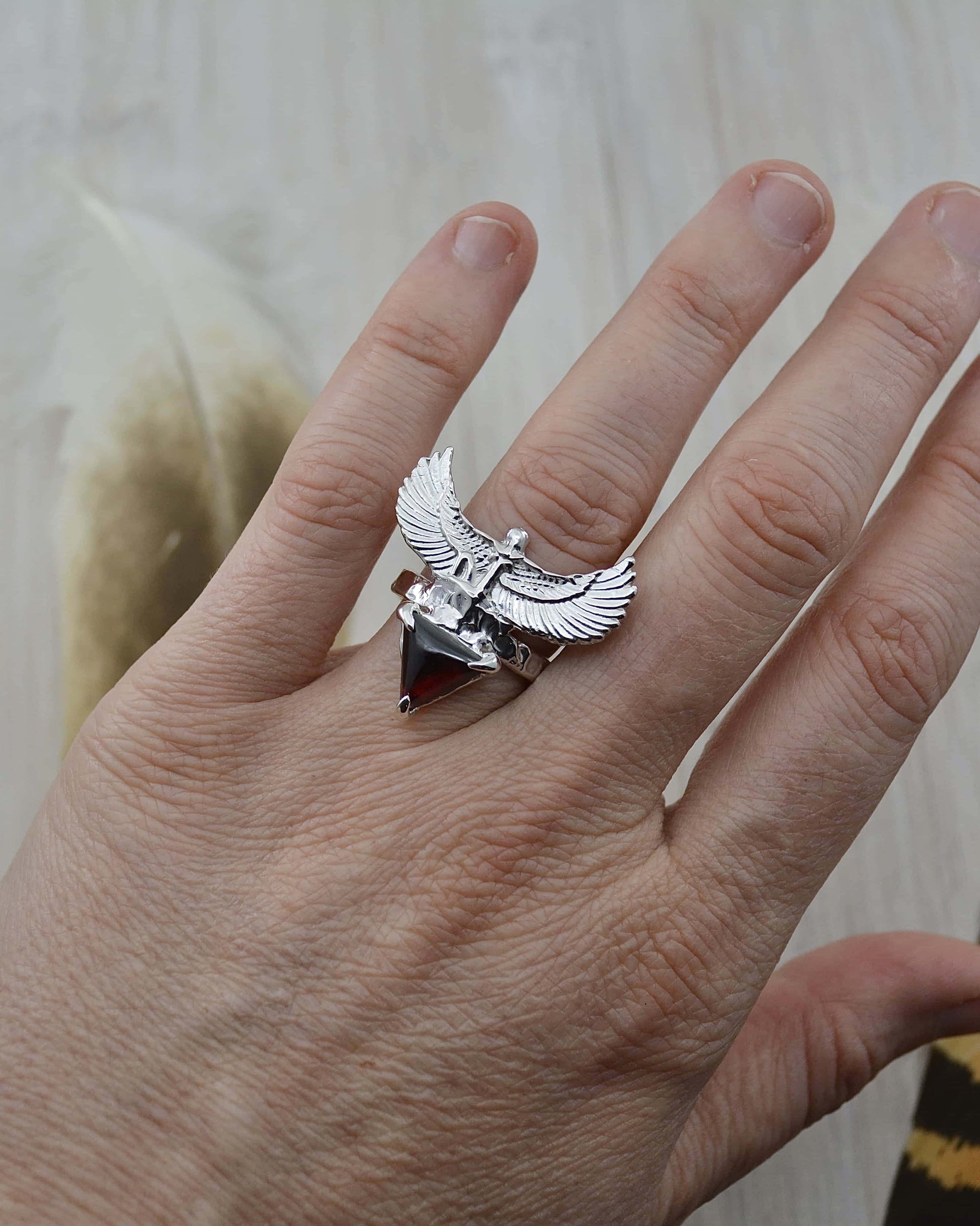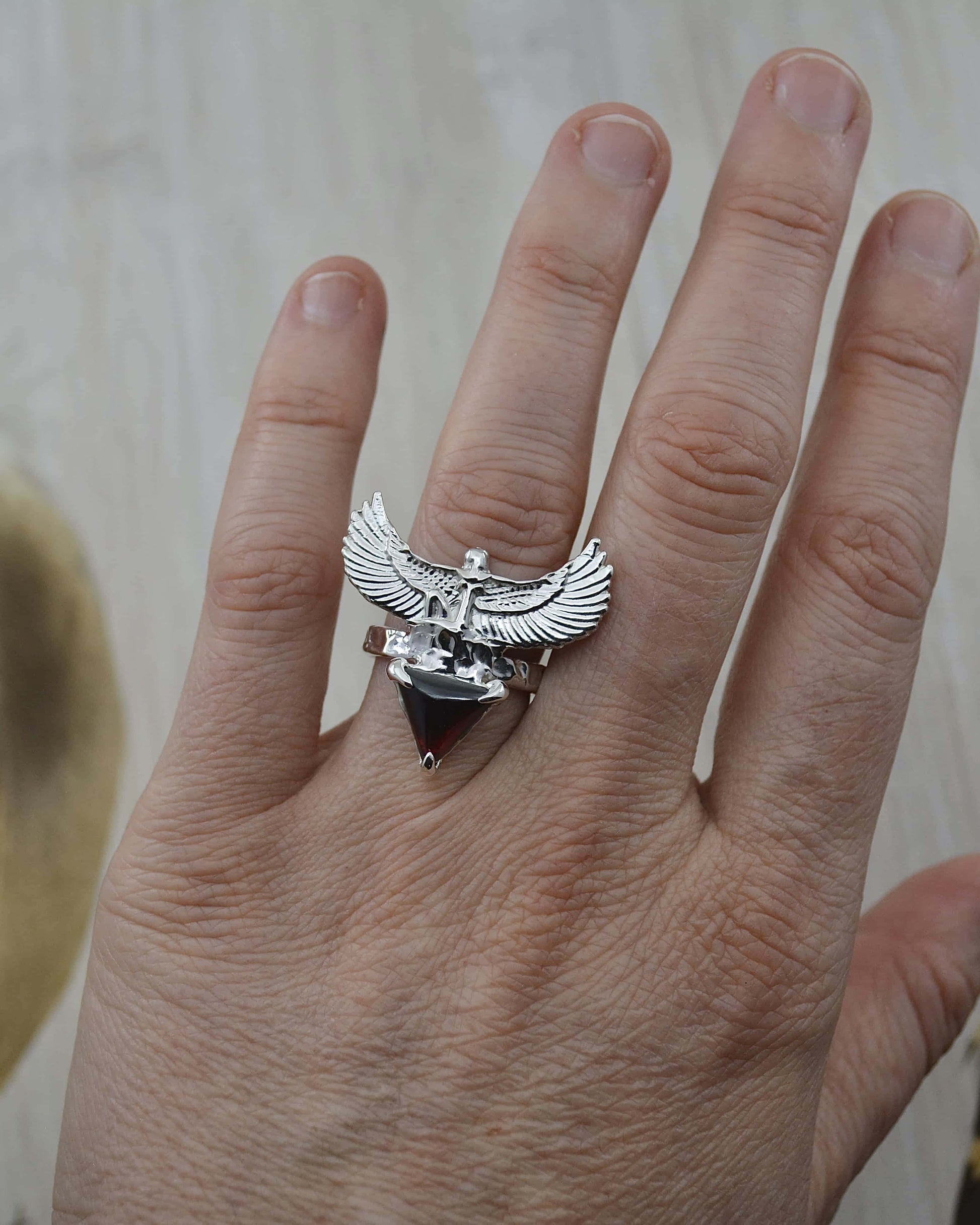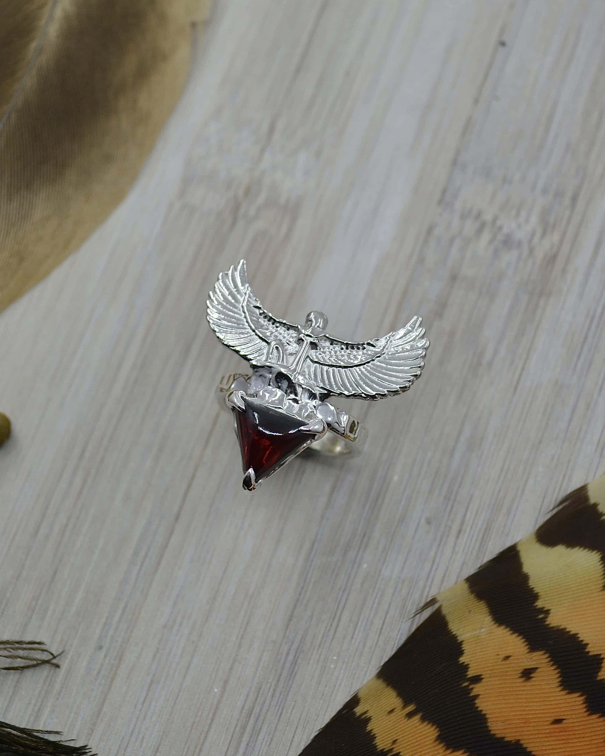 Egyptian Goddess Triangle Garnet Sterling Silver Ring - 6.75 US