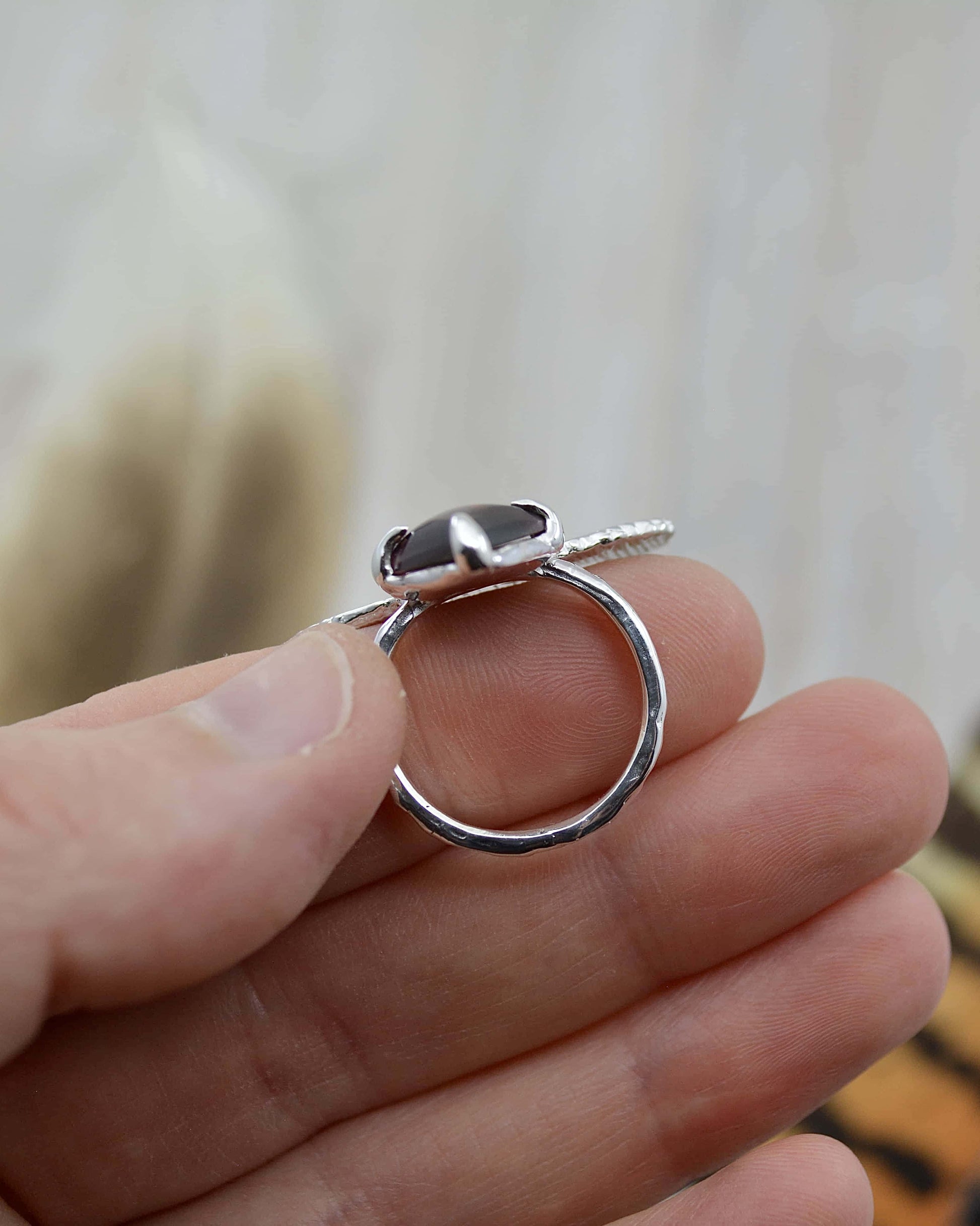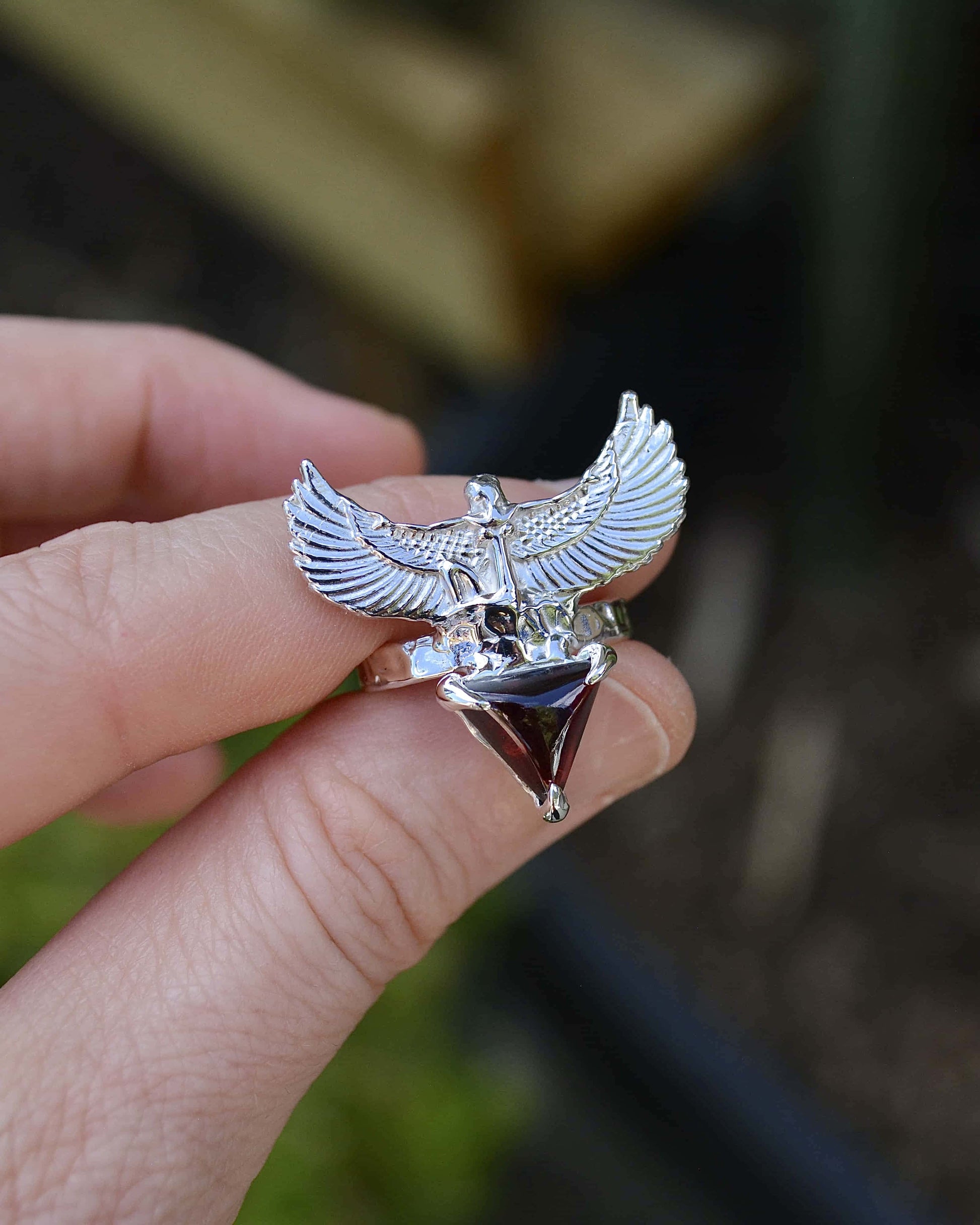 This Egyptian Goddess Triangle Garnet Sterling Silver Ring has been hand sculpted using the lost wax jewellery method & cast in solid sterling silver. It was created with a molten like effect on the band, giving its unique look.