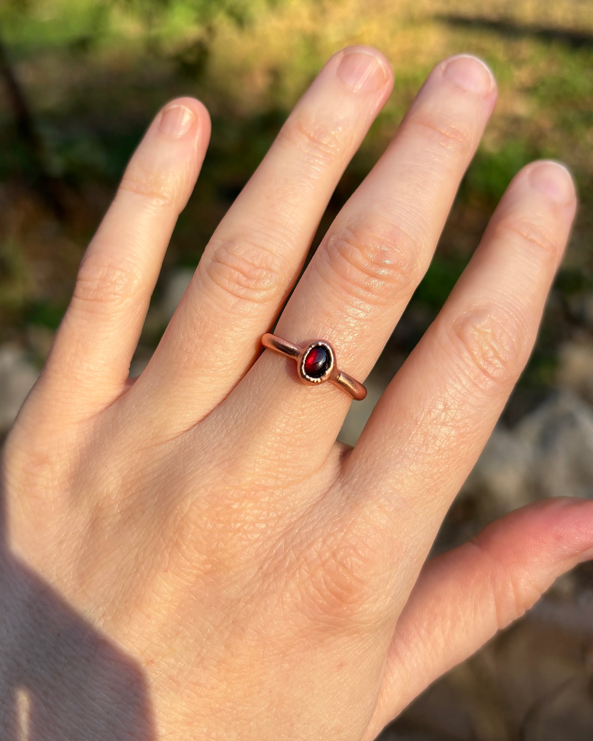 This Garnet Ring is made from copper. It was created using a technique called electroforming.