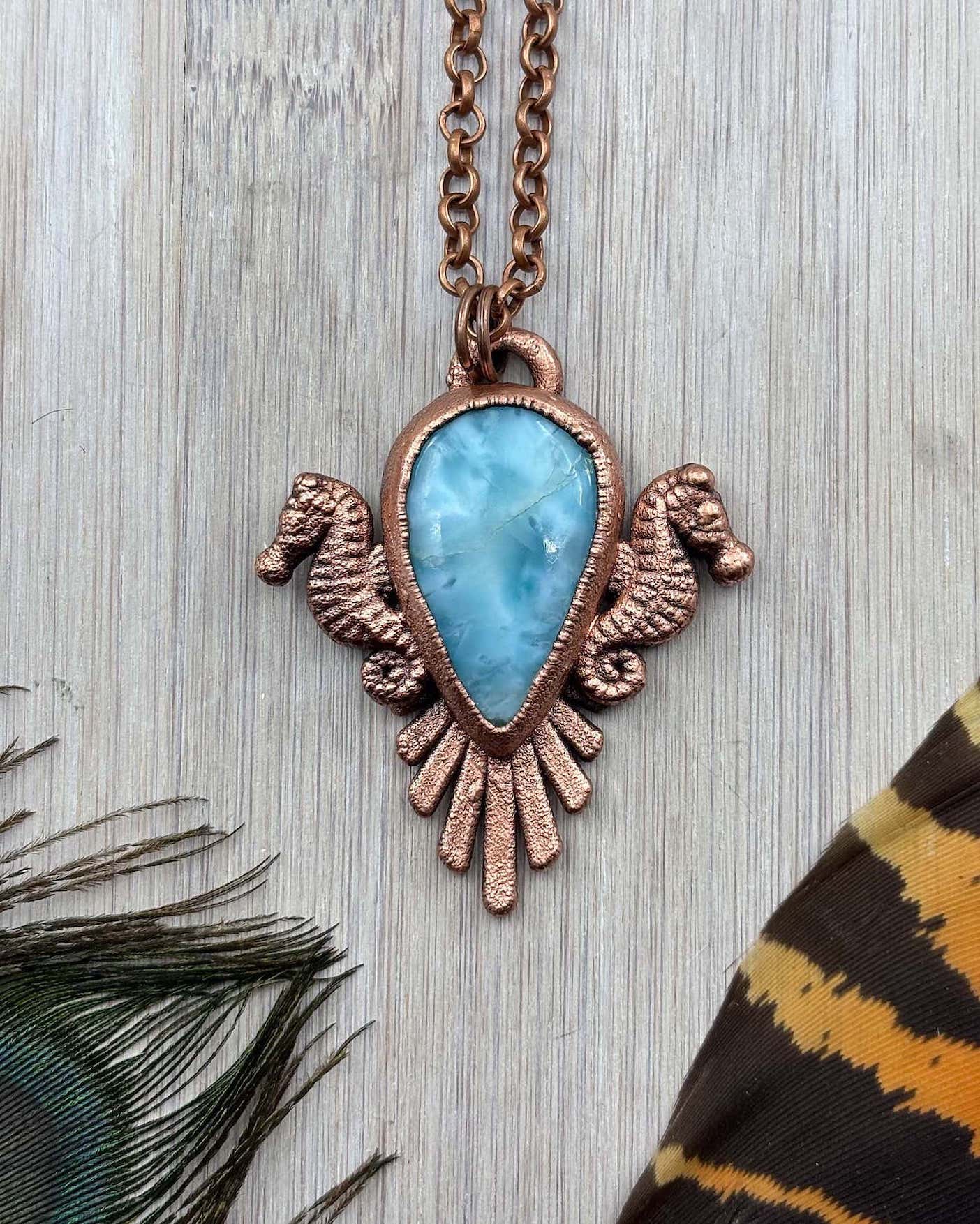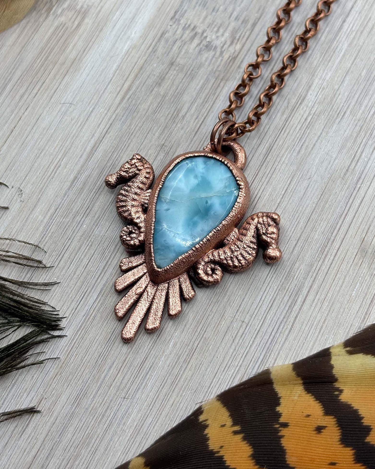 This seahorse pendant features a gorgeous Larimar. It has been copper plated using the art of electroforming.