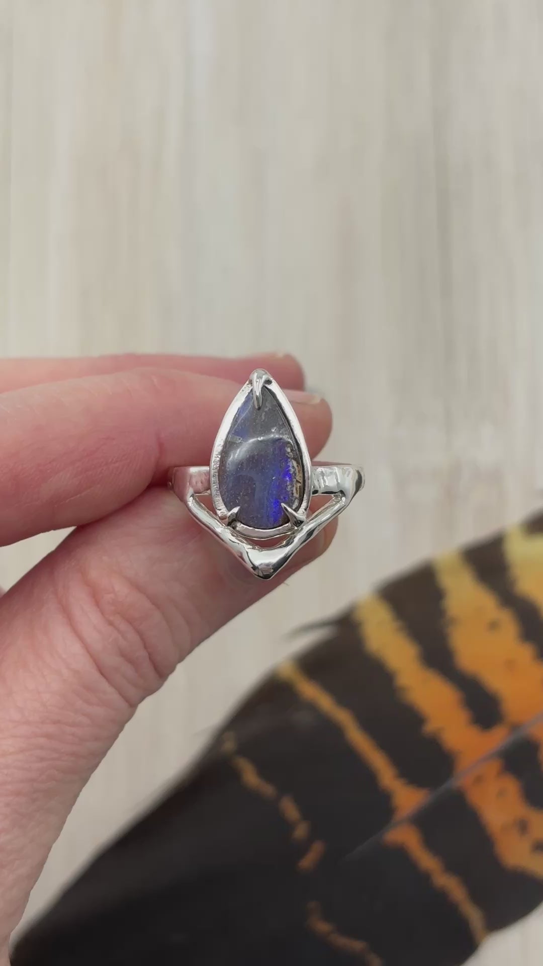 Pear Boulder Opal Sterling Silver Wishbone Ring - size 7 US