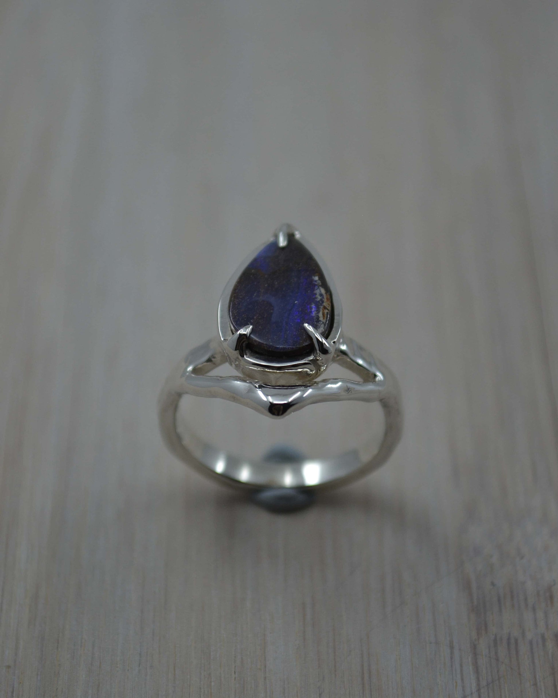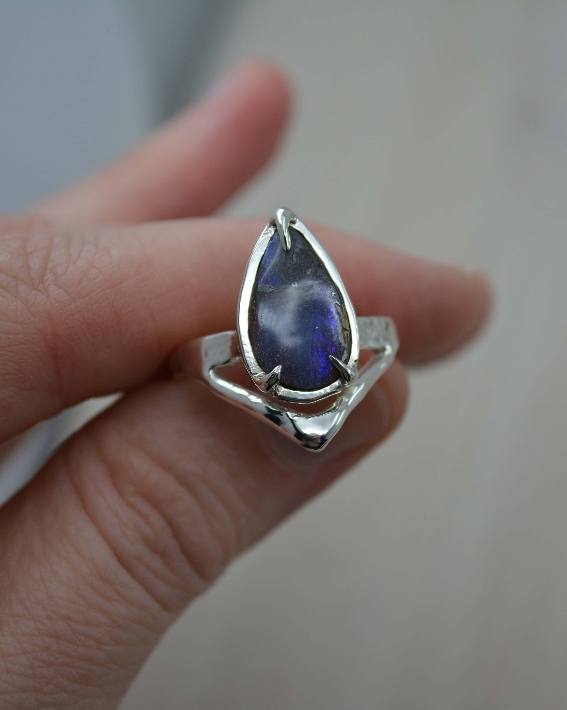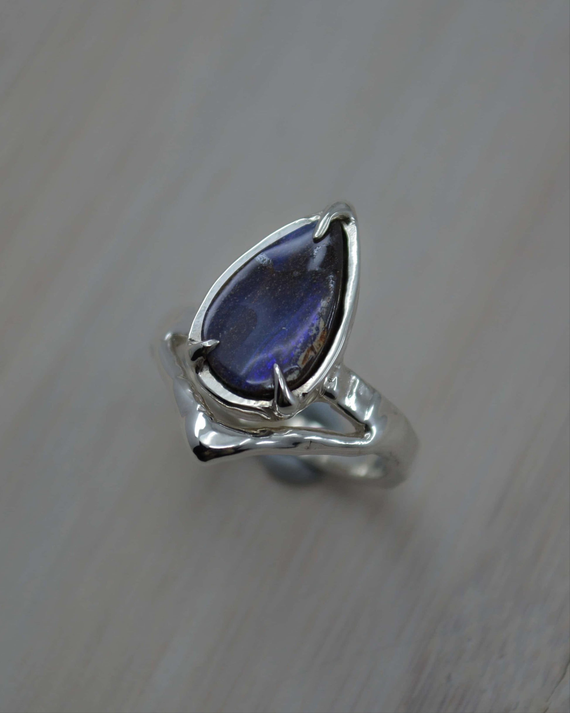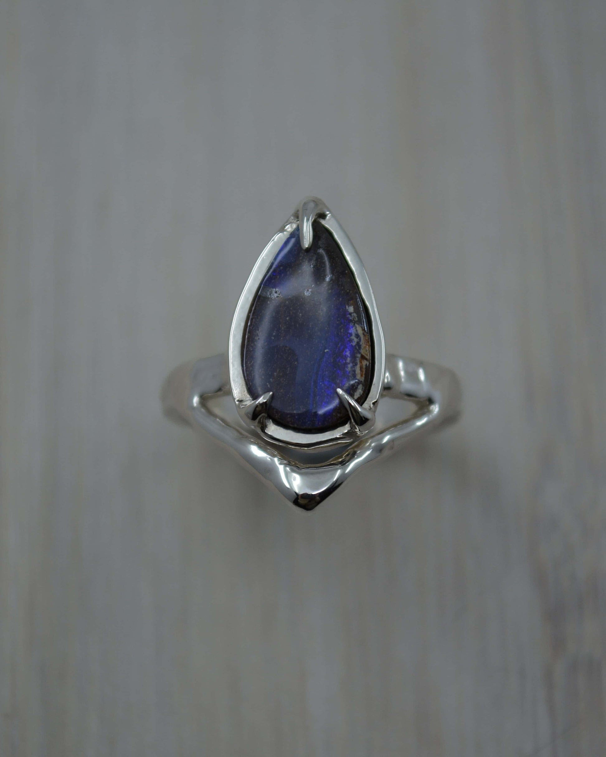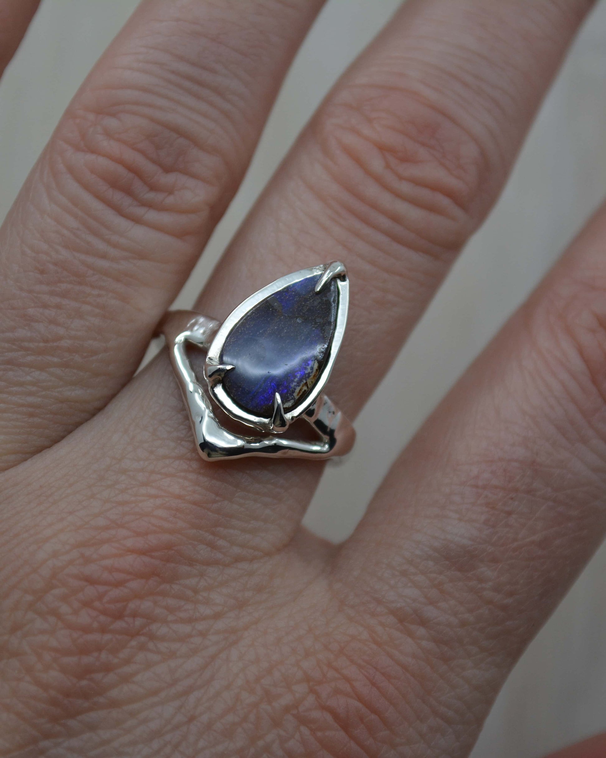 This Pear Boulder Opal Sterling Silver Wishbone Ring has been hand sculpted using the lost wax jewellery method & cast in solid sterling silver. It was created with the intention of a wavy effect on the band, giving its unique look.