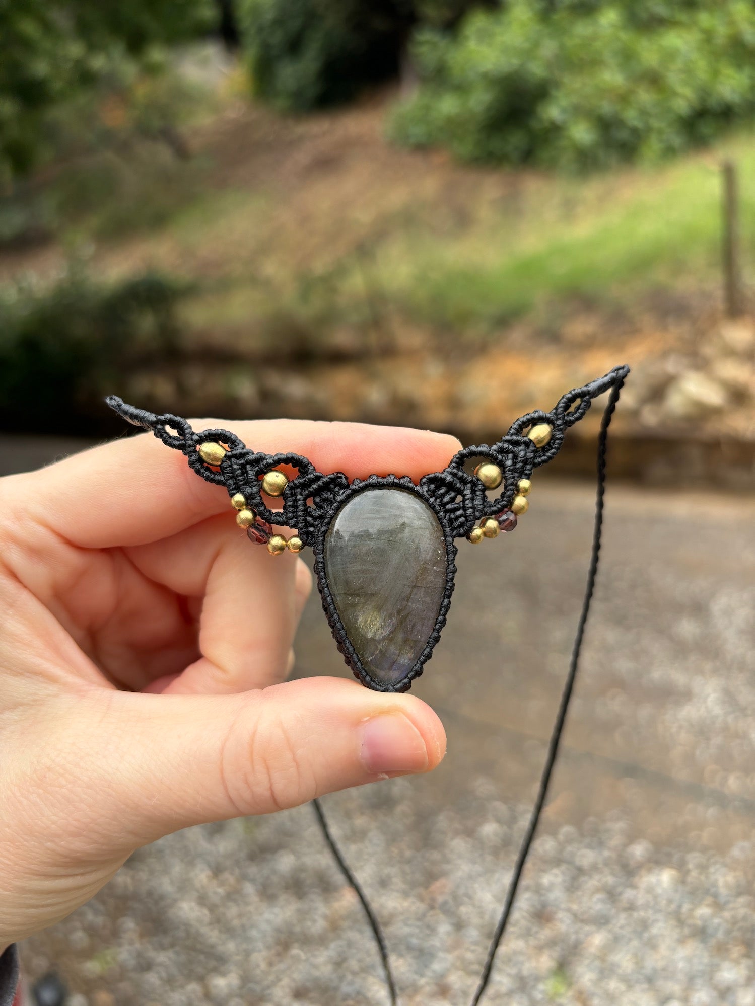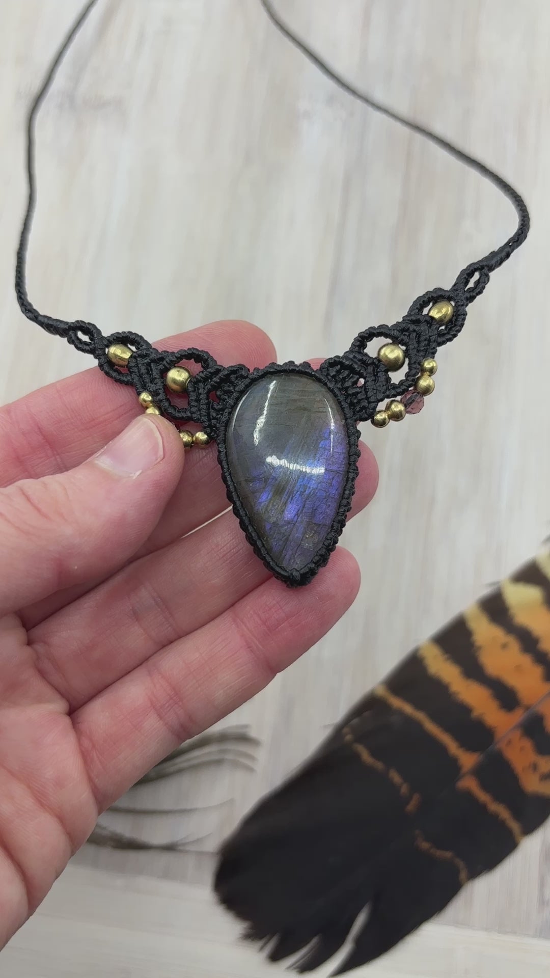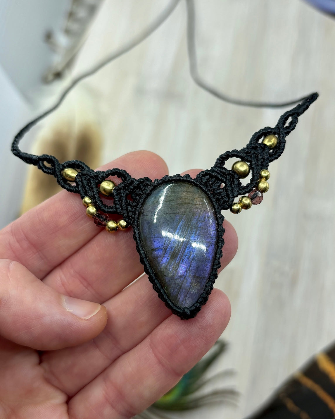 This Purple Labradorite macrame bib necklace has been hand made using the art of knot tying called macrame.