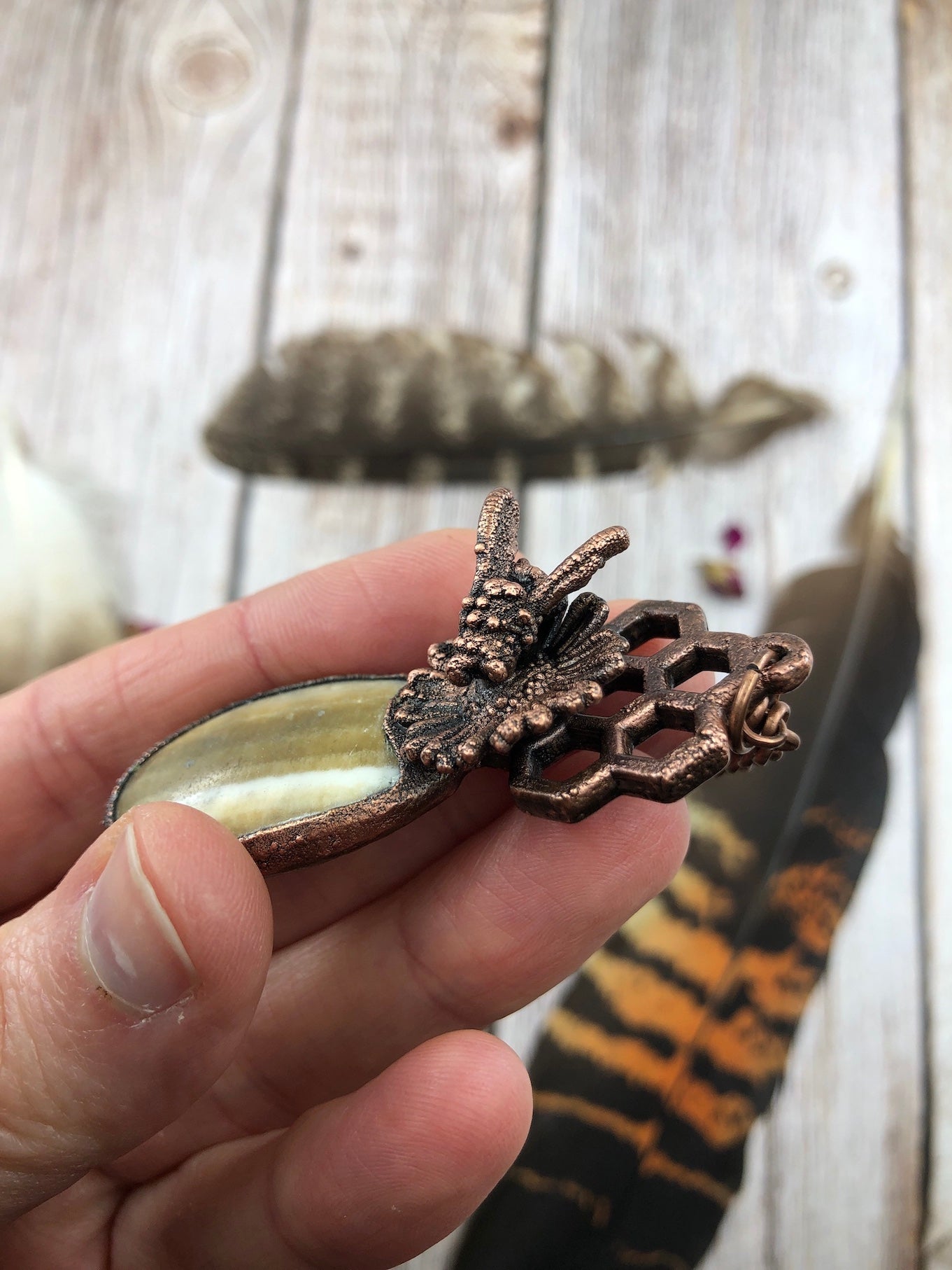 This bee pendant features a beautiful Honey Calcite, a real ethically sourced bee & a real daisy picked from my garden, which have been copper plated using the art of electroforming.