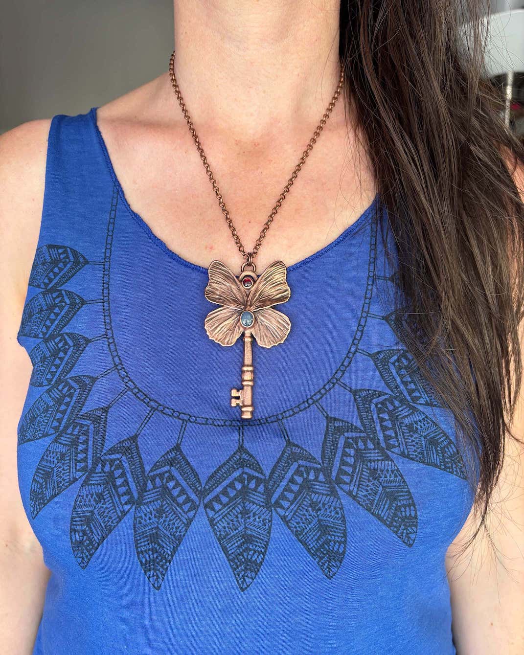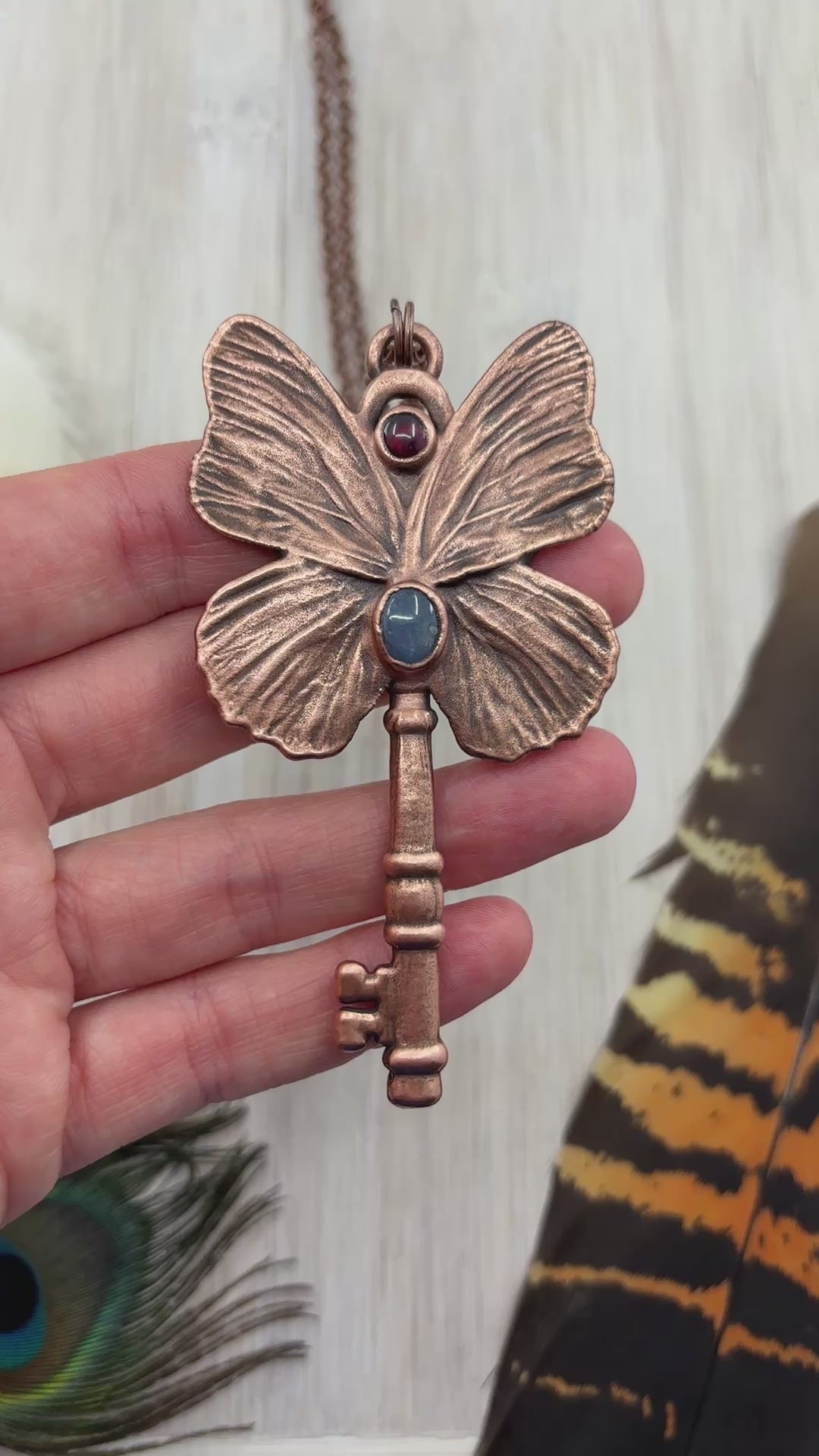 This butterfly key necklace features a real ethically sourced butterfly wings paired with a beautiful Blue Sapphire & Garnet. It has been copper plated using the art of electroforming, showcasing unique handmade jewellery & truly one of a kind!