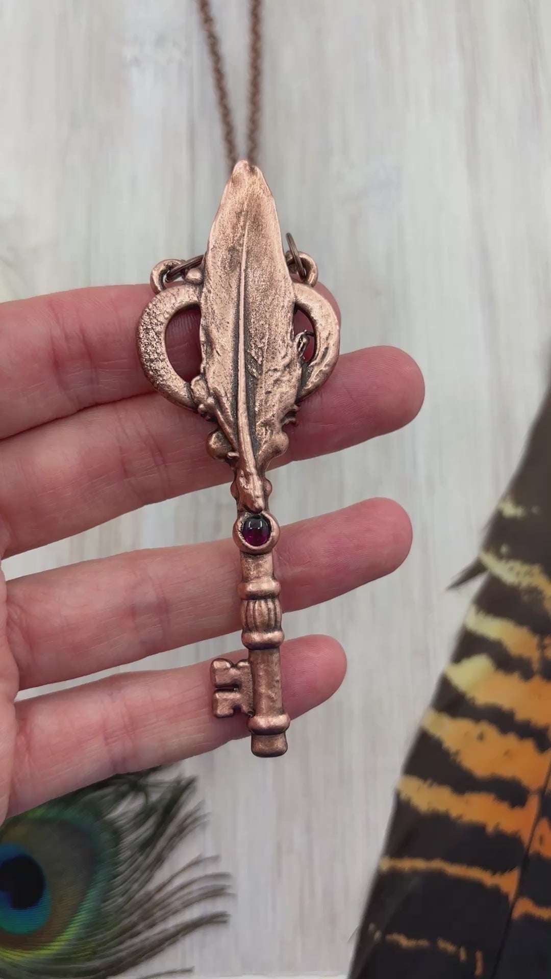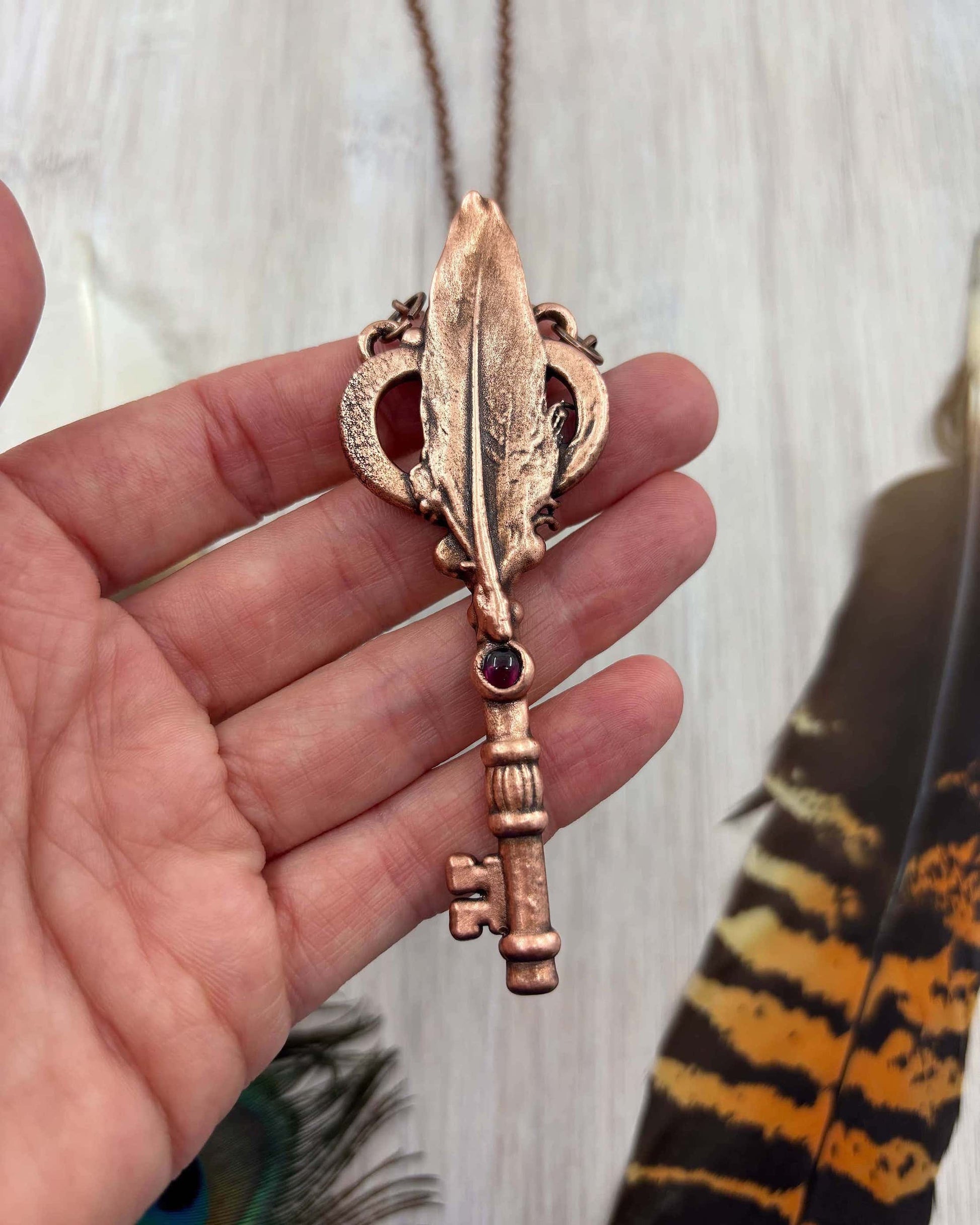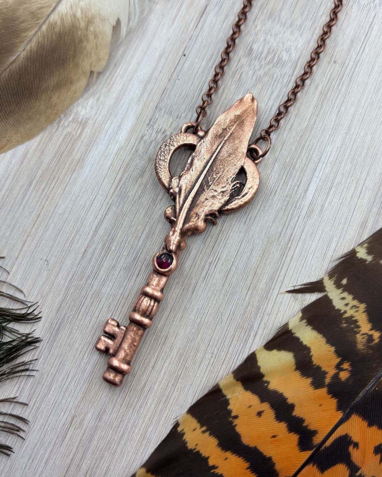 This feather key necklace features a real feather paired with a beautiful Garnet. It has been copper plated using the art of electroforming, showcasing unique handmade jewellery & truly one of a kind!