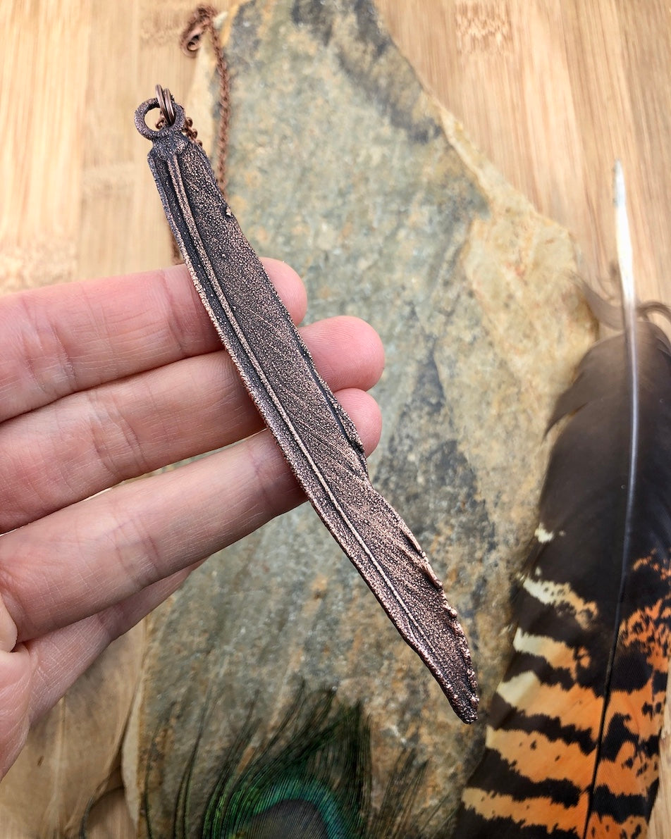 This feather necklace features a beautiful Rainbow Moonstone & feather that was gifted to me, which have been copper plated using the art of electroforming. The feather is coated with top coat clear nail polish to help protect it.