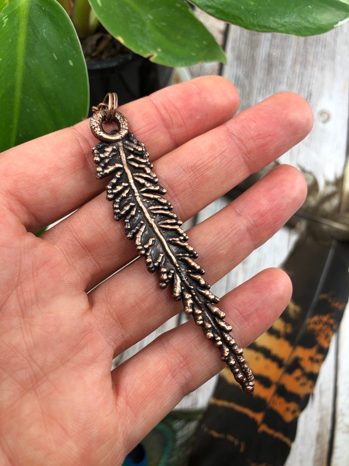 This leaf pendant features a REAL fern leaf which has been copper plated using the art of electroforming. Please be aware that extra care must be taken with any piece featuring organic materials such as feathers, leaves, sticks, flowers etc, please do not bend & always handle with care