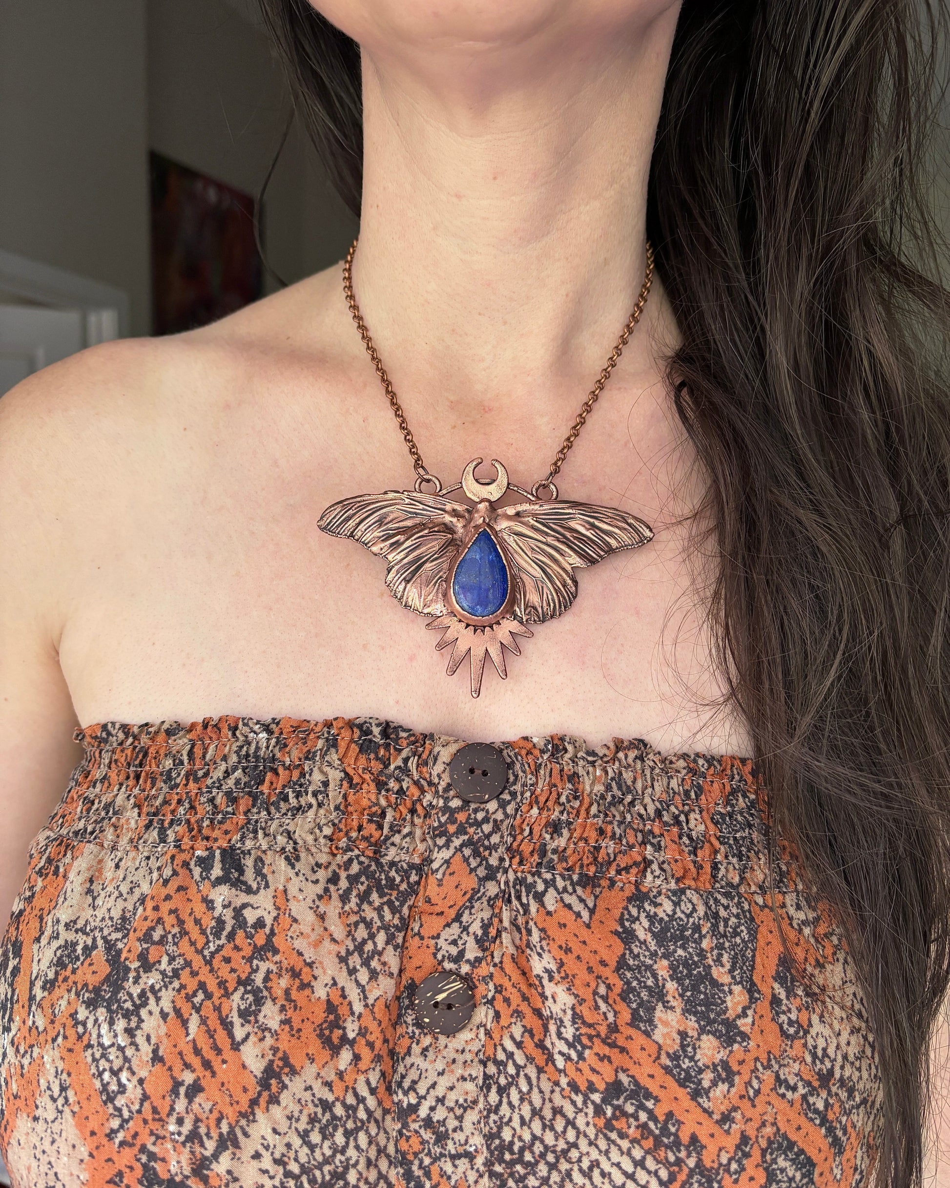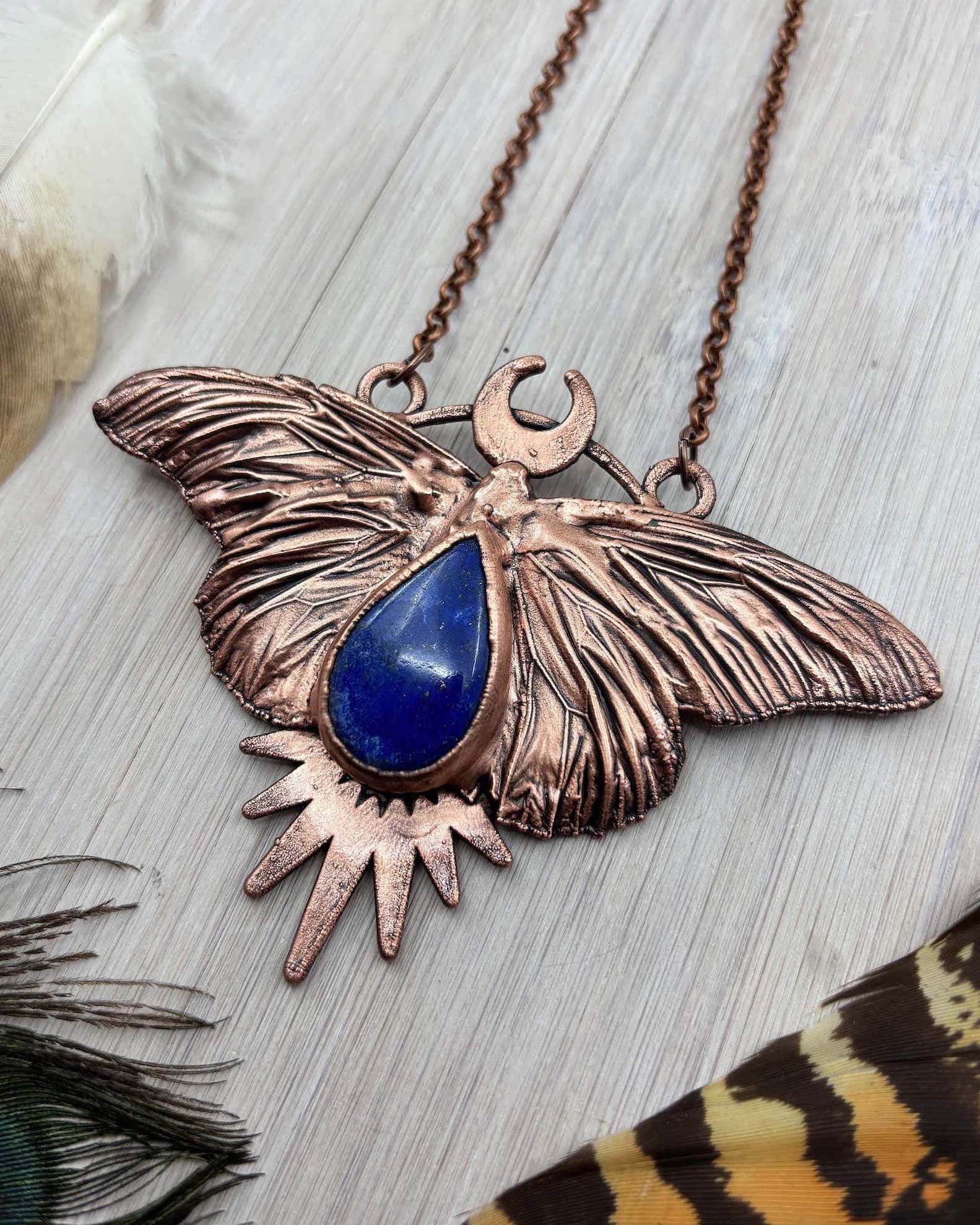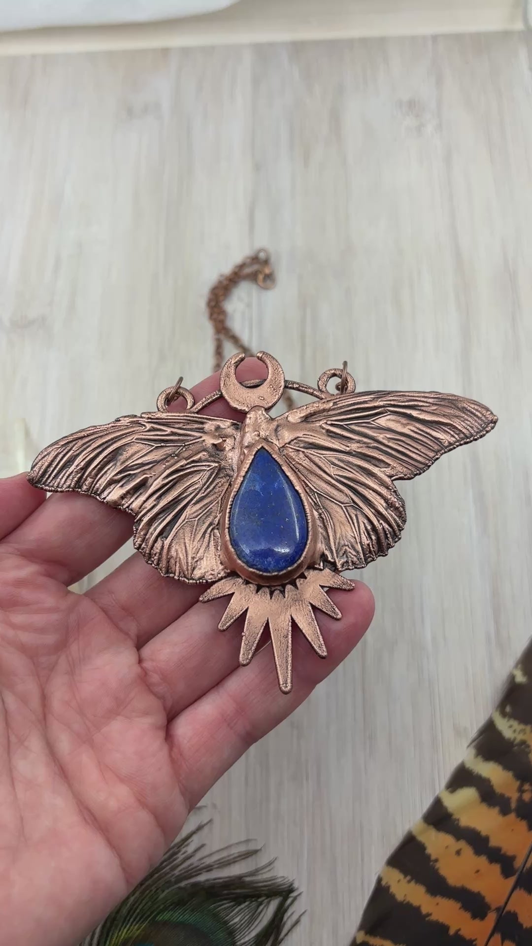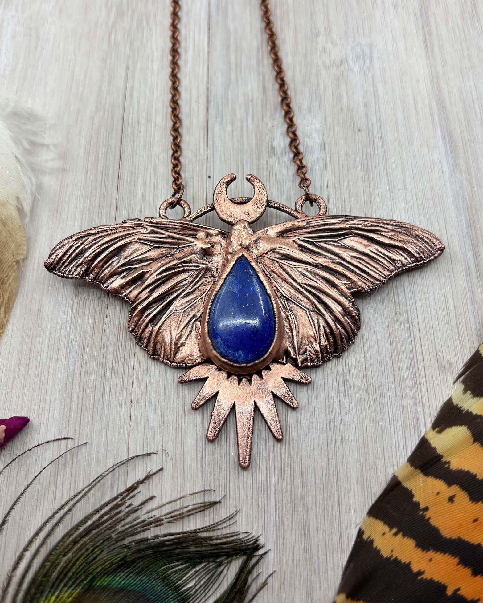 This butterfly necklace features a real ethically sourced Monarch butterfly paired with a beautiful Lapis Lazuli. It has been copper plated using the art of electroforming, encasing the butterfly in copper forever, showcasing unique handmade jewellery & truly one of a kind!