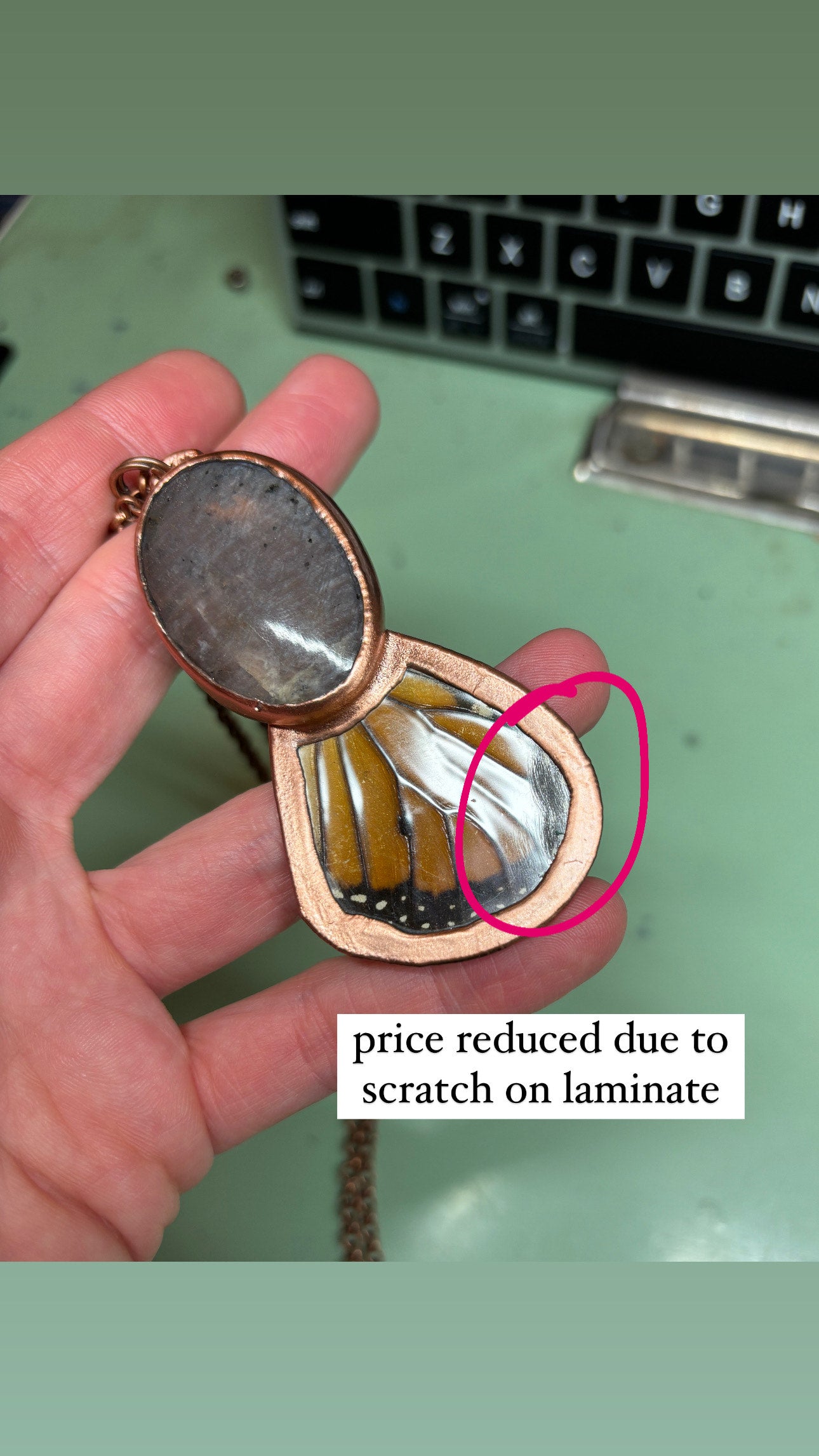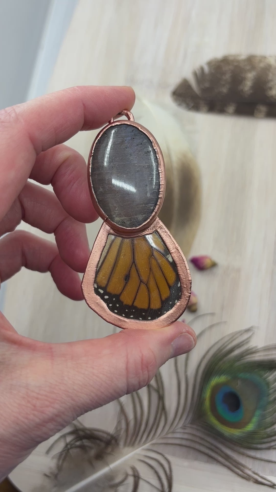 This butterfly necklace features a real ethically sourced Monarch Butterfly Wing paired with a Sunstone / Rainbow Moonstone for its crystal healing energy. It has been copper plated using the art of electroforming, showcasing unique handmade jewellery.