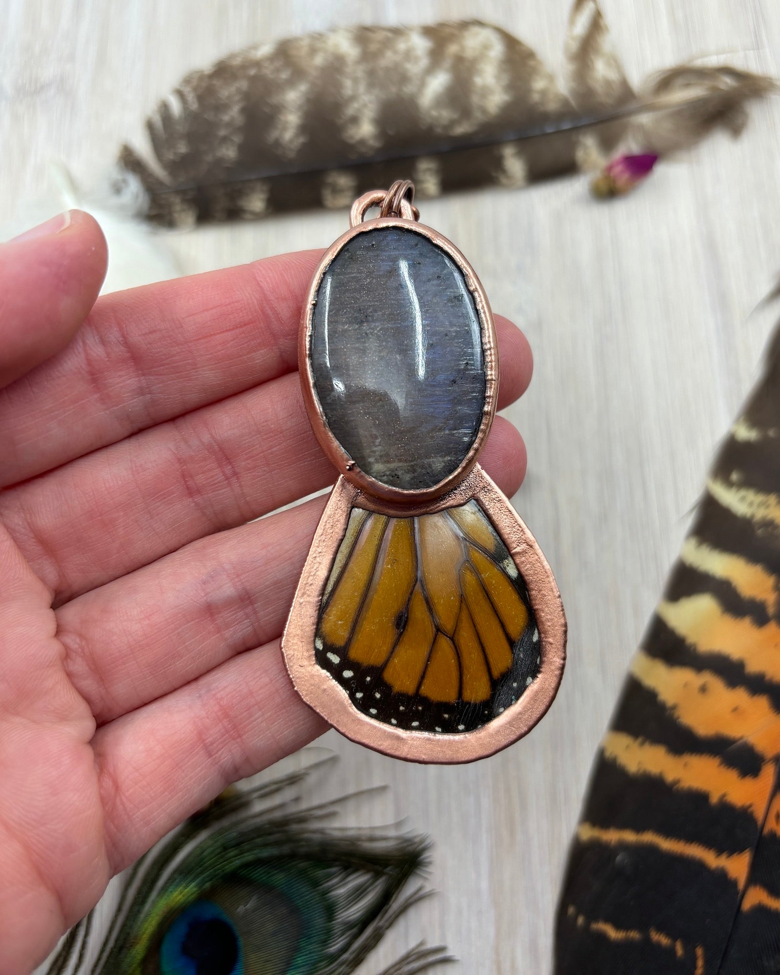 REAL Monarch Butterfly Wing Pendant with sunstone / Moonstone - Electroformed