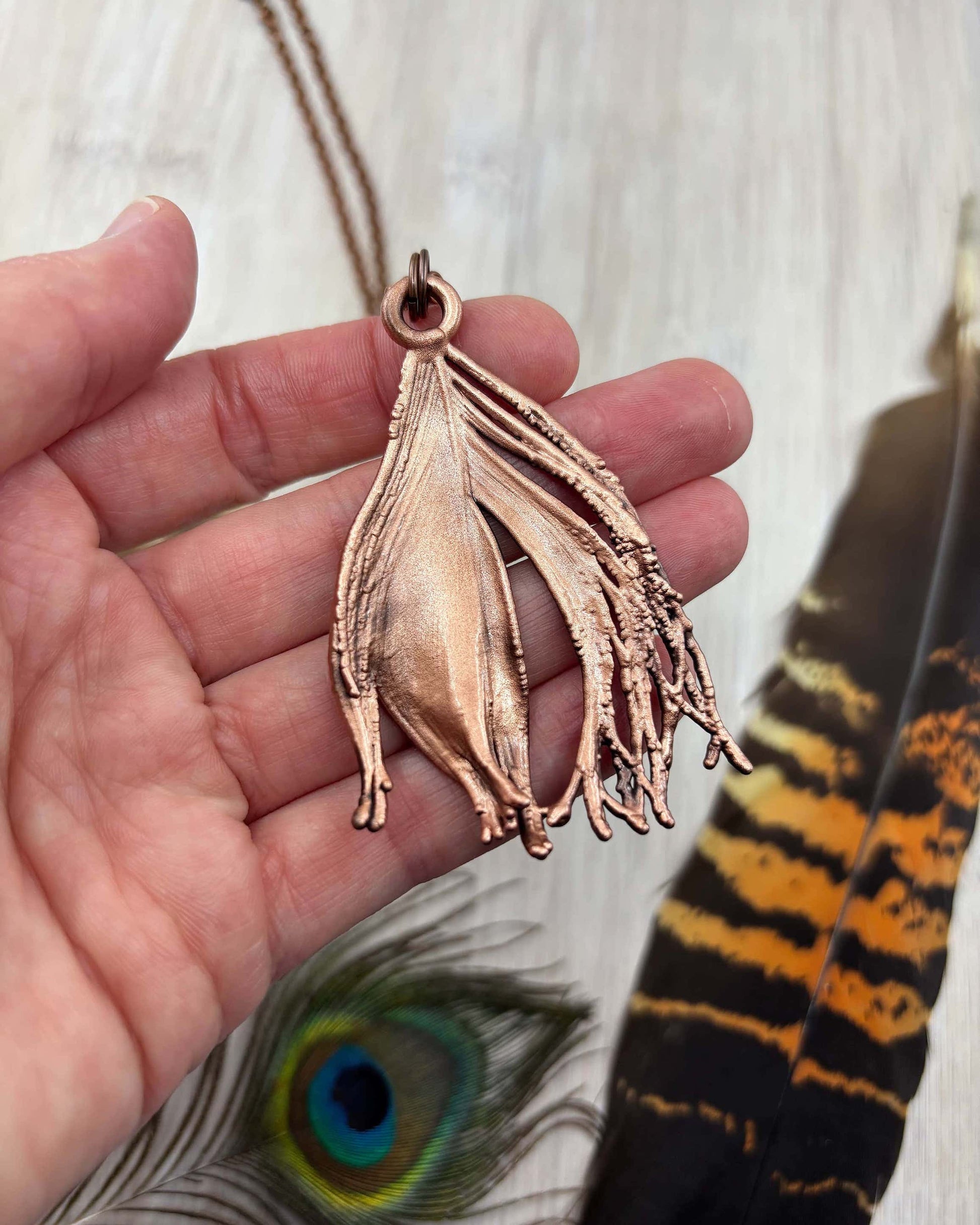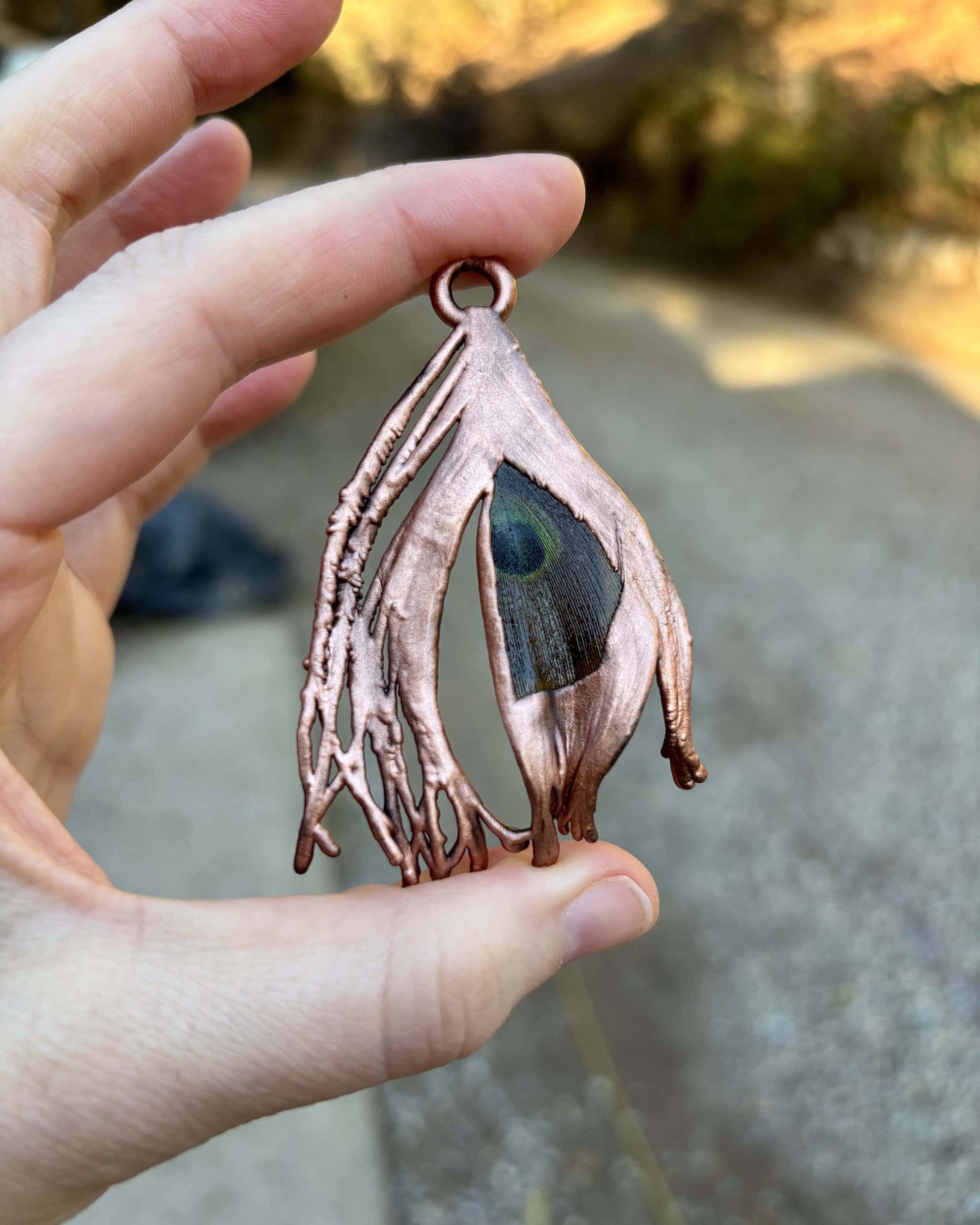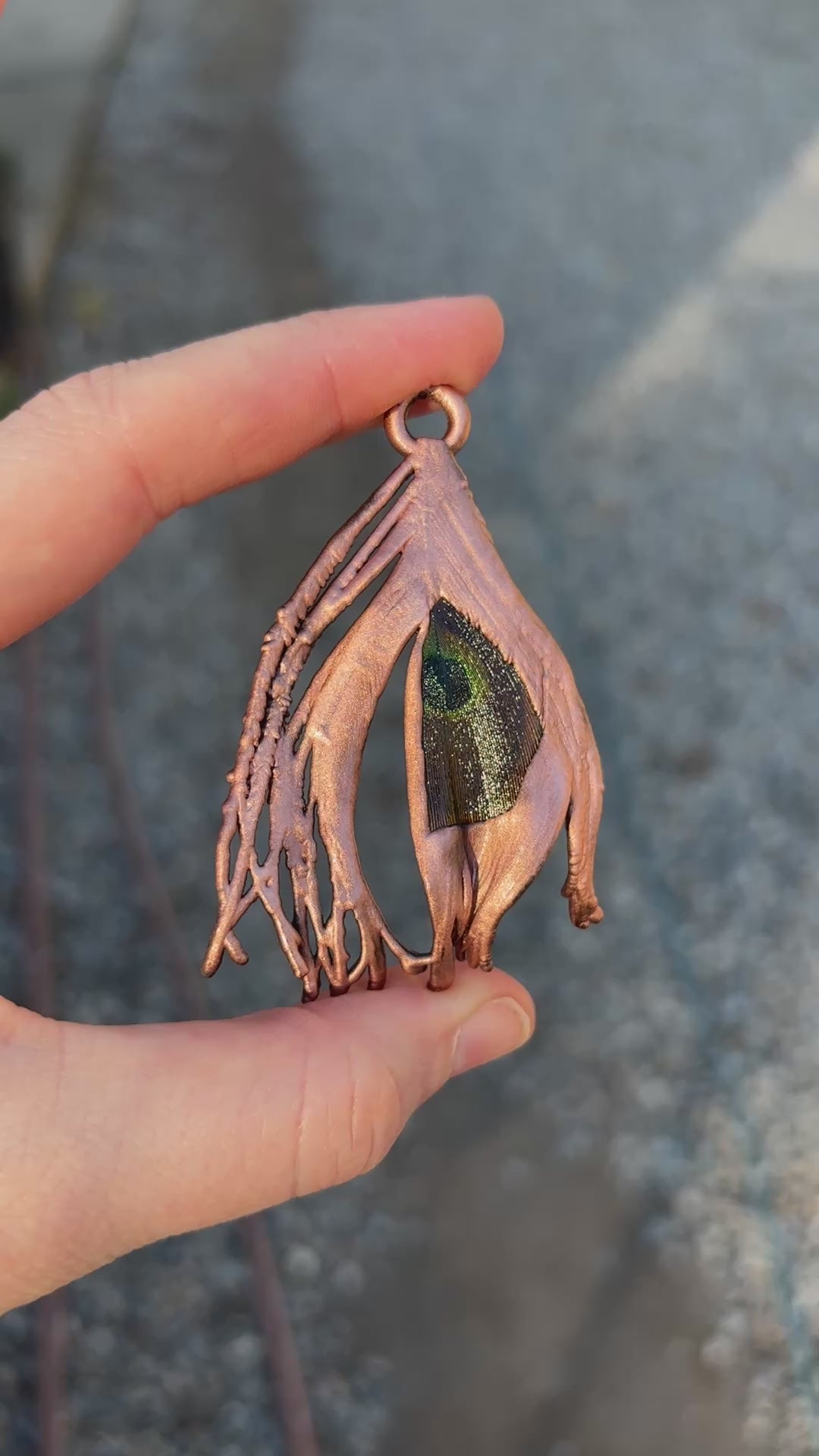 This feather Peacock Feather necklace features a real peacock feather. It has been copper plated using the art of electroforming, showcasing unique handmade jewellery & truly one of a kind!