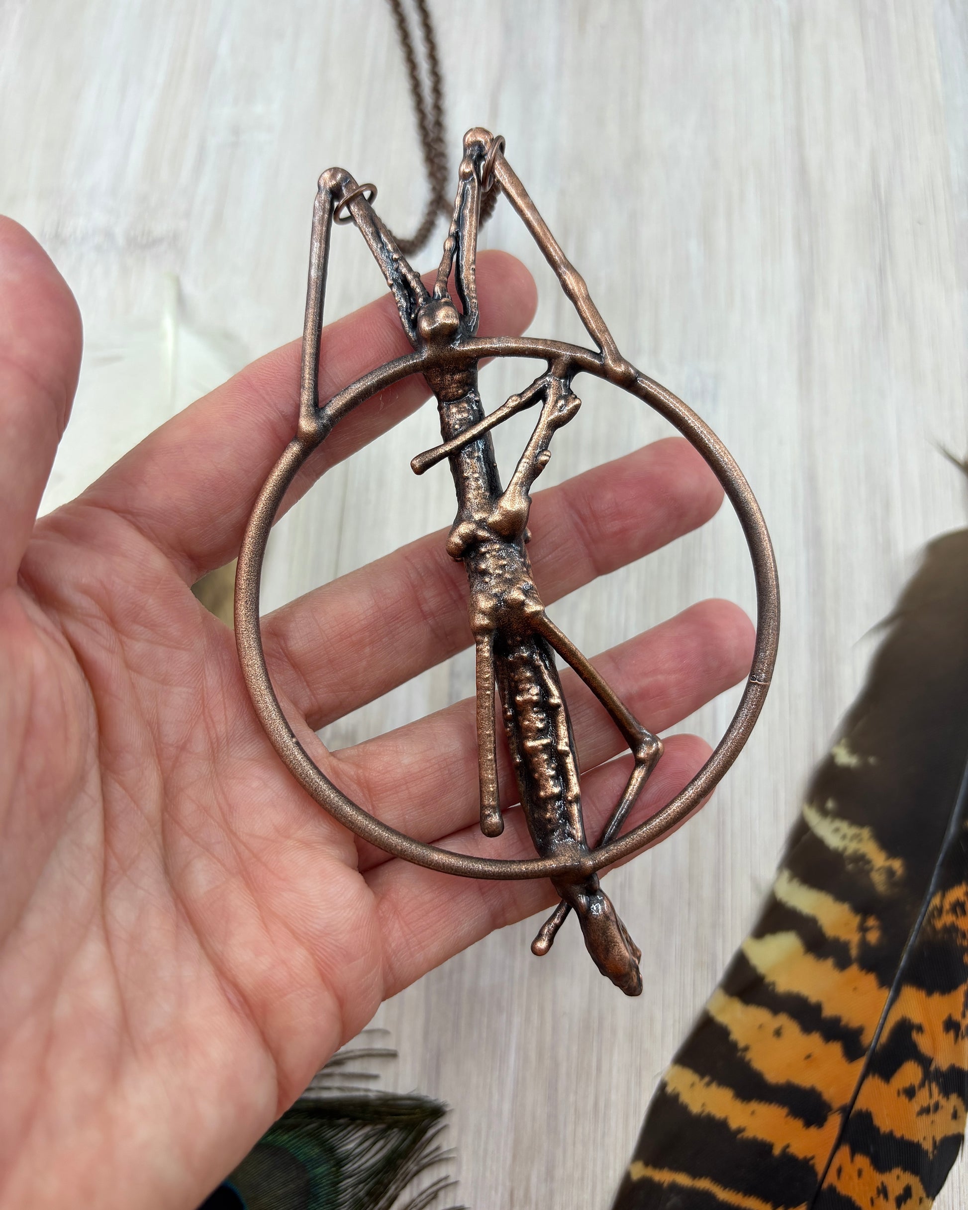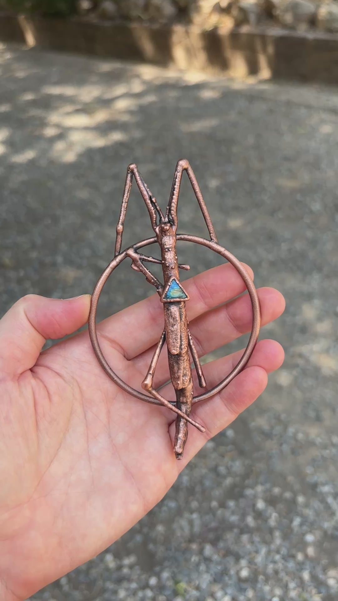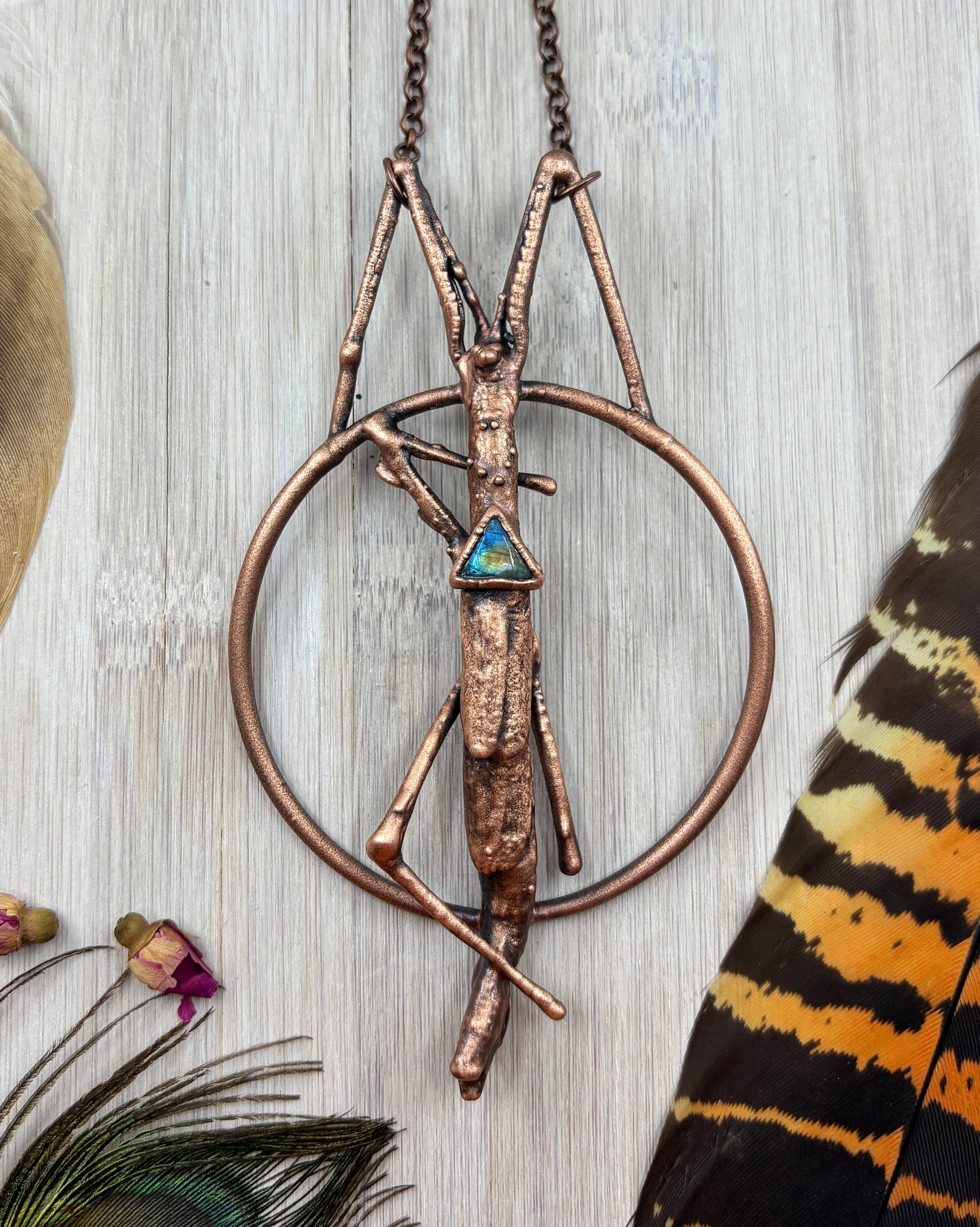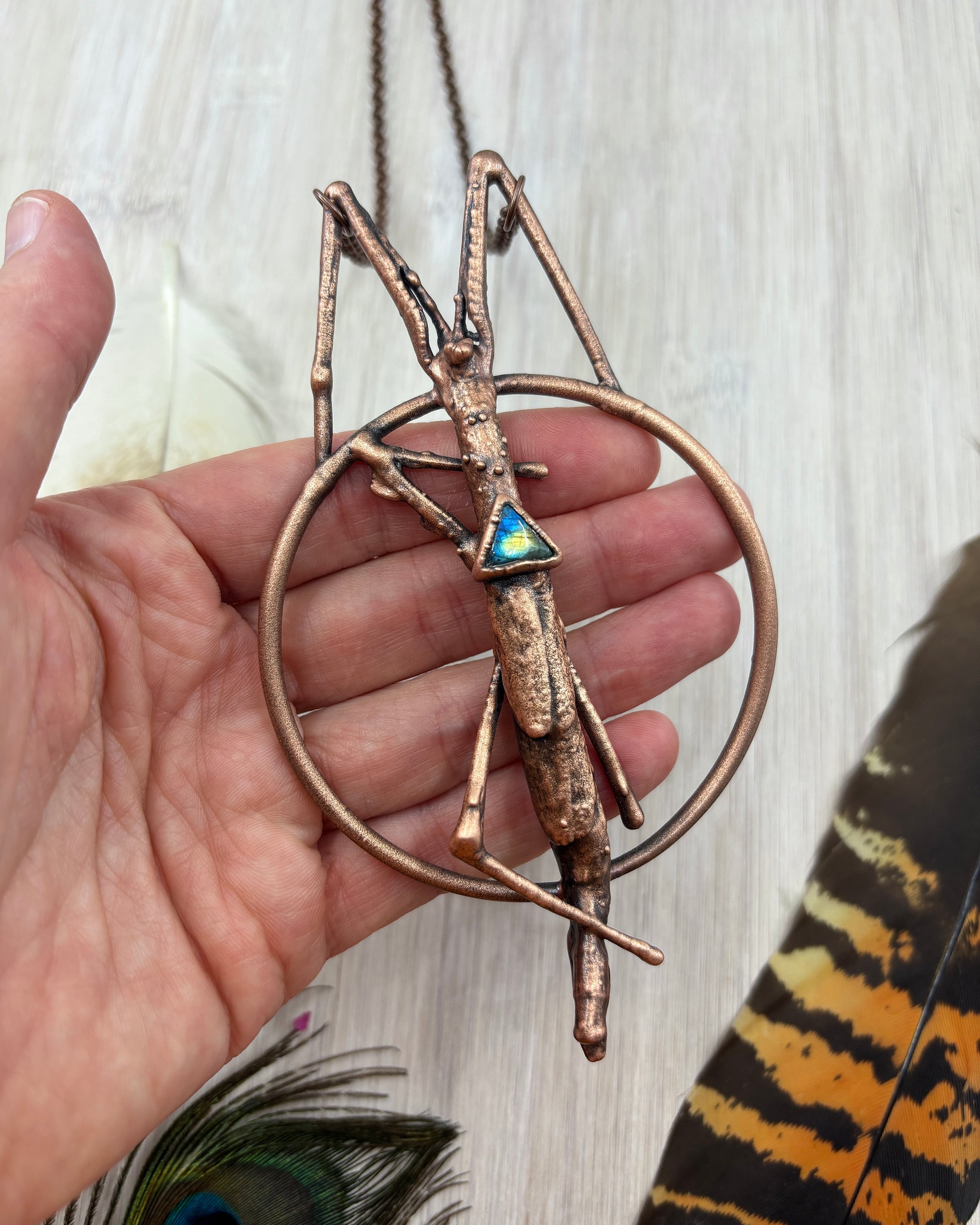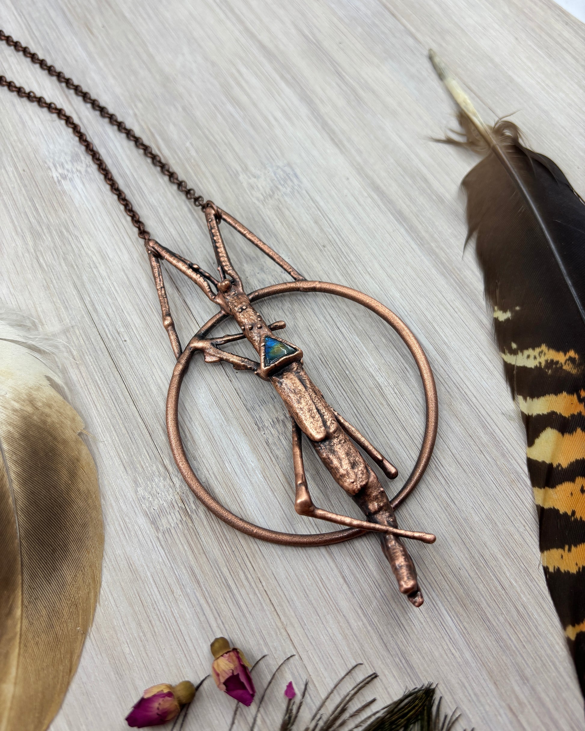 This piece features a real ethically sourced stick insect with a triangle labradorite. It has been copper plated using the art of electroforming, showcasing unique handmade jewellery.