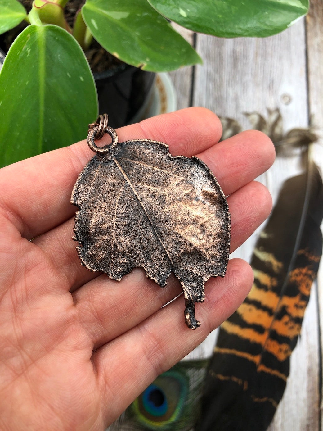 This leaf pendant features a REAL tattered leaf which has been copper plated using the art of electroforming. Please be aware that extra care must be taken with any piece featuring organic materials such as feathers, leaves, sticks, flowers etc, please do not bend & always handle with care