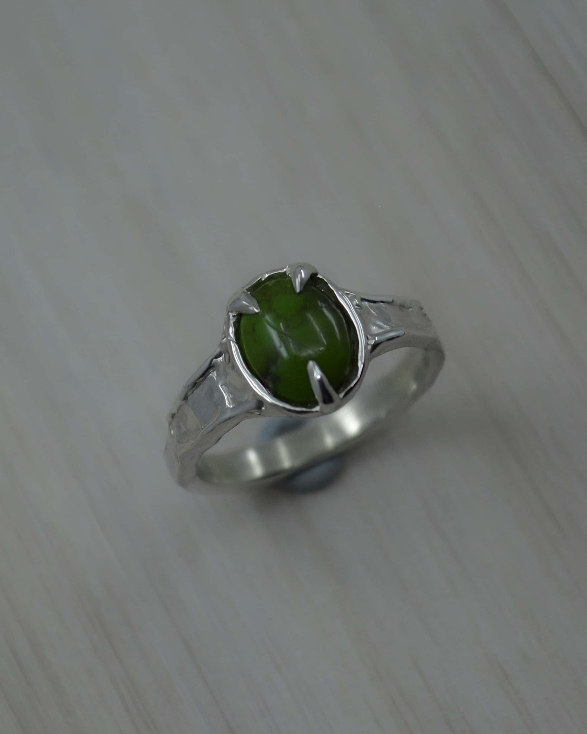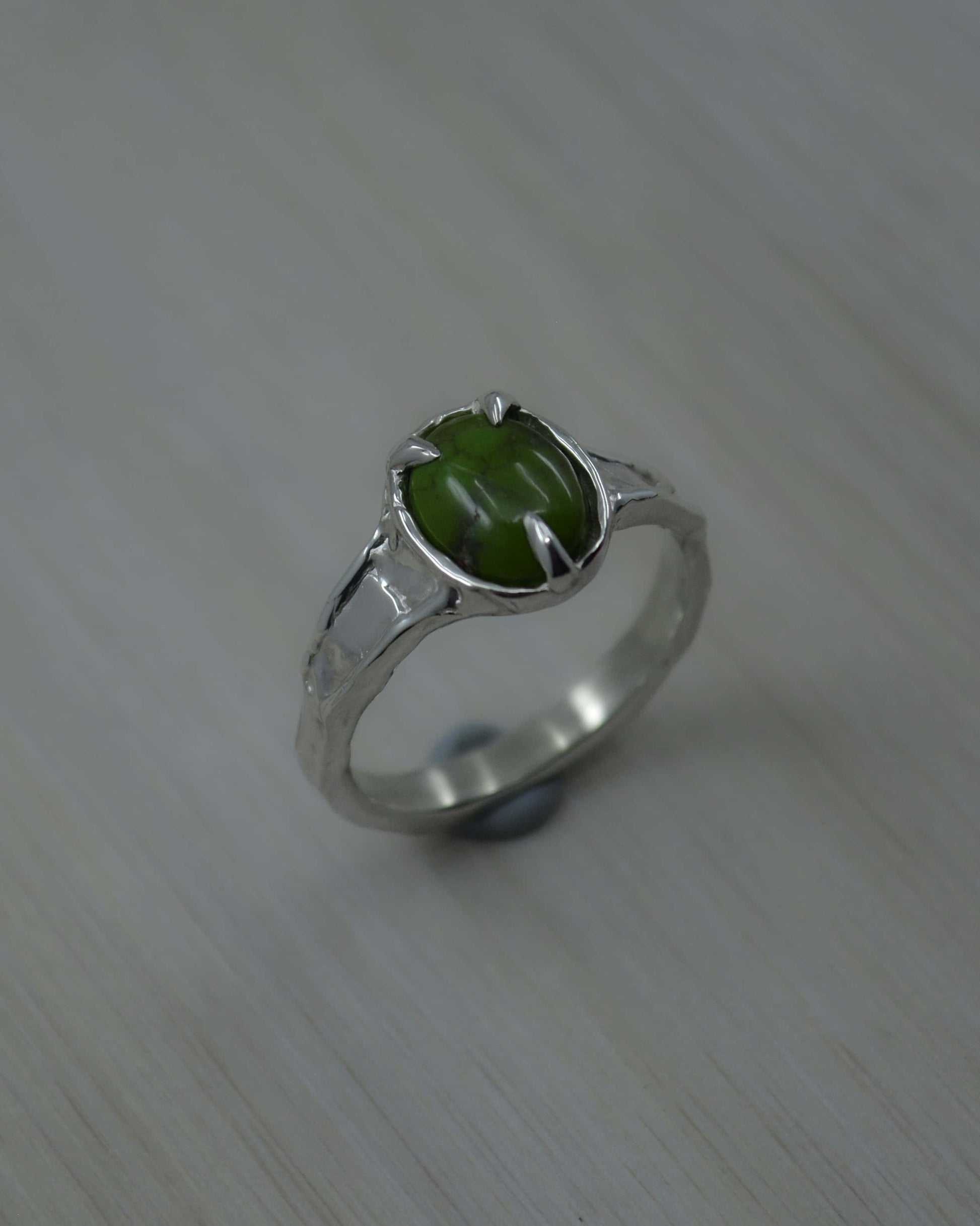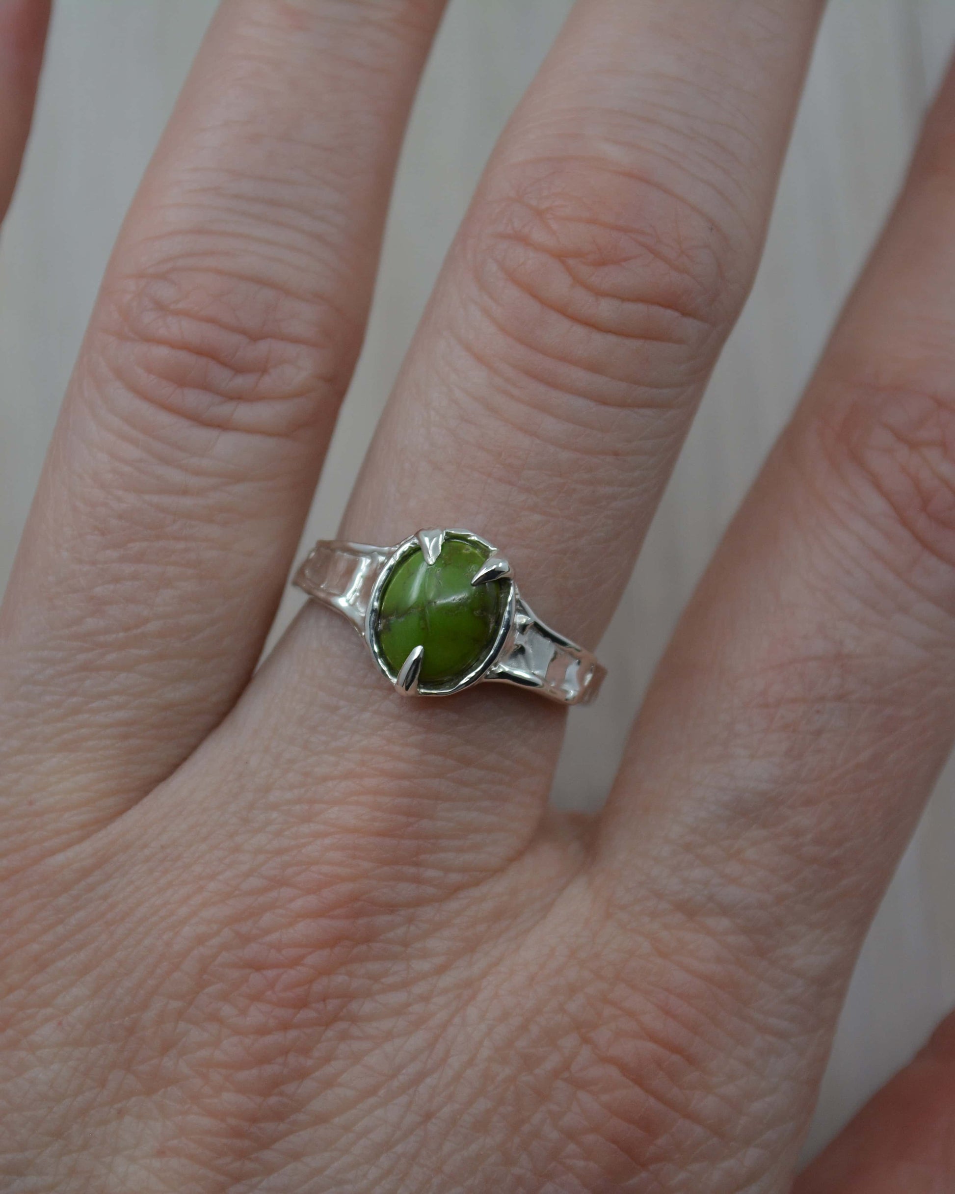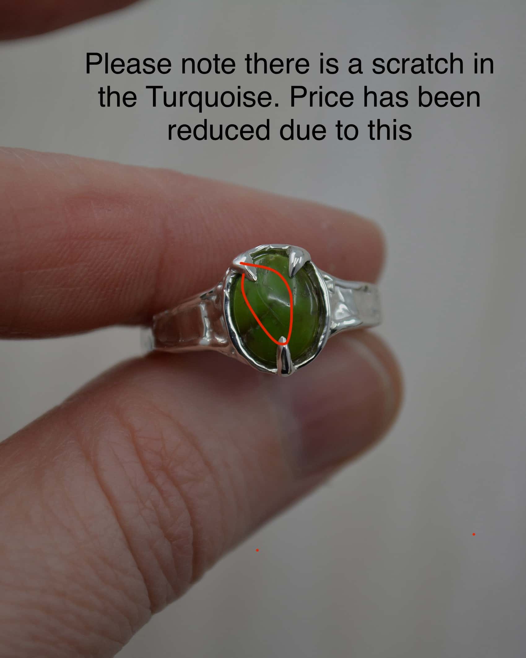 This gorgeous Sonoran Gold Green Turquoise Sterling Silver Textured Ring has been hand sculpted using the lost wax jewellery method & cast in solid sterling silver. It was created with the intention of a wavy effect on the band, giving its unique look.