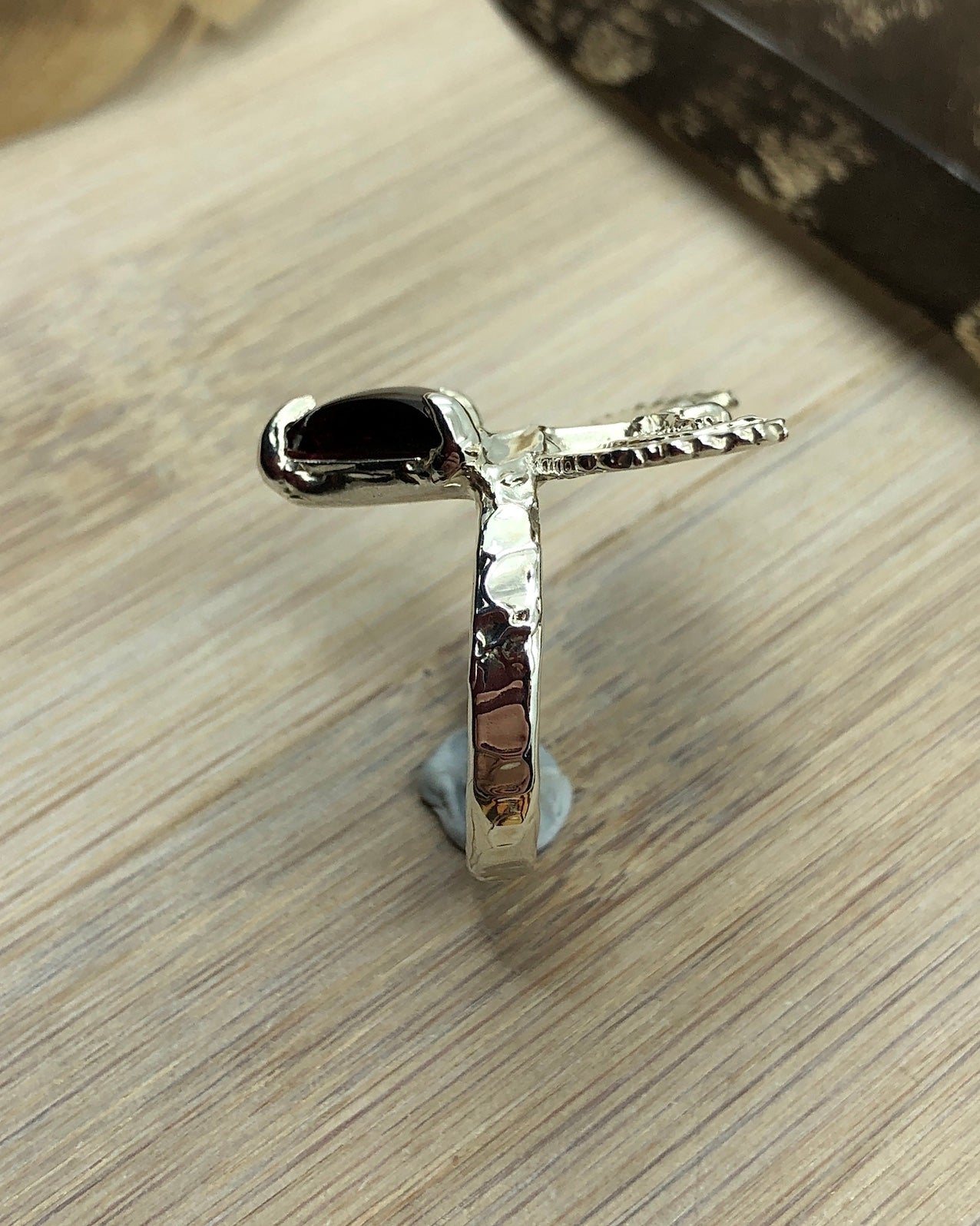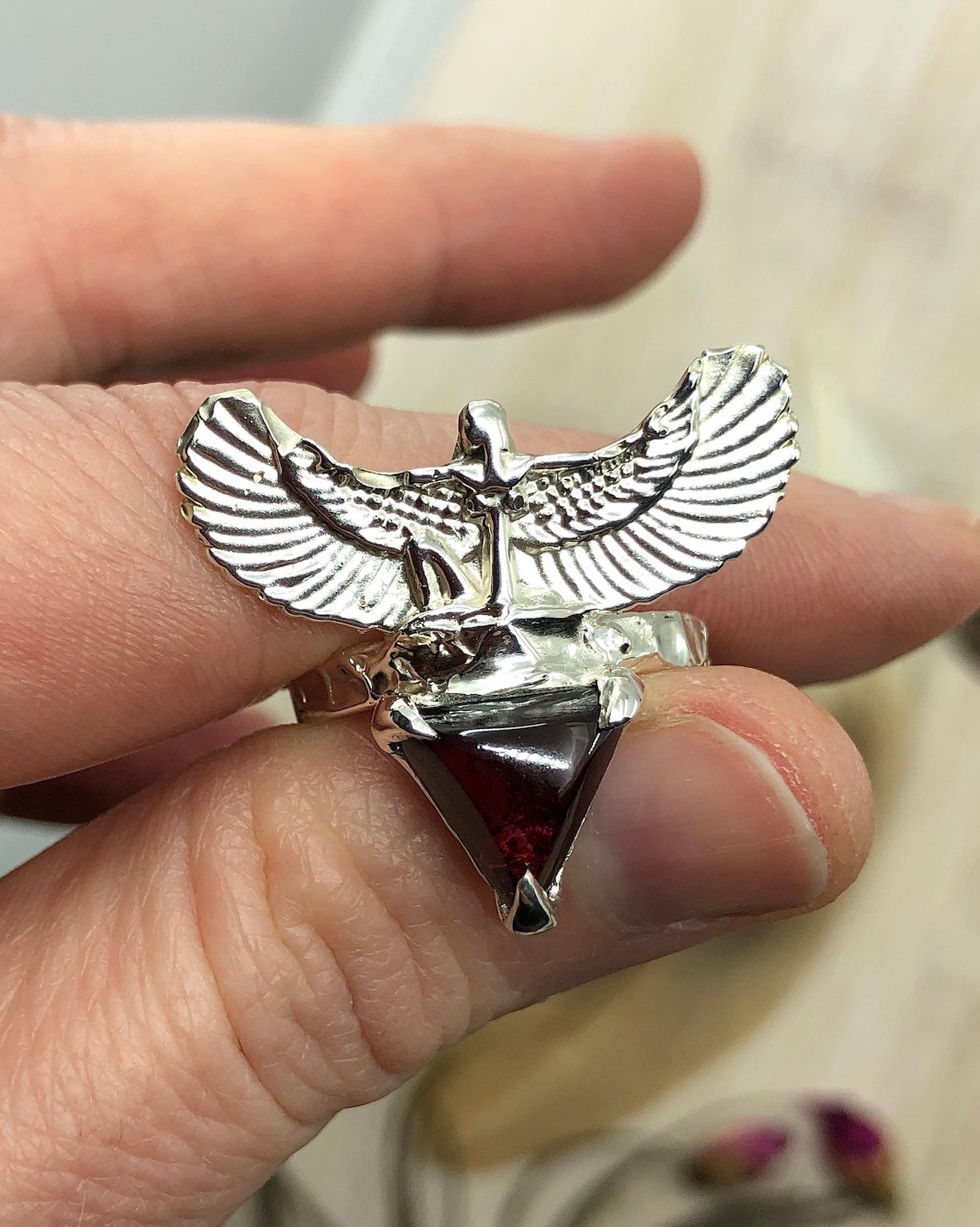 This Sterling Silver Egyptian Goddess triangle Garnet Ring has been hand sculpted using the lost wax jewellery method & cast in solid sterling silver. It has a molten texture bezel & band.