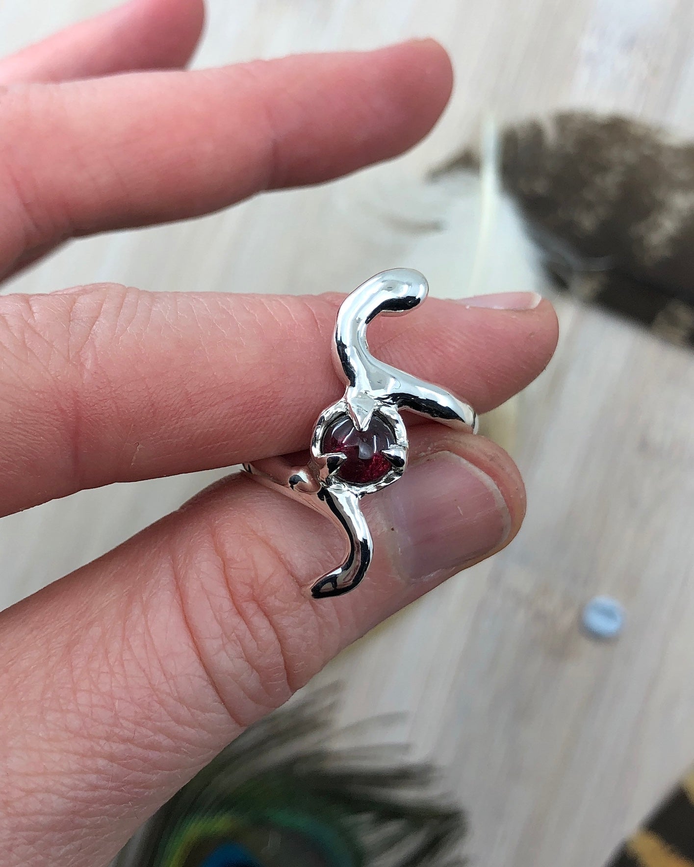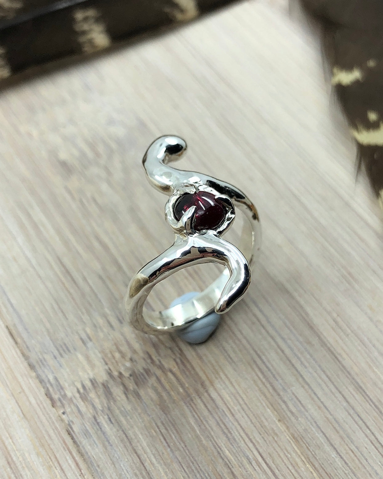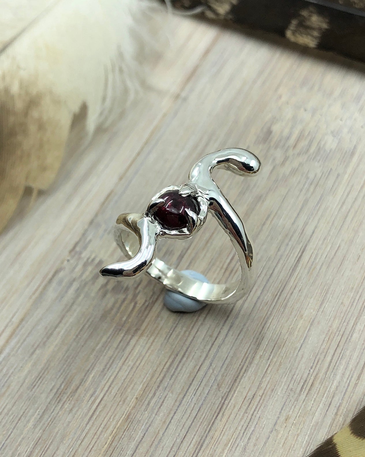 This Sterling Silver Garnet Snake Ring has been hand sculpted using the lost wax jewellery method & cast in solid sterling silver.