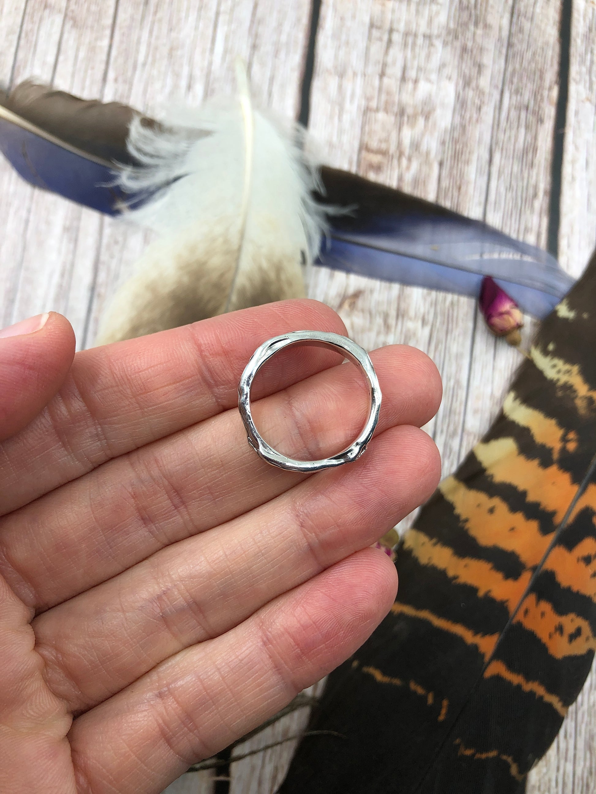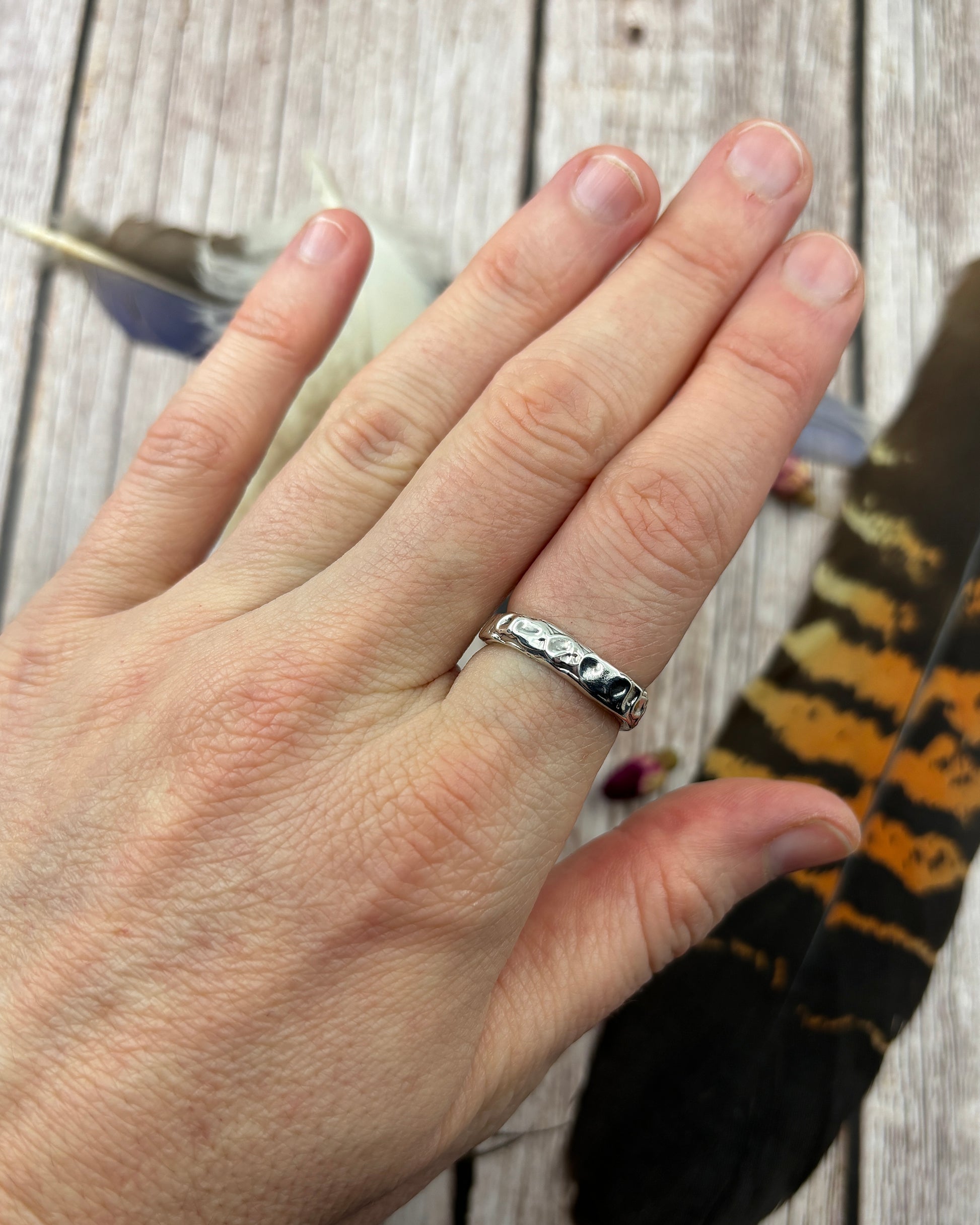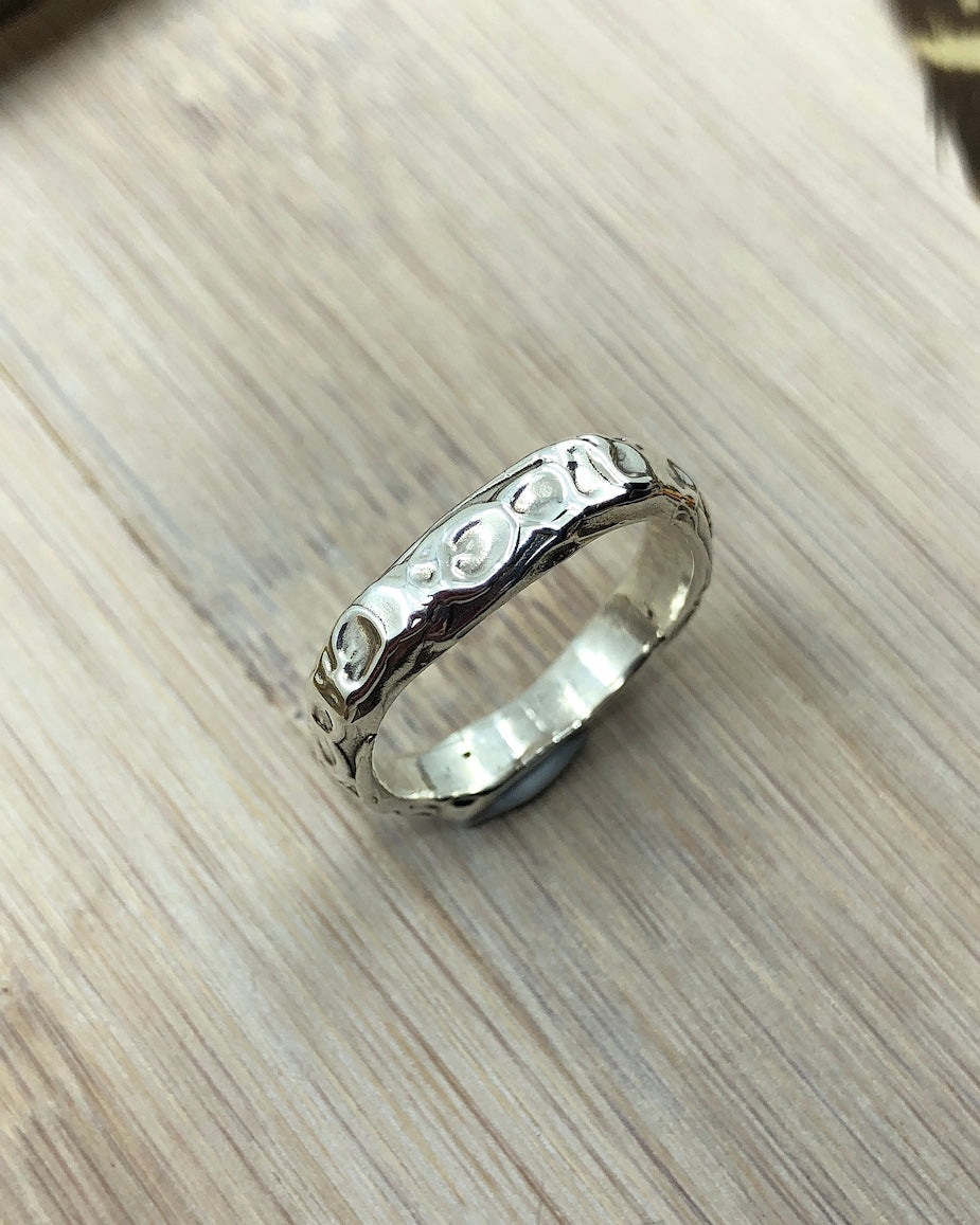 This Sterling Silver Band Ring has been hand sculpted using the lost wax jewellery method & cast in solid sterling silver. It has a molten texture effect giving its unique look.
