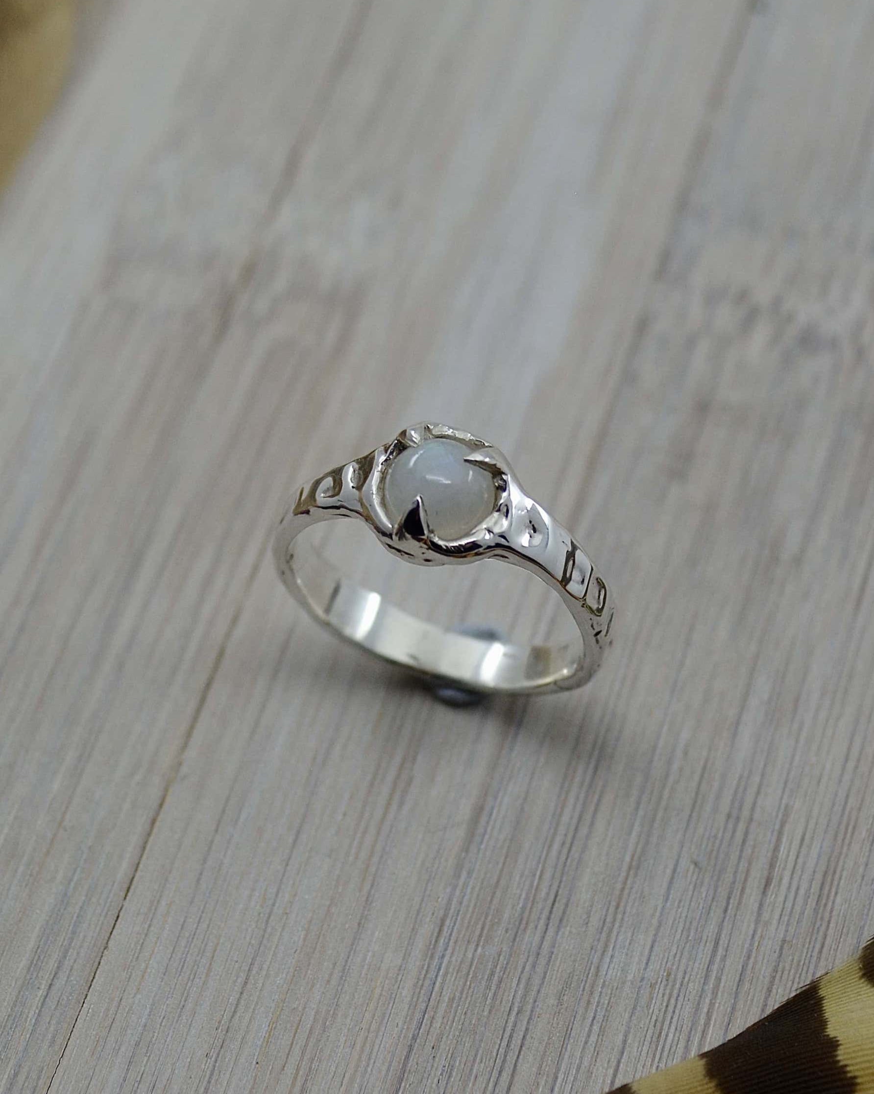 This Sterling Silver Rainbow Moonstone Molten Ring has been hand sculpted using the lost wax jewellery method & cast in solid sterling silver. It was created with the intention of a molten like effect, giving its unique look