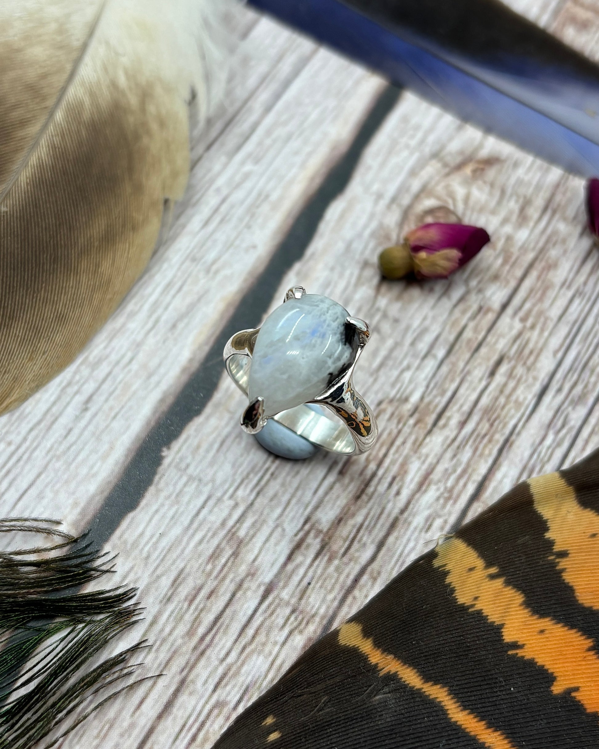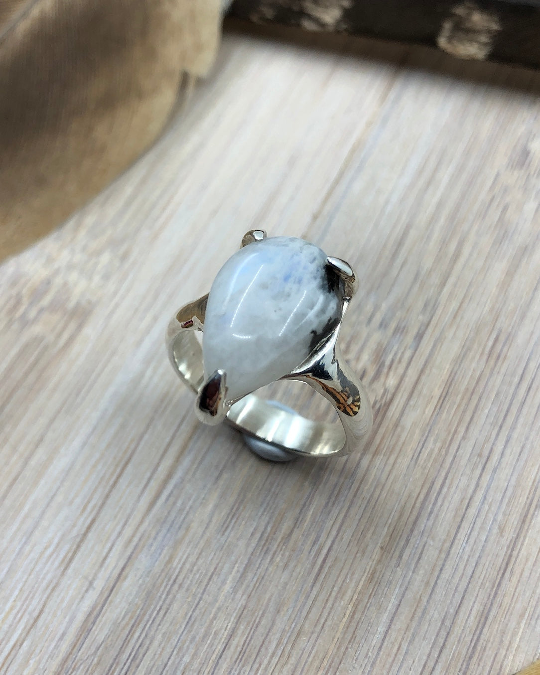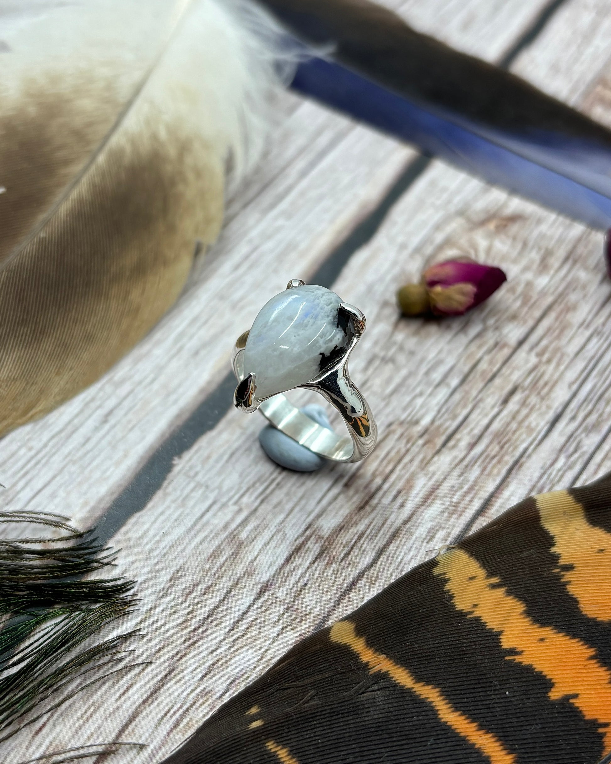 This Sterling Silver Rainbow Moonstone Ring (minimal flash, see video) has been hand sculpted using the lost wax jewellery method & cast in solid sterling silver.