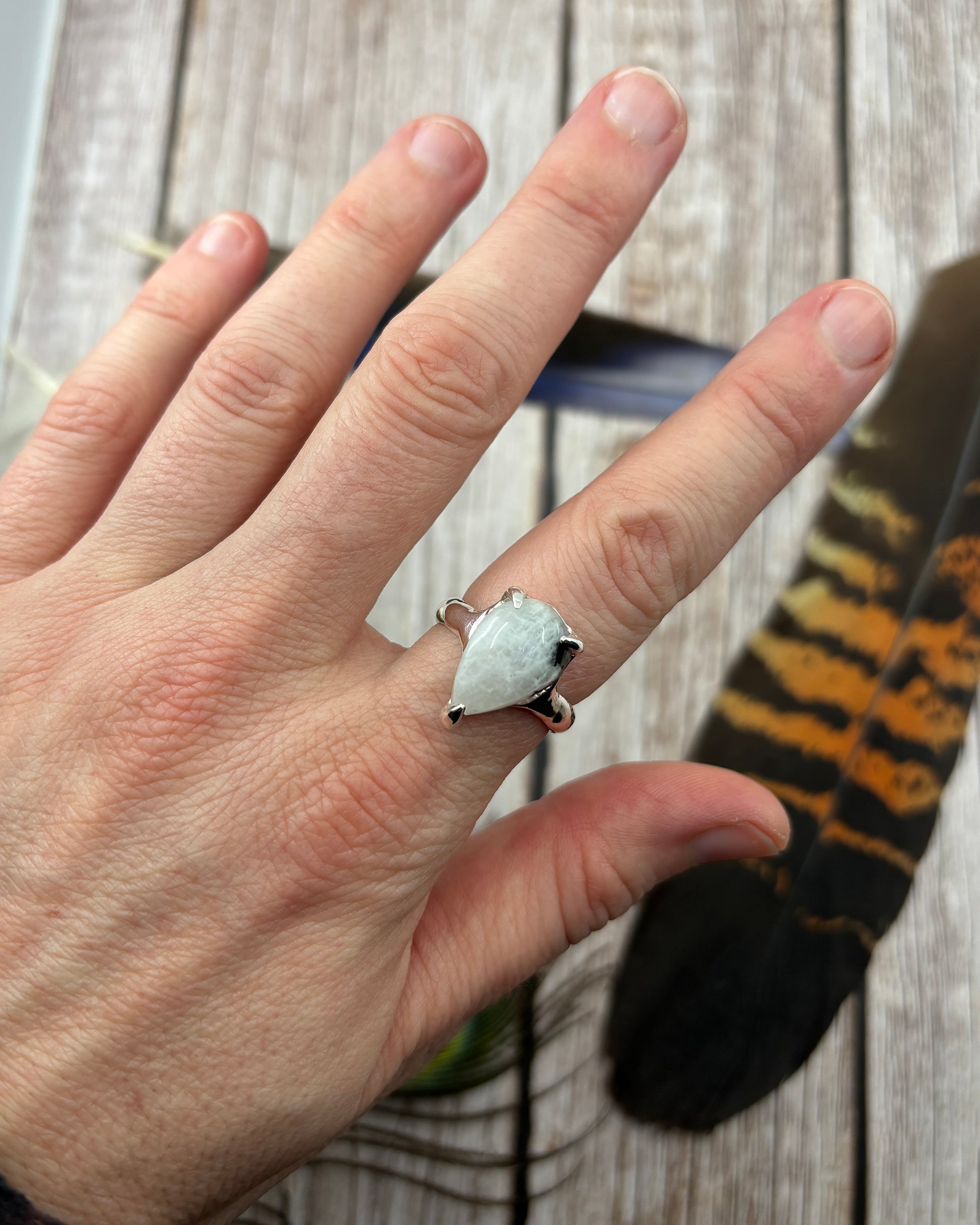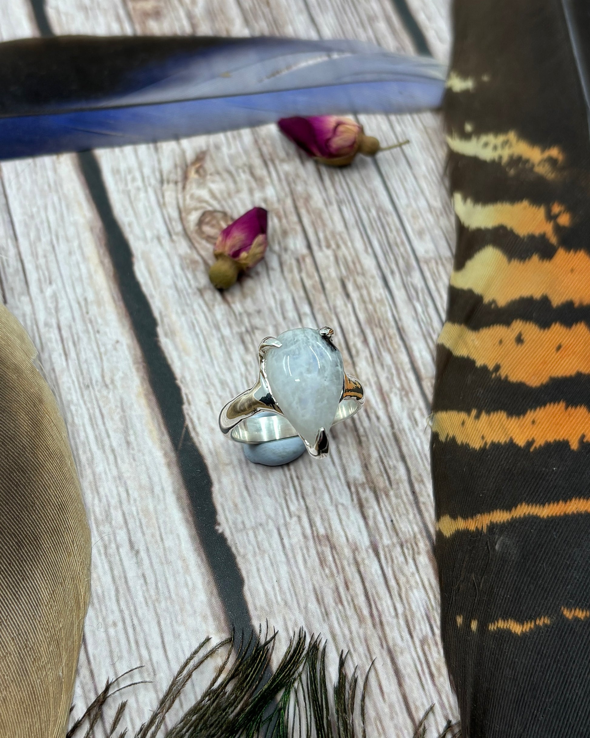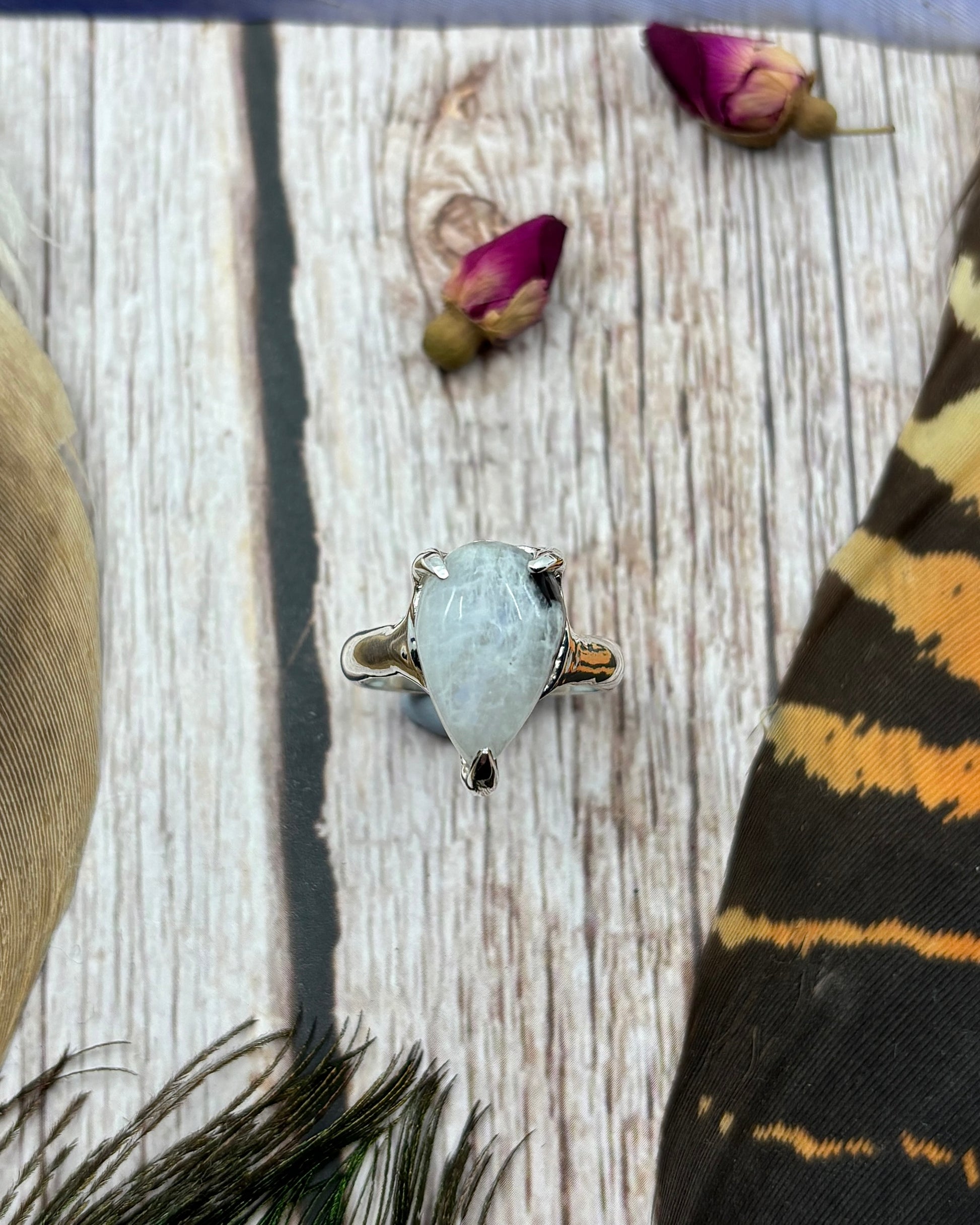 This Sterling Silver Rainbow Moonstone Ring (minimal flash, see video) has been hand sculpted using the lost wax jewellery method & cast in solid sterling silver.