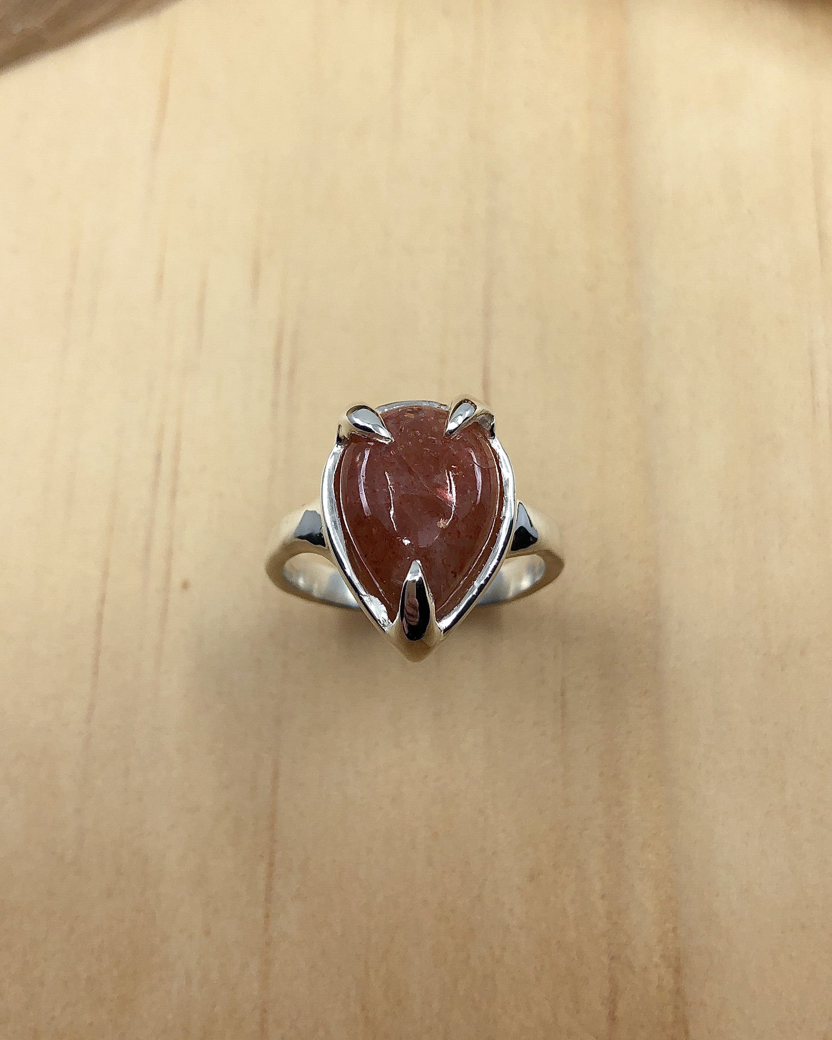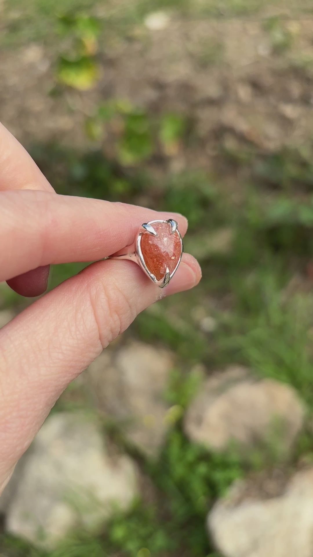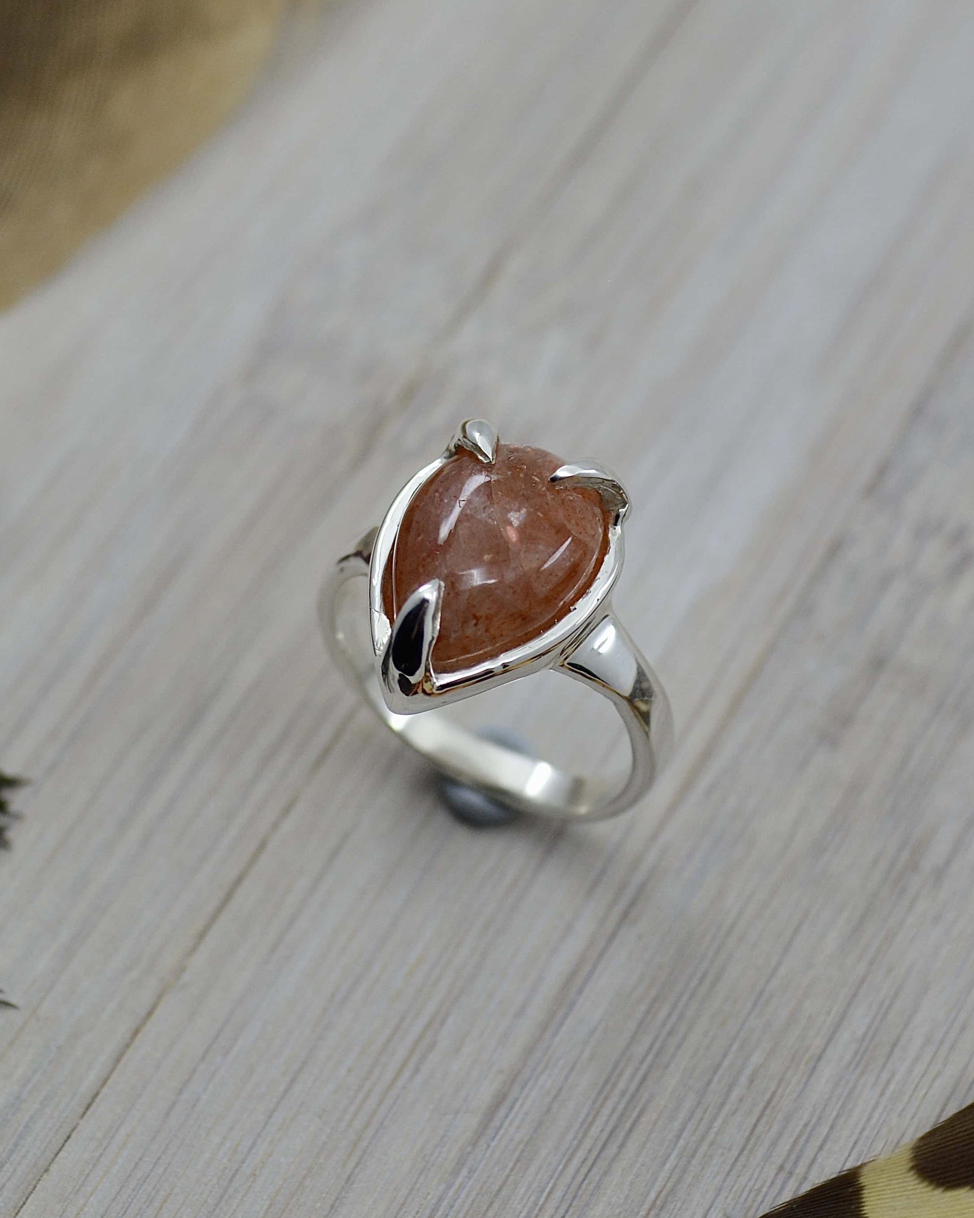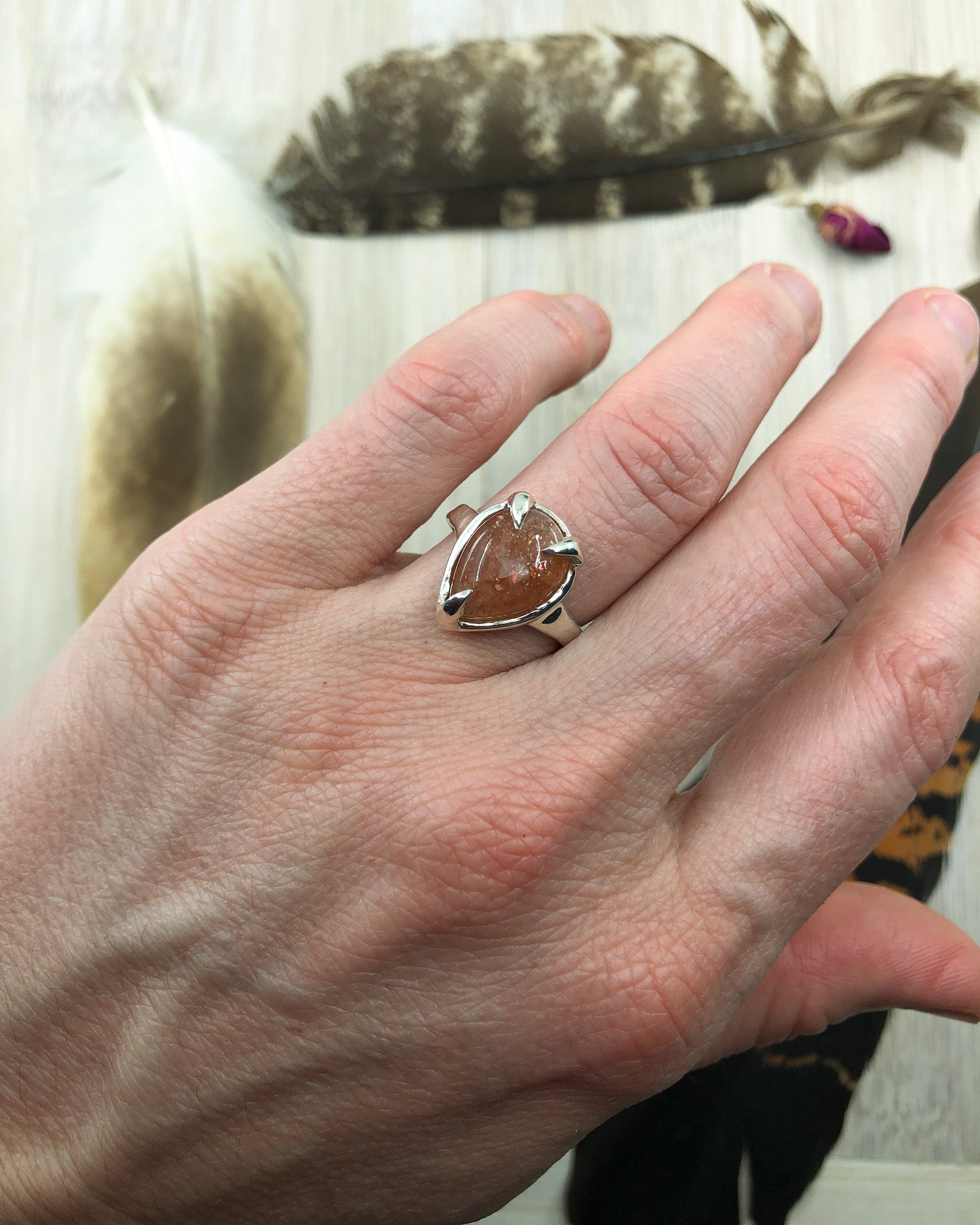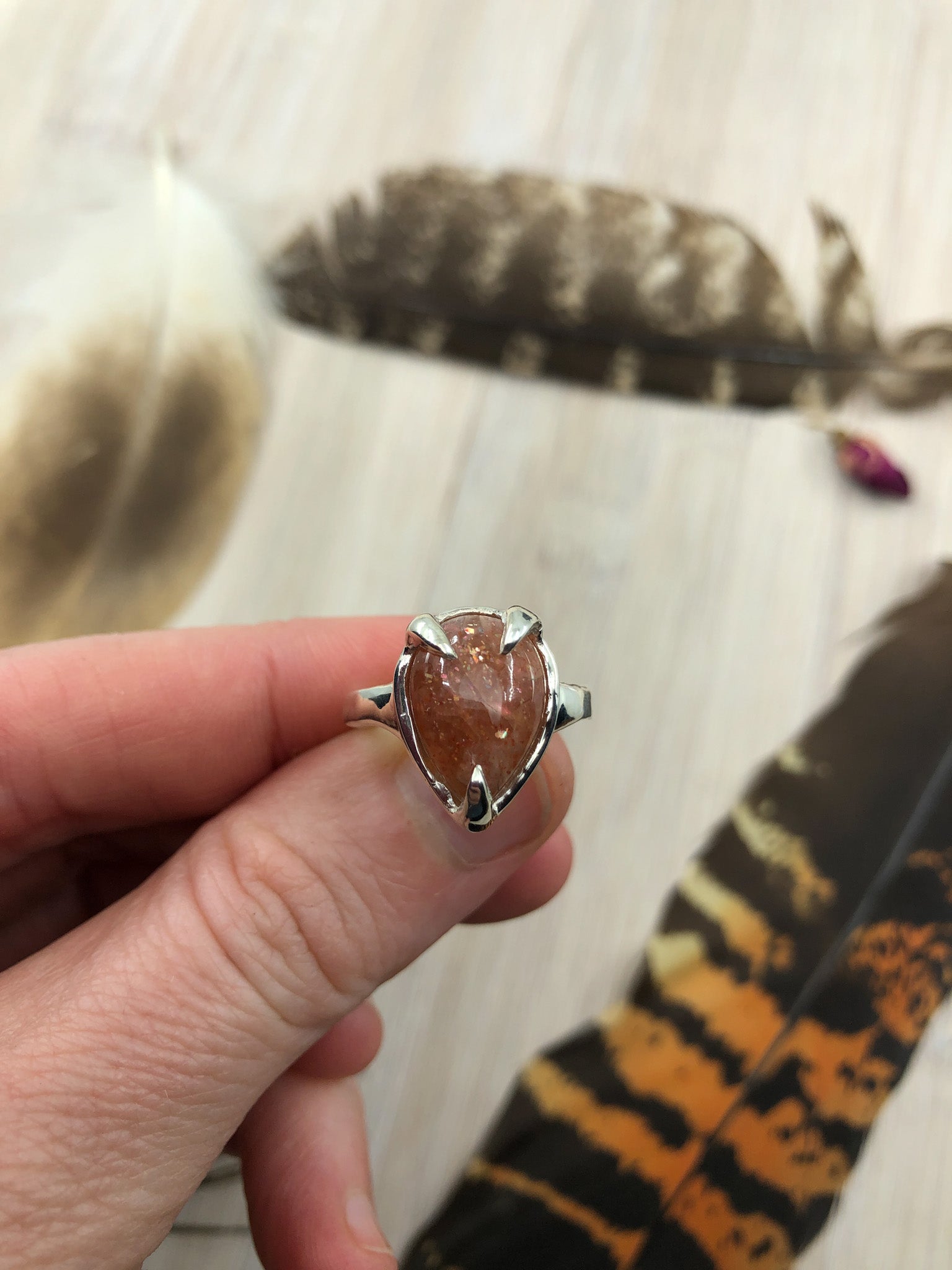 This Sterling Silver Sunstone Ring has been hand sculpted using the lost wax jewellery method & cast in solid sterling silver. It was created with the intention of a slight "wobble" effect on the band, giving its unique look. The Sunstone is a teardrop / pear shape.