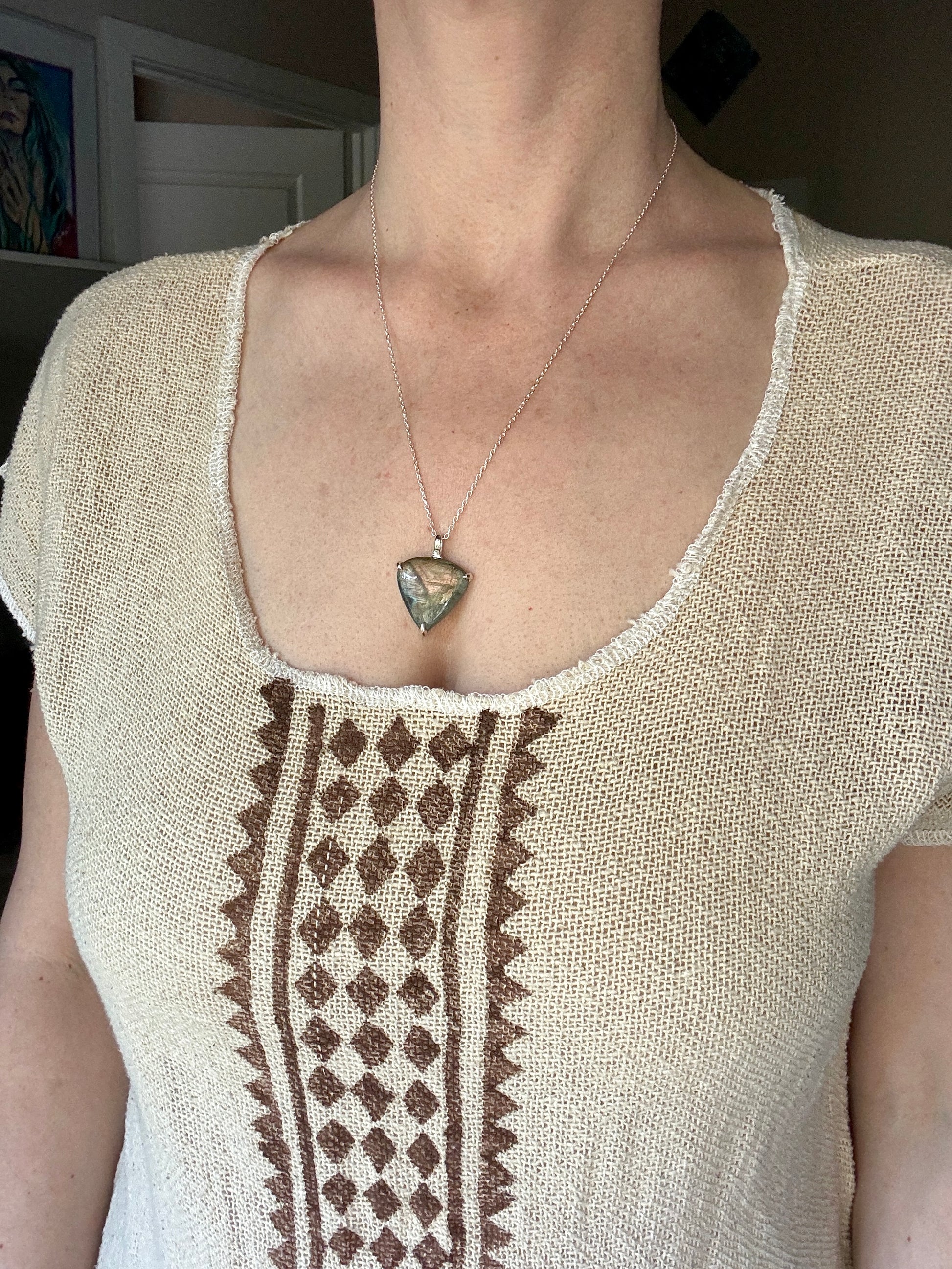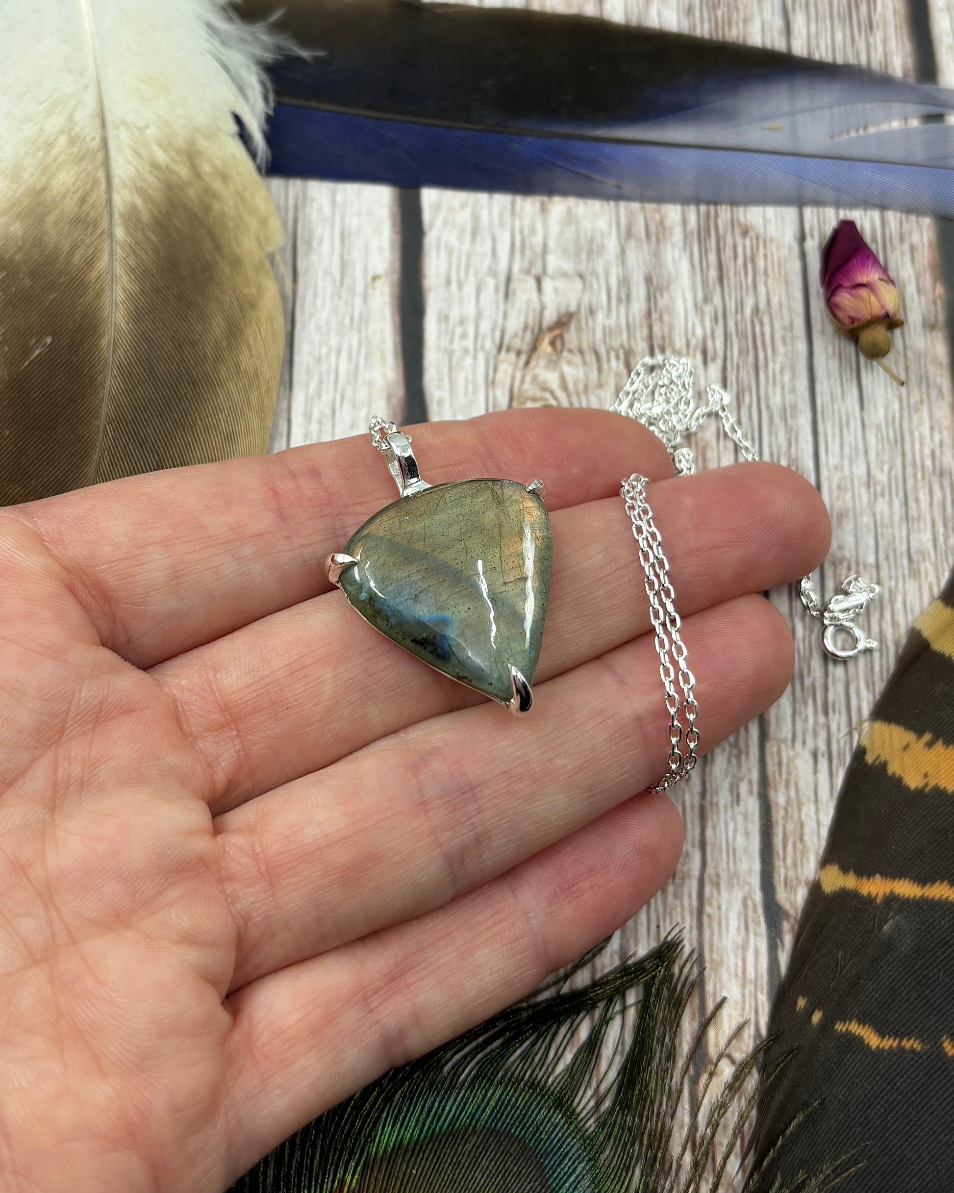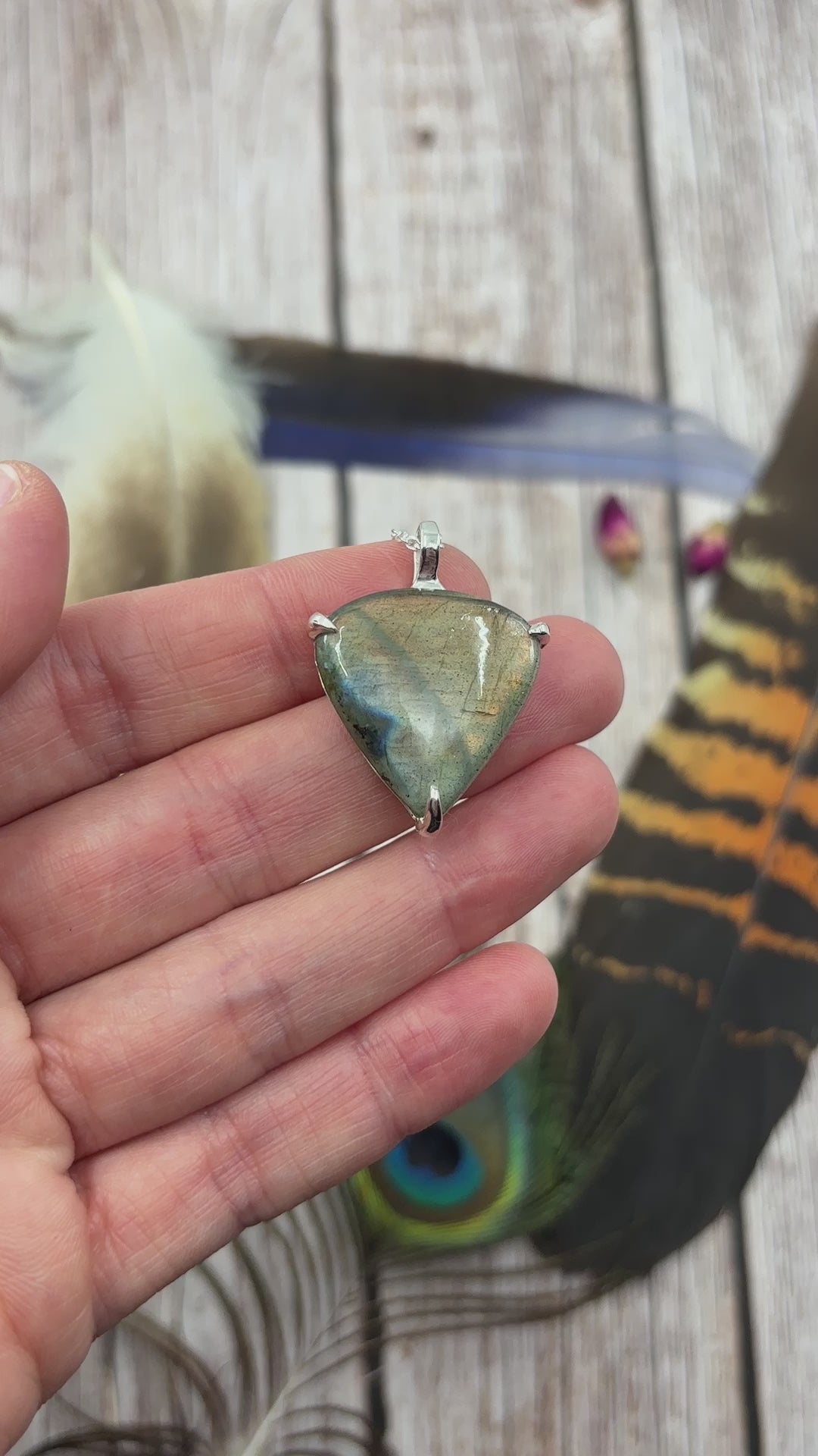 This Sterling Silver Triangle Labradorite Pendant has been hand sculpted using the lost wax jewellery method & cast in solid sterling silver.
