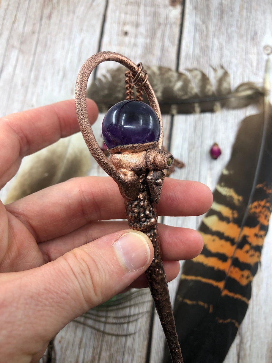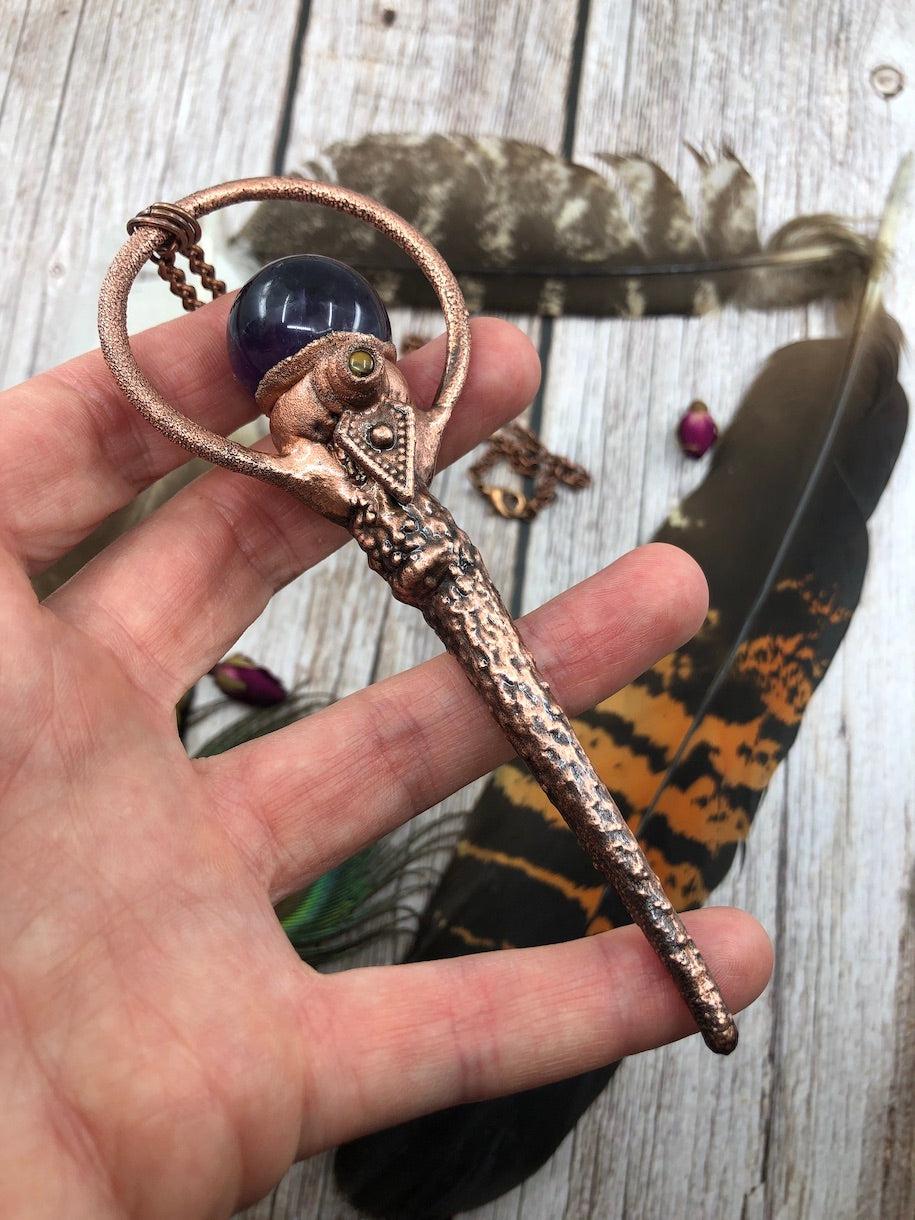 This tree twig pendant features a beautiful Amethyst Crystal Ball / Tiger Eye & a REAL Tree Spike from my neighbourhood, which have been copper plated using the art of electroforming. Please be aware that extra care must be taken with any piece featuring organic materials such as leaves, sticks, flowers etc, please do not bend & always handle with care